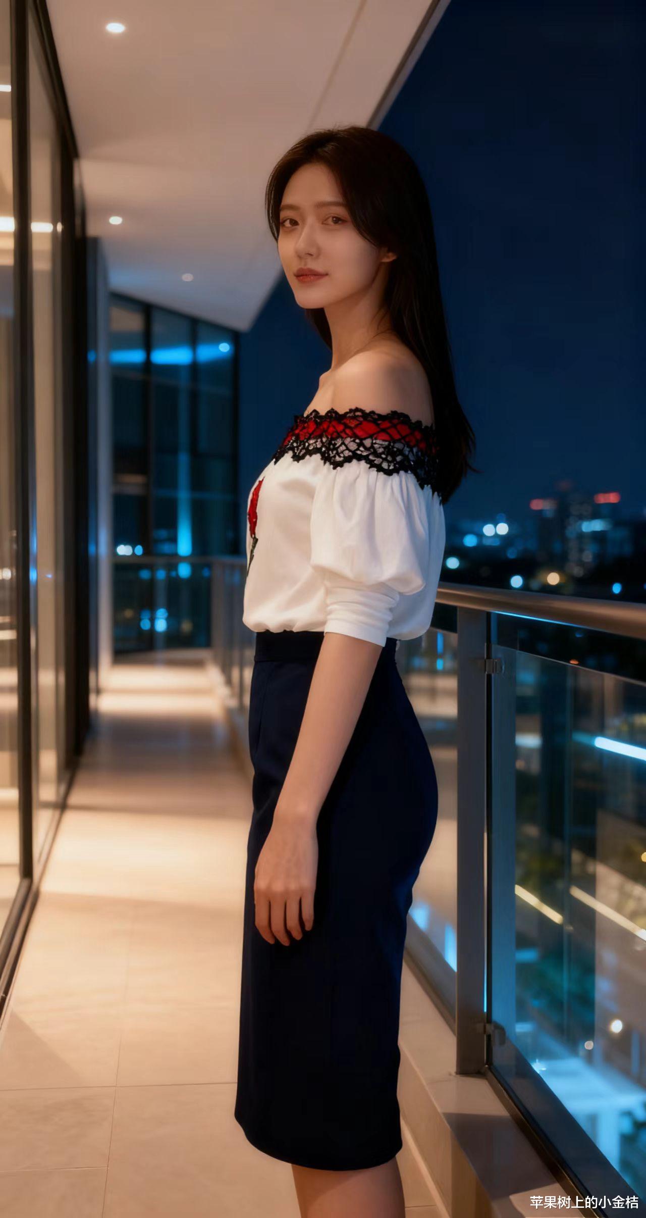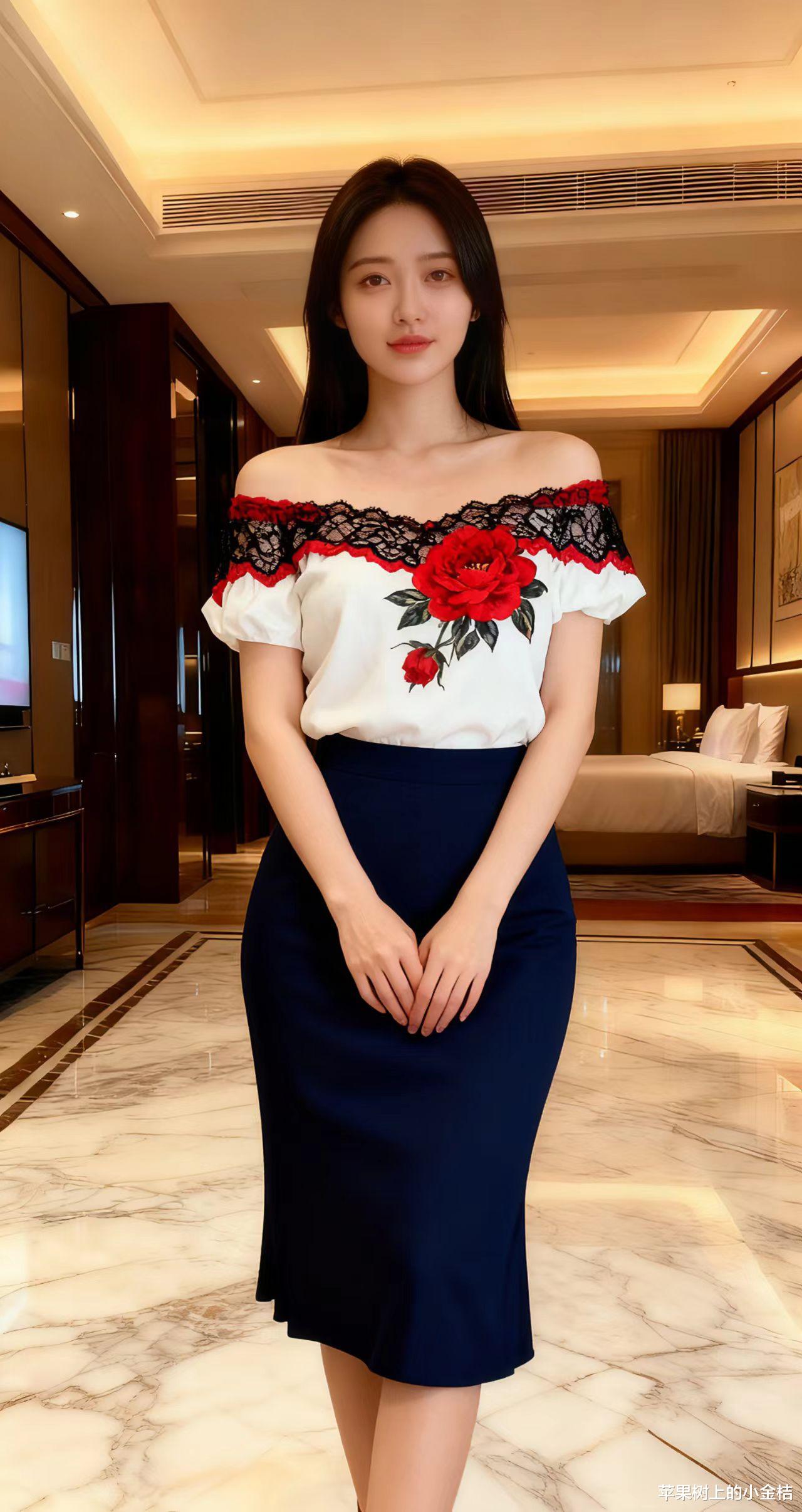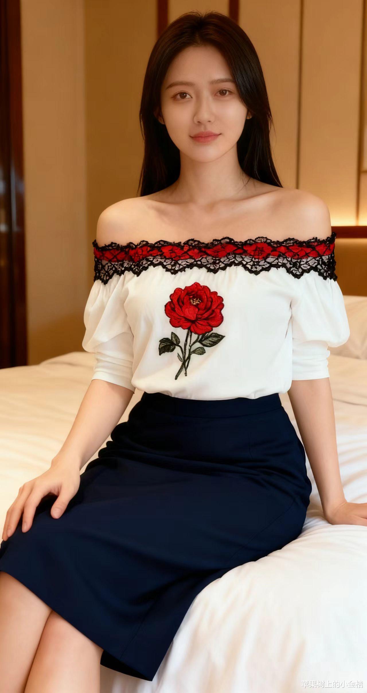简约上衣,大朵花设计,搭配黑色修身裙,时尚优雅。