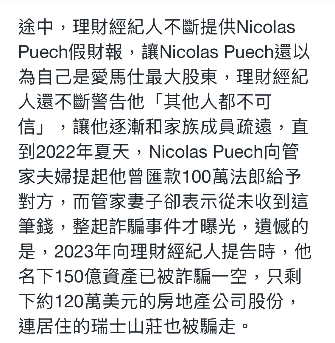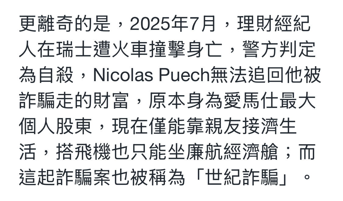 顶级有钱人这么好骗的吗?!爱马仕继承人被骗走150亿美金,也就是1000亿rmb现在爱马仕继承人只能靠着亲友的接济生活,出门坐廉航。而且,骗他钱的人还离奇自鲨了,所以爱马仕继承人也无法追回被骗走的巨额财产。