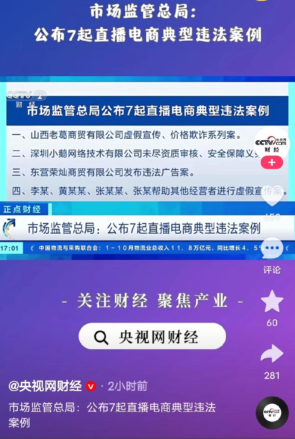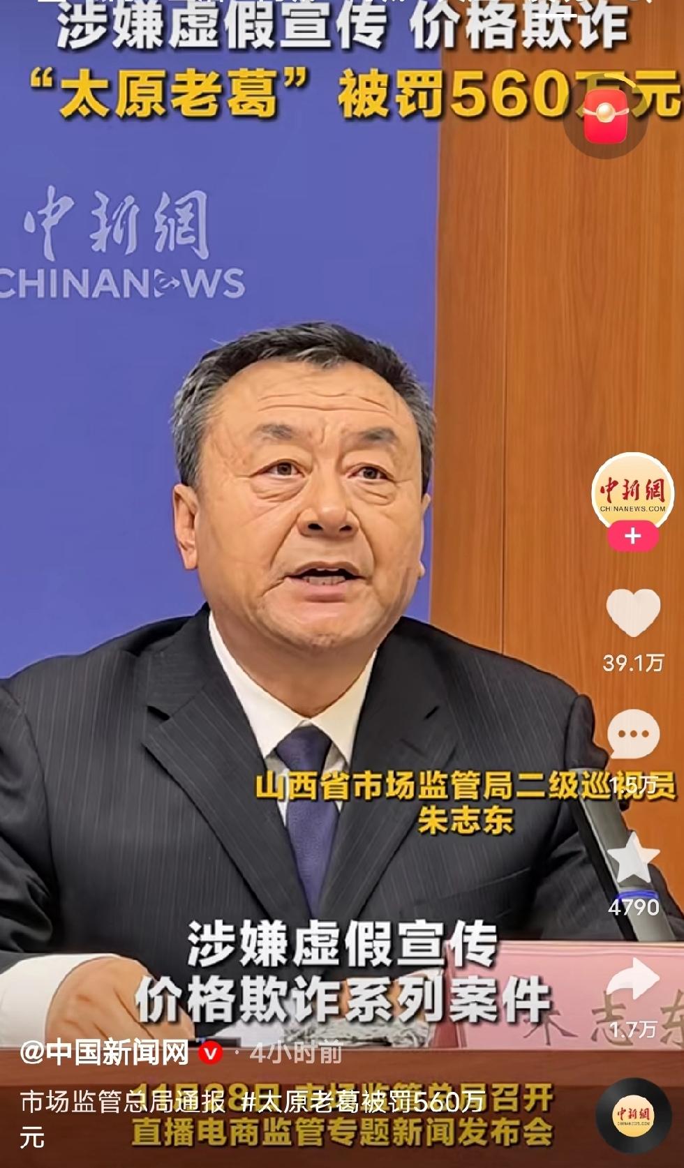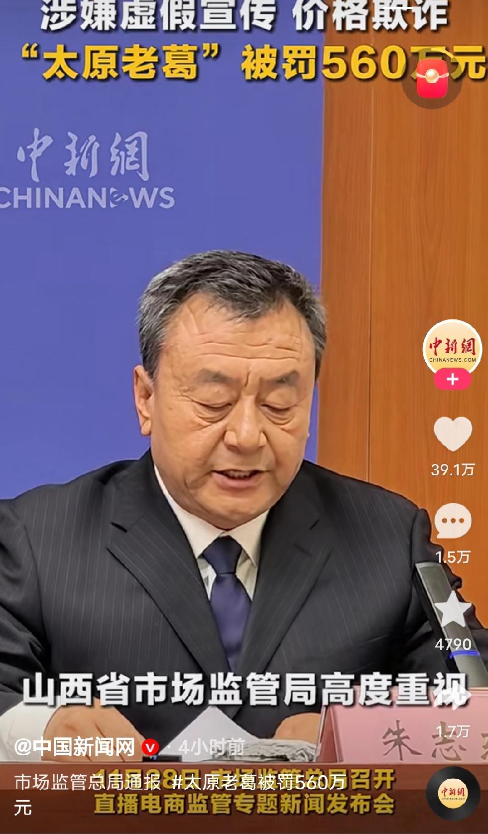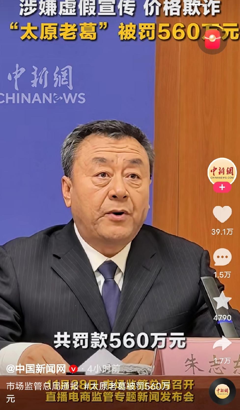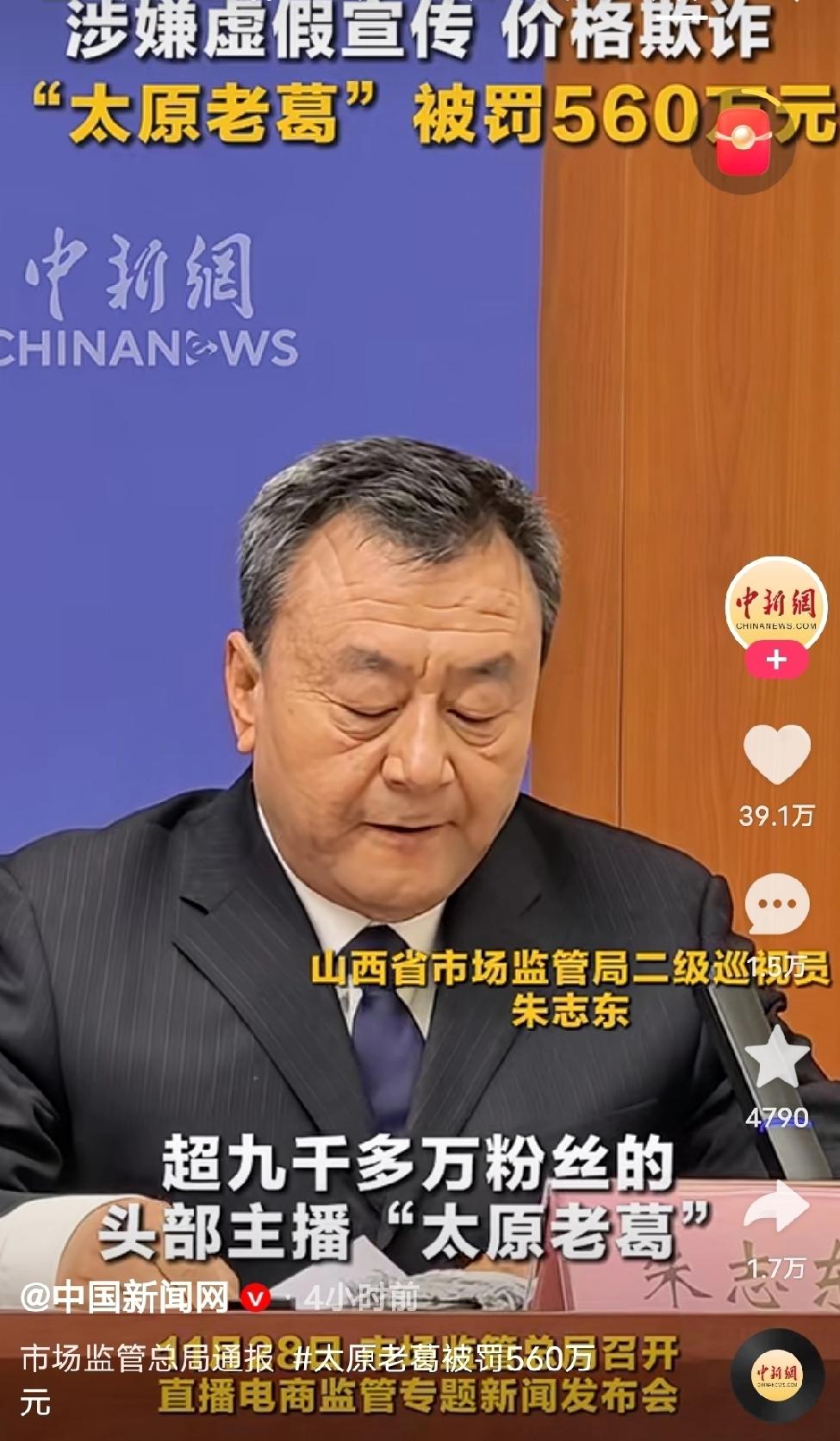 据央视网财经、中国新闻网等报道,11月28日,市场监管总局召开新闻发布会,公布了7起直播电商典型违法案例。 平台拥有9000多万粉丝的“太原老葛”,因为虚假宣传、价格欺诈被罚款560万元。 山西省市场监管局高度重视,“太原老葛”网络消费舆情,第一时间对相关直播间进行跟踪监测,对属地市场监管部门进行工作指导。这也说明一个问题,似乎地方执法部门,针对大主播的监管执法,特别谨慎。没有上级指导,不敢随意办理。执法应该一视同仁,希望执法部门有能力透过监督,监管,营造一个公平,有序,真诚的网络电商环境。