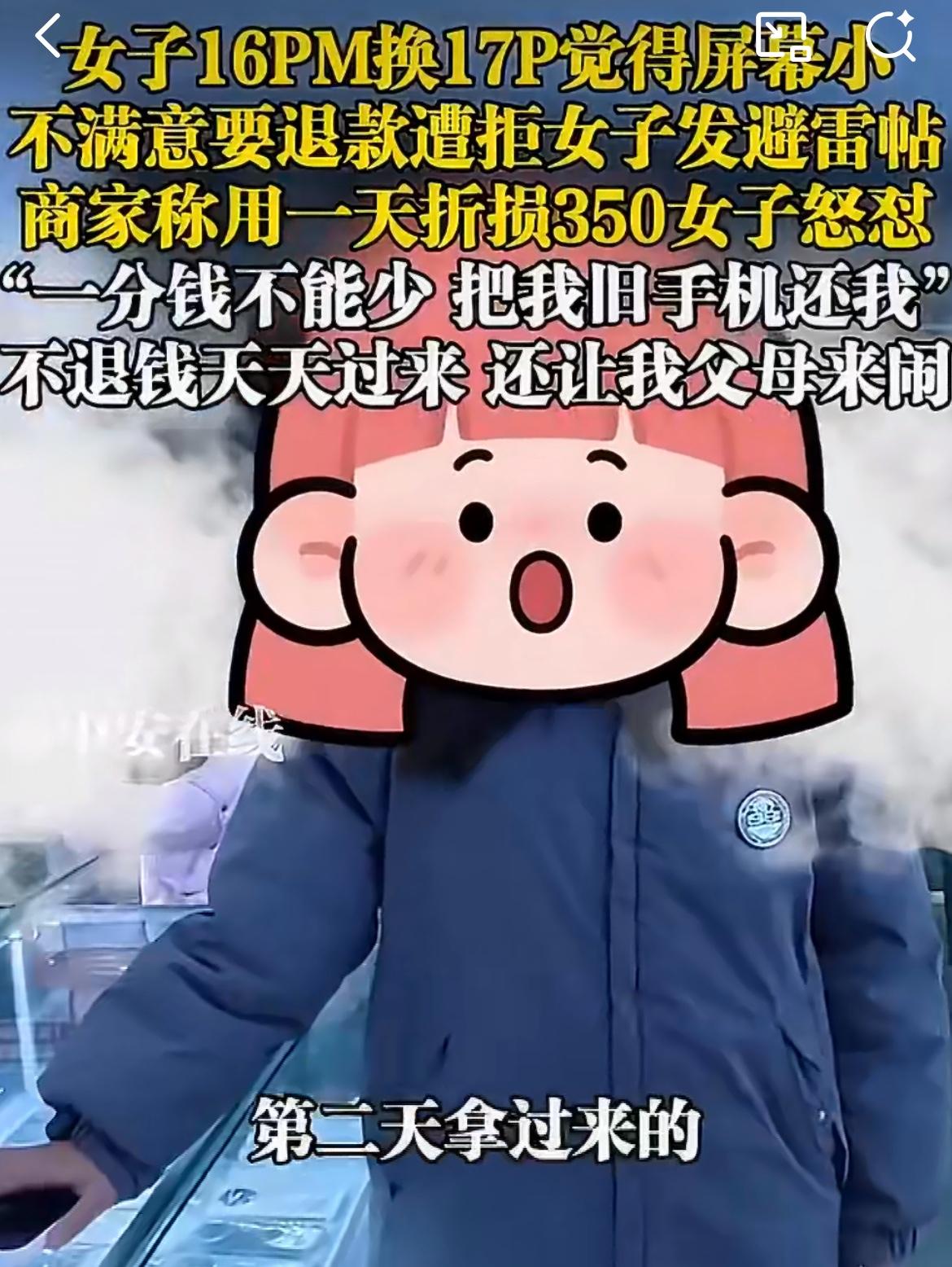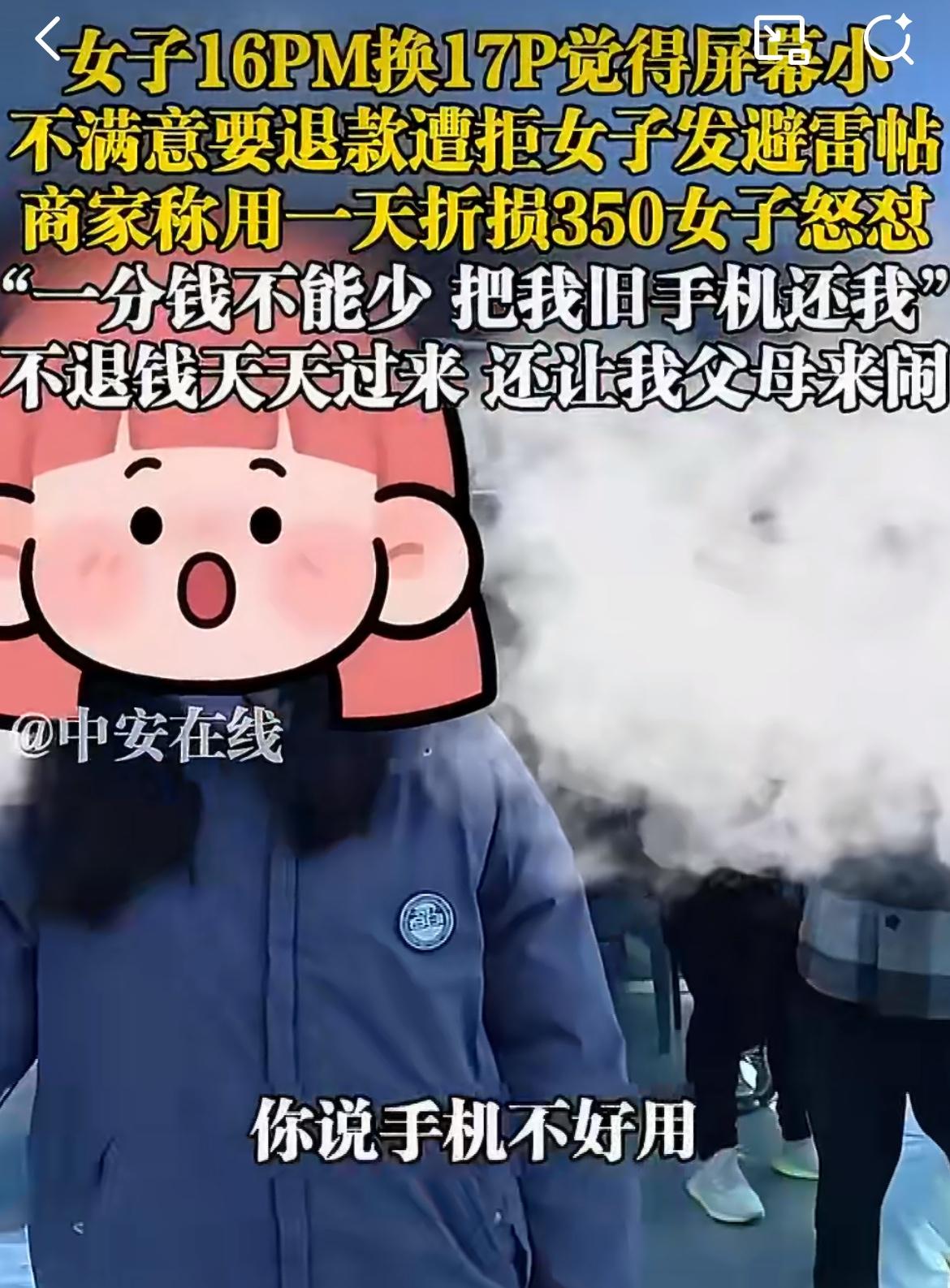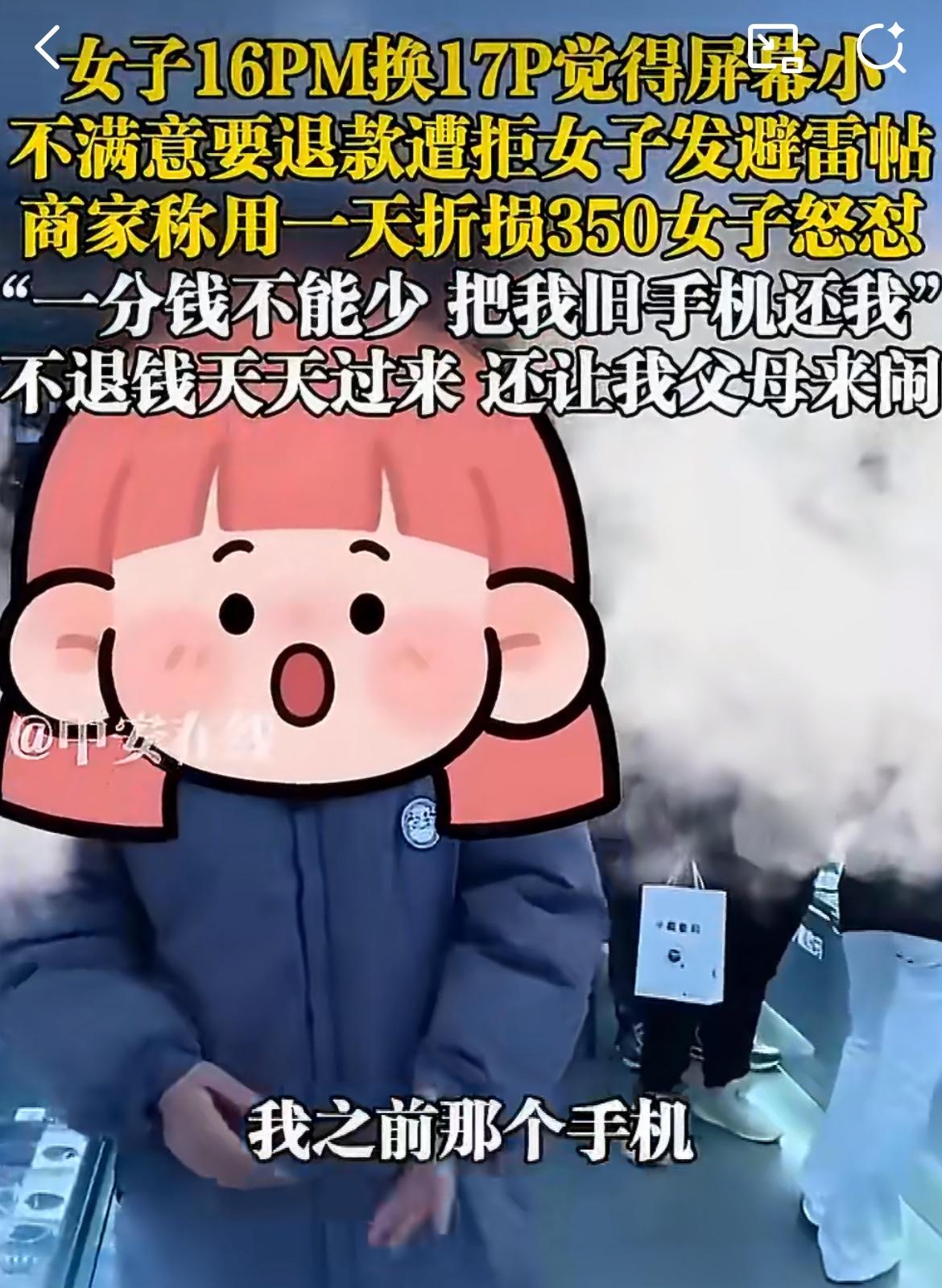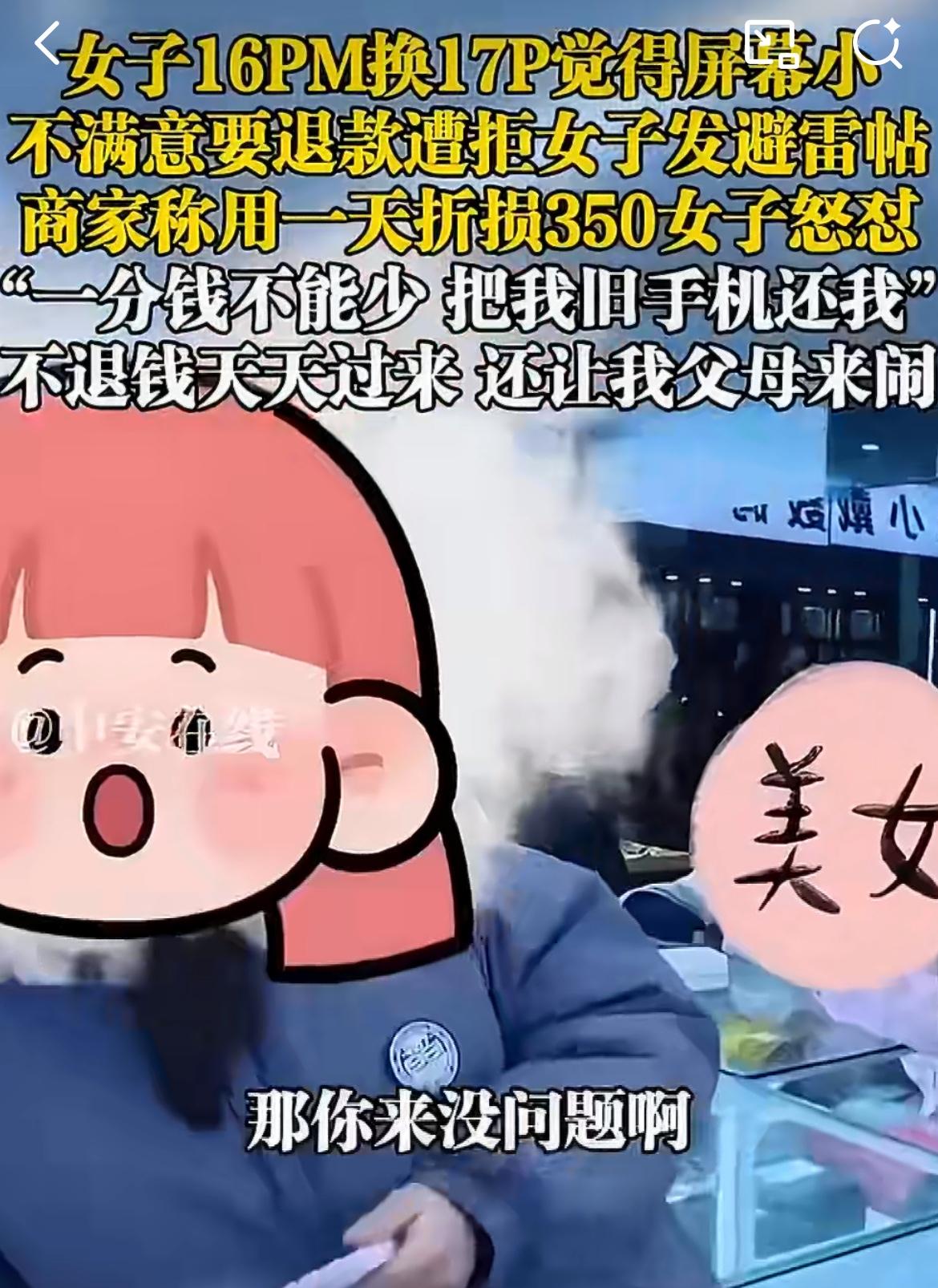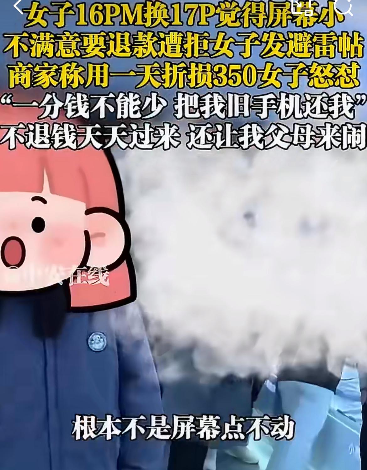 小仙女以旧换新苹果17手机,用了一天要退货,老板不同意,小仙女破防,说要喊亲爹亲妈来闹。商家说,用折损350块,否则不给退,小仙女说不同意,要求把旧手机还给她,一分钱不会给。店老板说旧手机已经卖掉了,没法退。事发江苏某地。