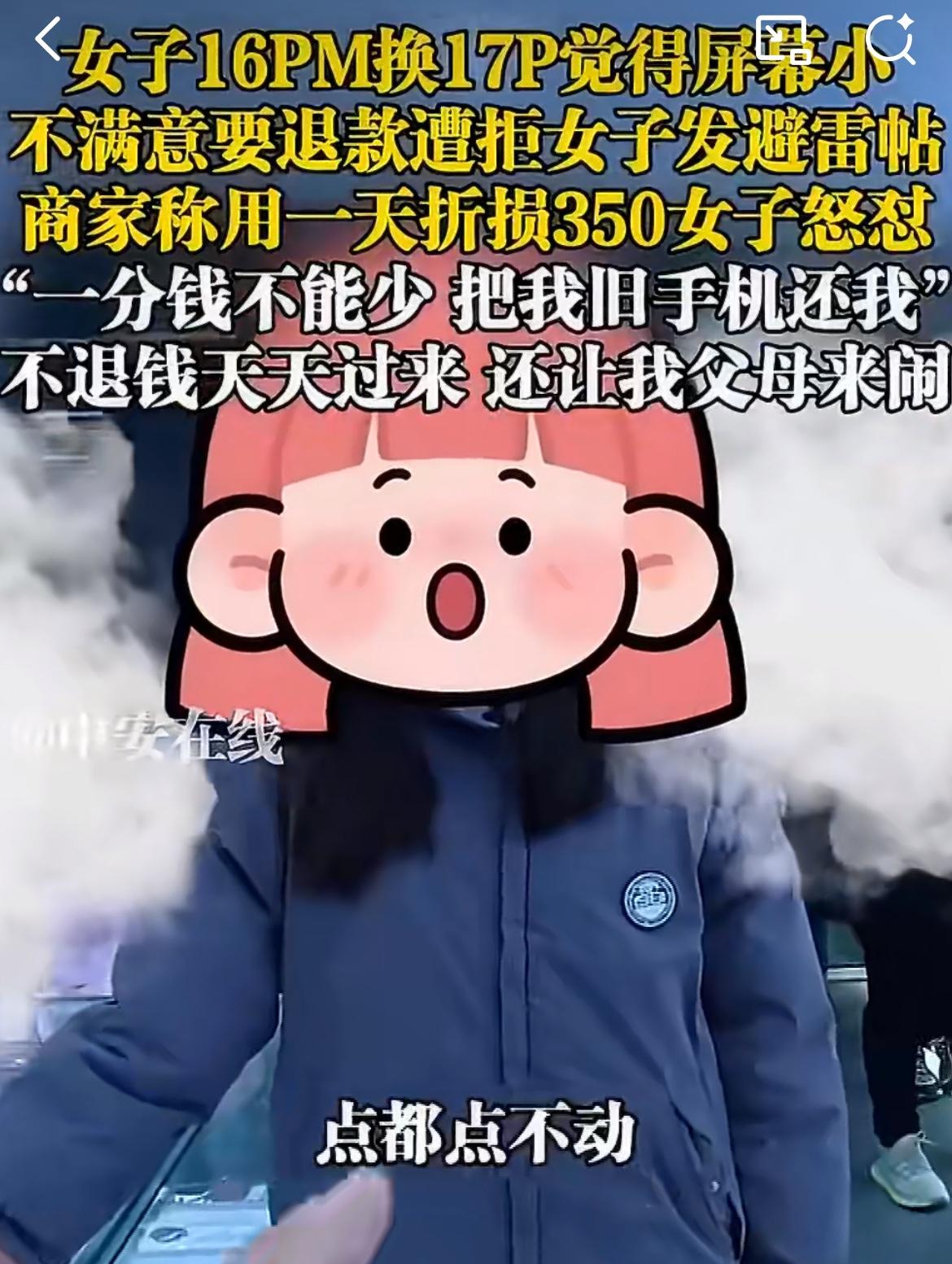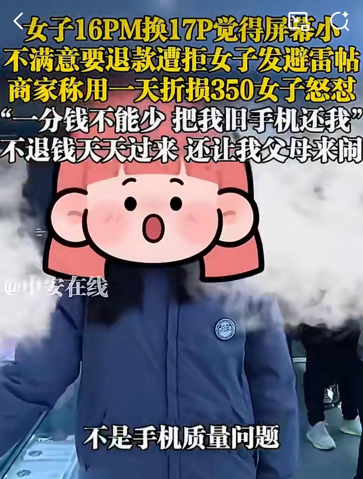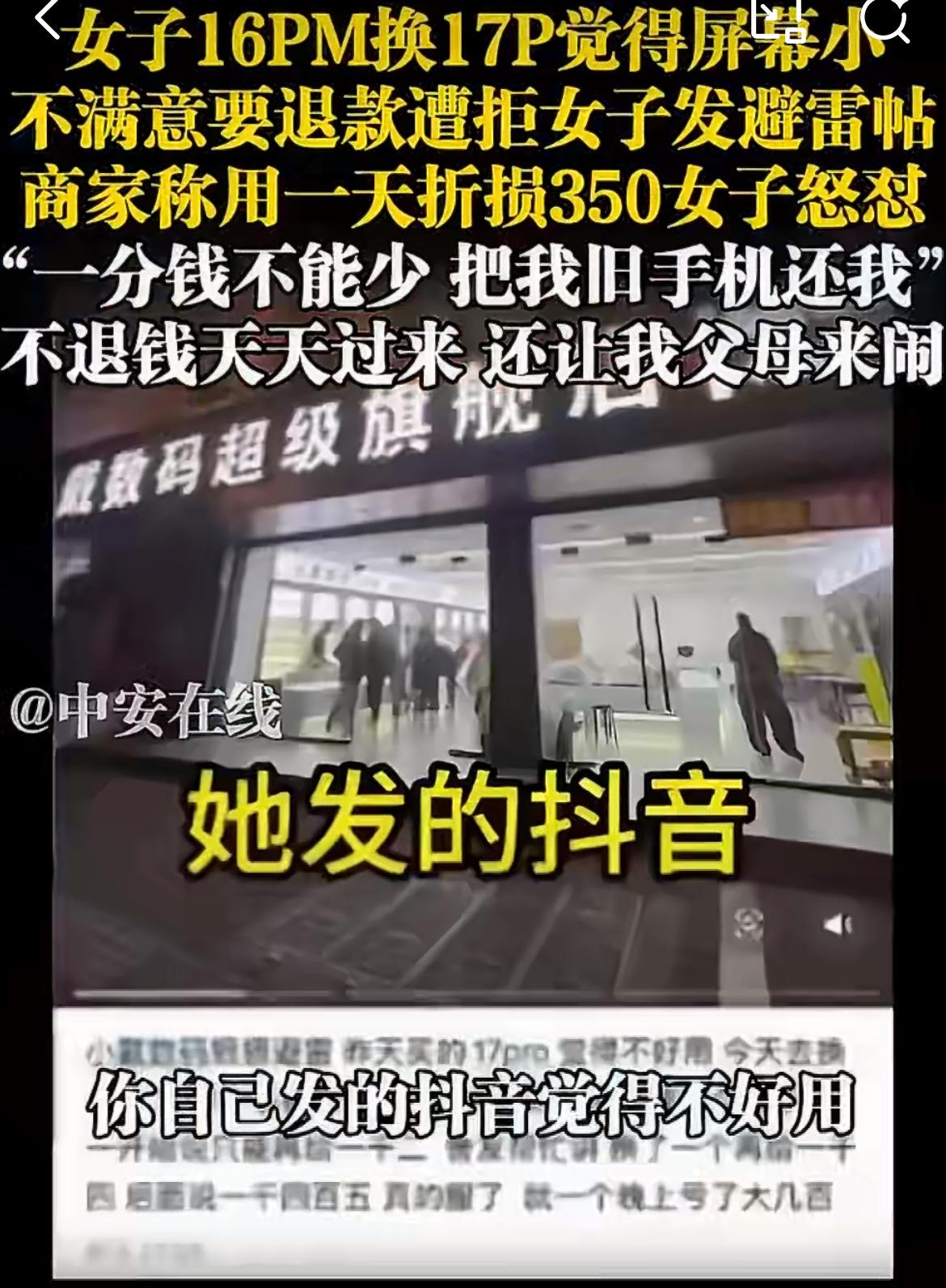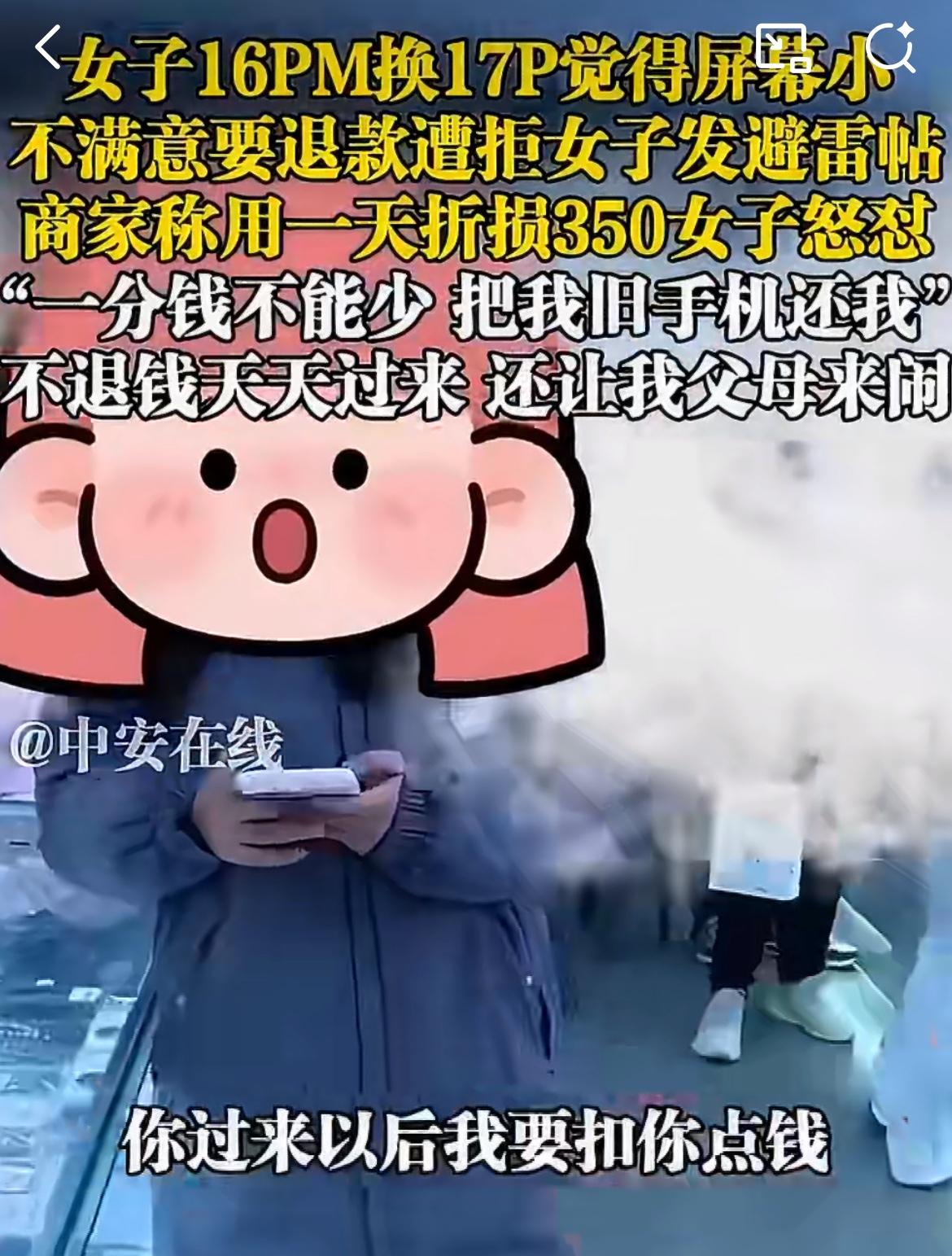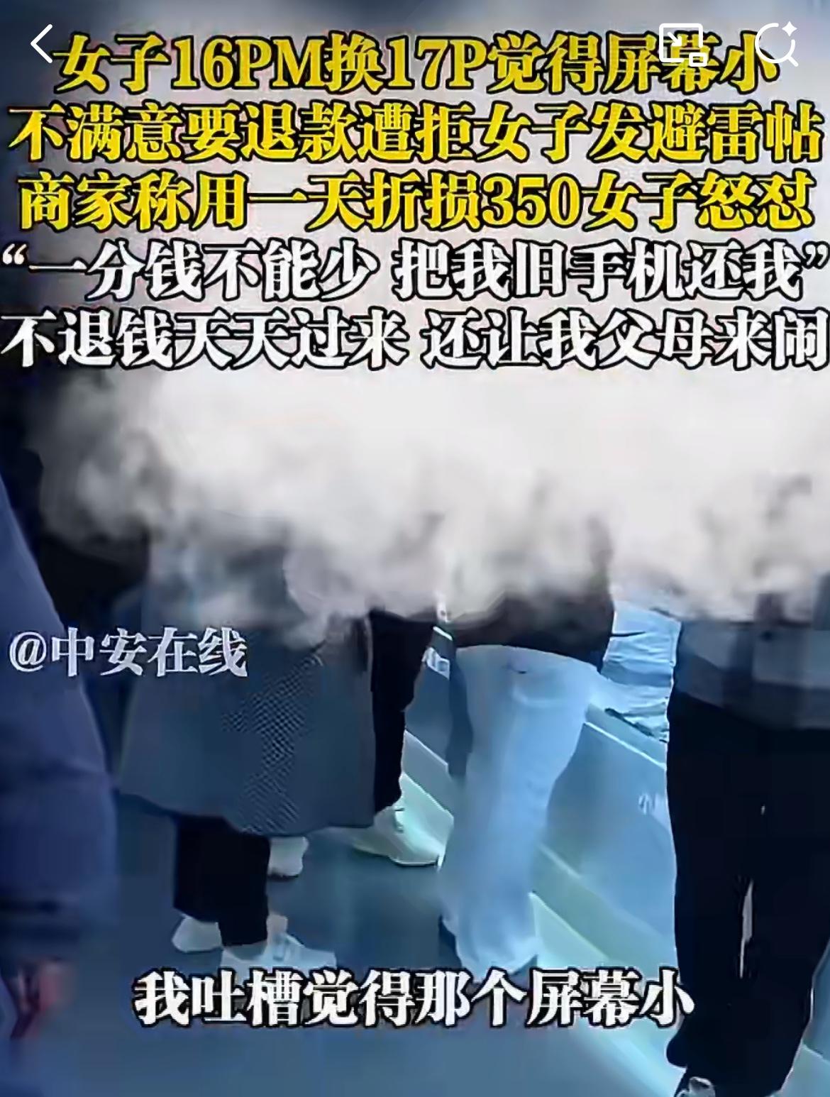 小仙女以旧换新苹果17手机,用了一天要退货,老板不同意,小仙女破防,说要喊亲爹亲妈来闹。商家说,用折损350块,否则不给退,小仙女说不同意,要求把旧手机还给她,一分钱不会给。店老板说旧手机已经卖掉了,没法退。事发江苏某地。