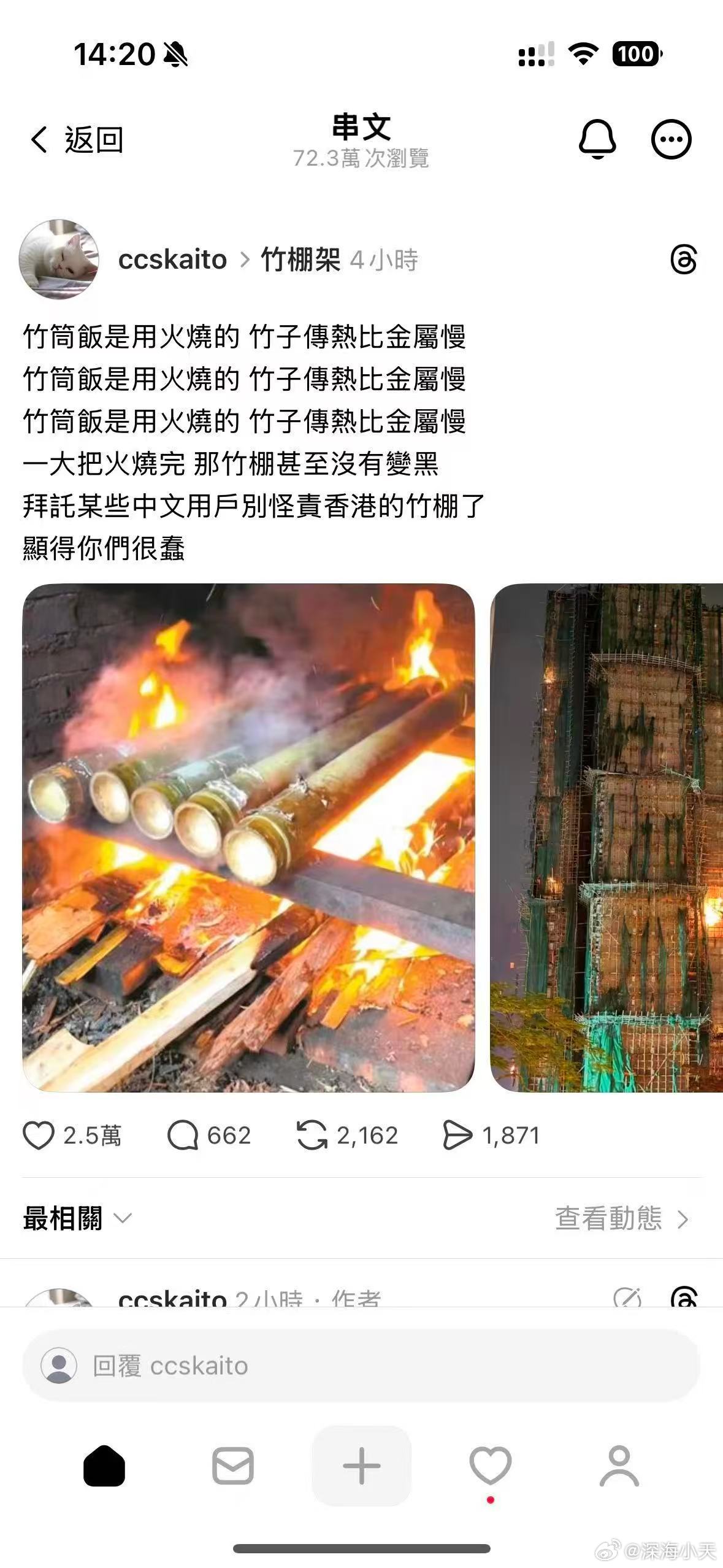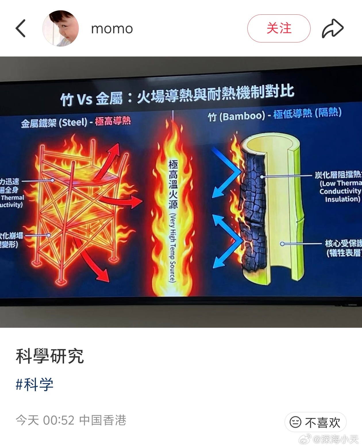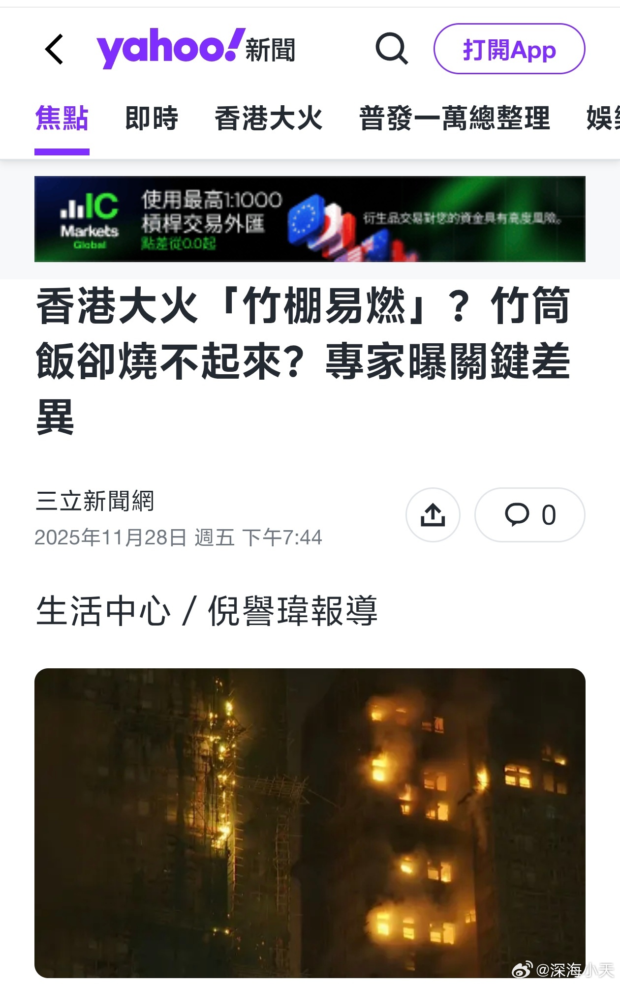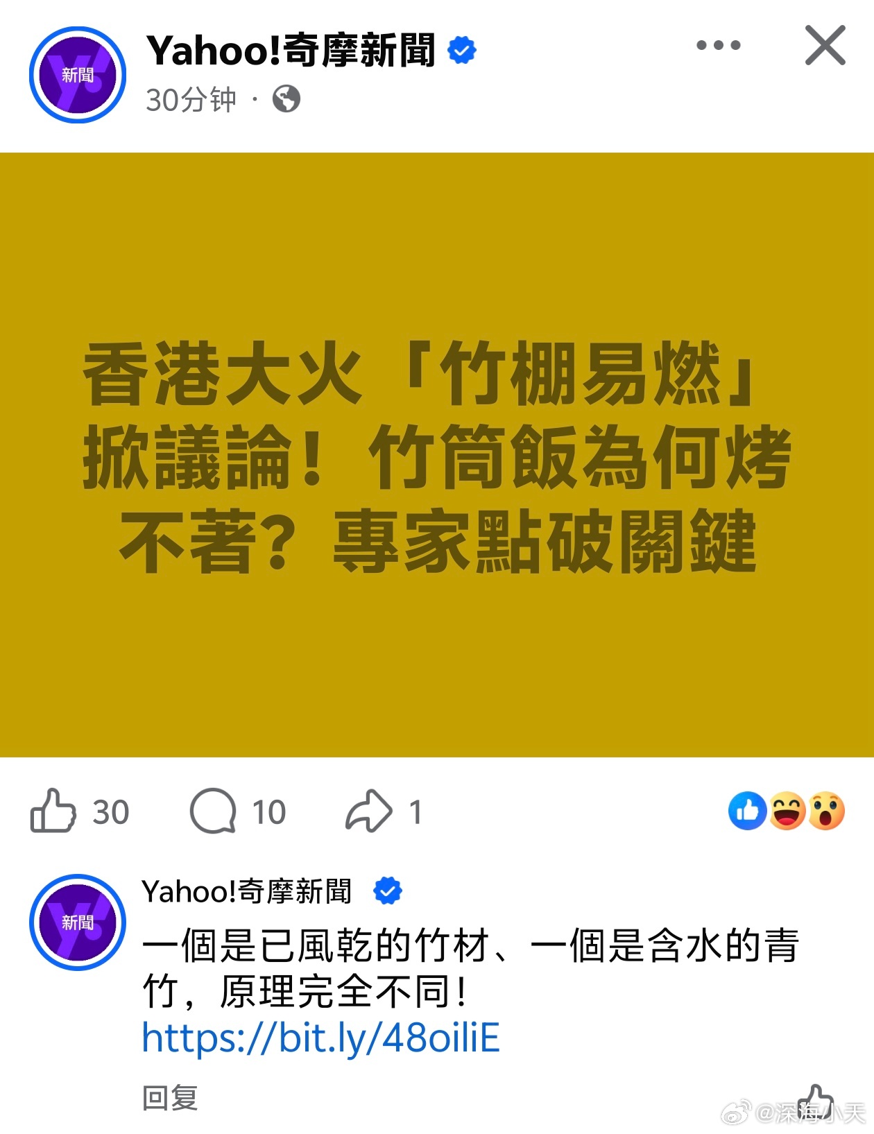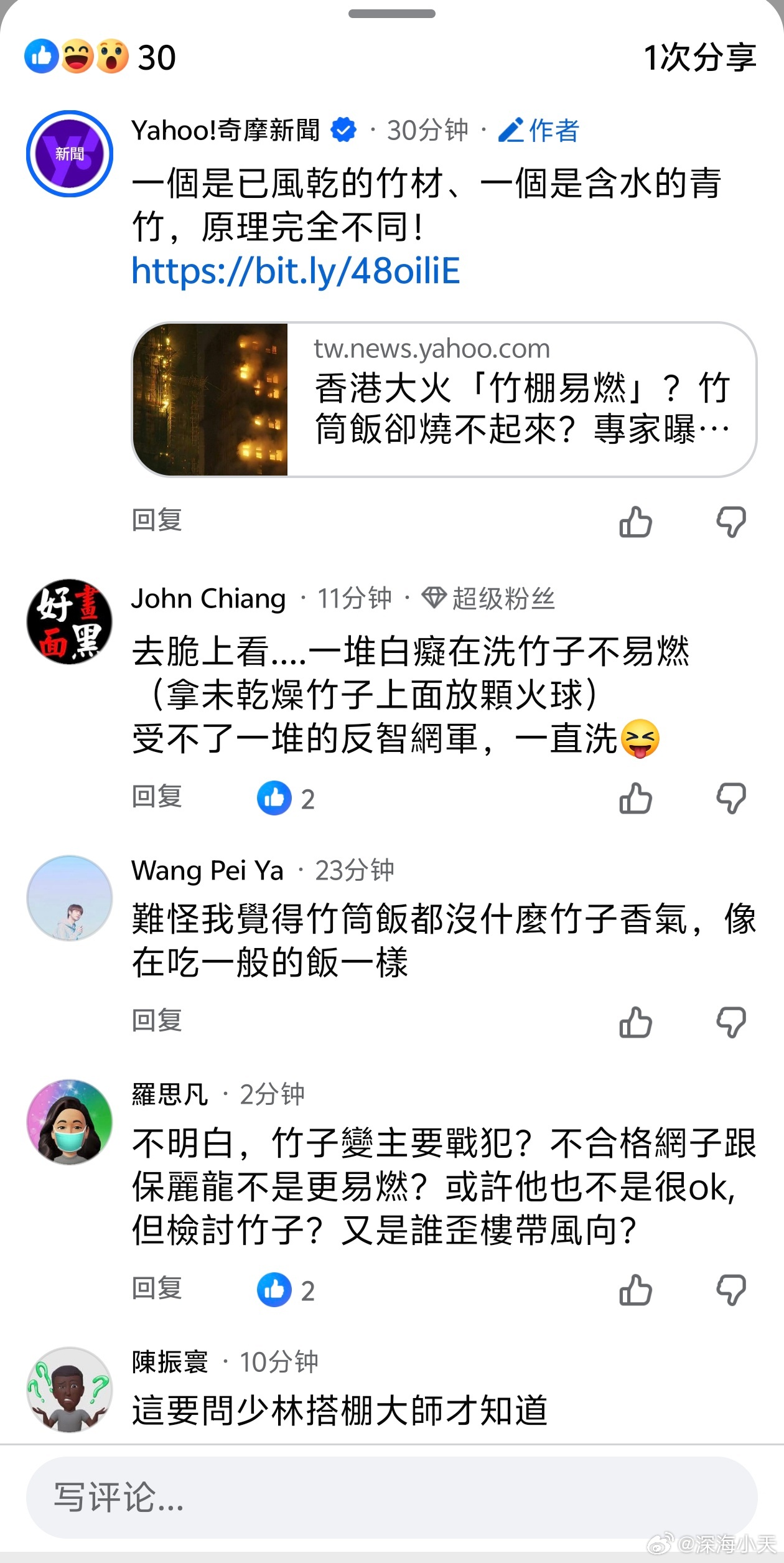 竟然沦落到要台媒来科普为什么竹筒饭烧不着,大家都是中国人,智商应该都一样,只能怀疑香港的基础教育是不是出问题了奇摩新闻:香港宏福苑大火造成破百人死亡,当地社群有不少声音,将火势猛烈燃烧归咎于「竹棚」,竹材成为网路讨论焦点。关于可燃性的部分,专家表示,用来搭棚架的竹子相当干燥,香港也正处于干季,确实容易烧起来,但外围的网子不防火也是问题。而竹筒饭同样是用火烤,为何不会起火?主因是「水分」,竹筒饭采用含水的青竹,水分须烧干才会起火;加上烧烤时筒内有水,可吸收热量避免整个竹筒达到燃点温度。台湾网红馆长向香港捐款100万香港大埔火灾已致128人遇难