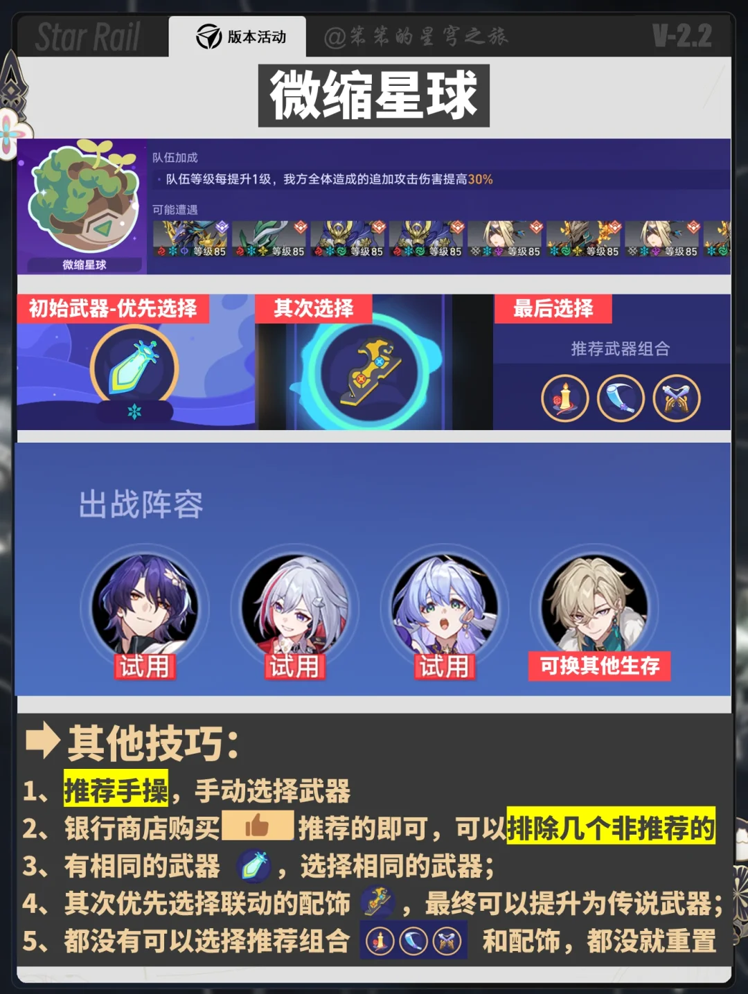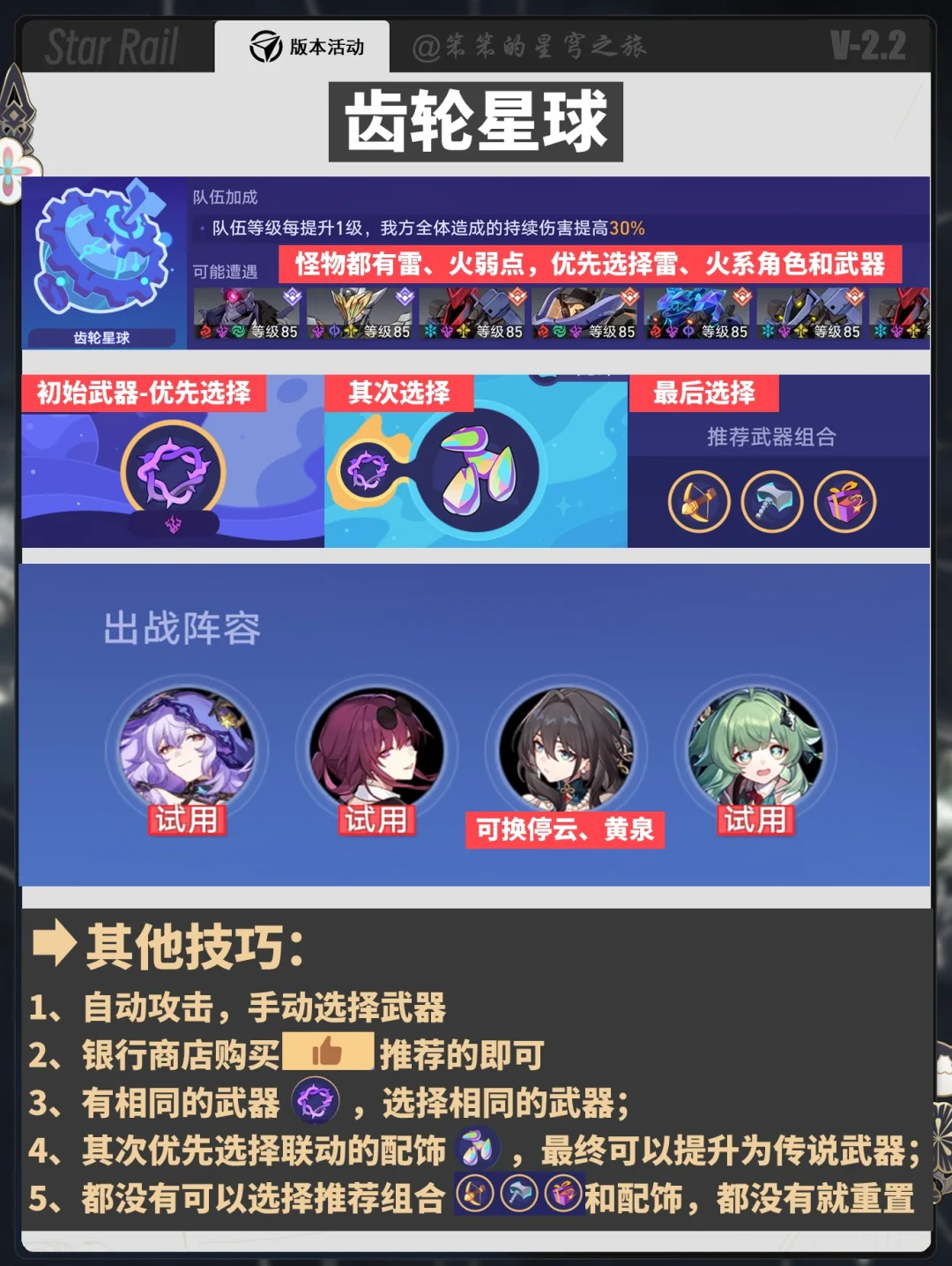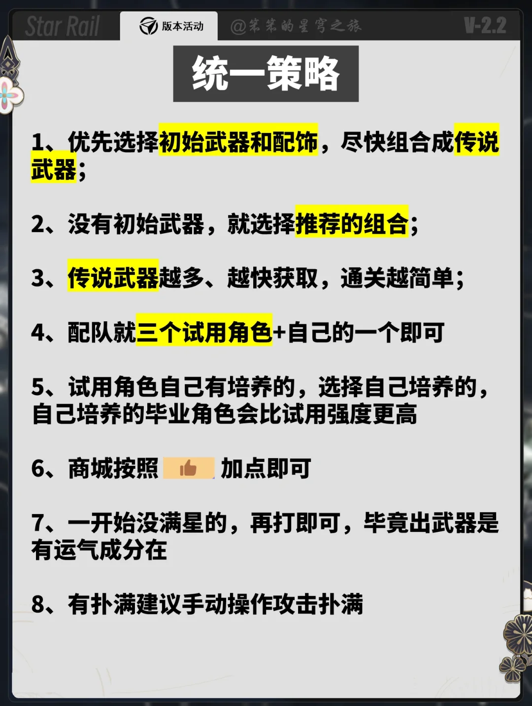 🐱大家好,我是笨笨的铲屎官 今天新上线的小活动「银河球棒侠」攻略来啦 活动还是很简单的,只要选对了武器即可 跟着笨笨的操作即可 以下几个通用技巧: 1、优先选择初始武器和配饰,尽快组合成传说武器; 2、没有初始武器,就选择推荐的组合; 3、传说武器越多、越快获取,通关越简单; 4、配队就三个试用角色+自己的一个即可 5、自己毕业的角色比试用角色练度会高 6、没满星可以多试几次,毕竟有运气成分 7、有扑满一定能让他逃了,手动操作