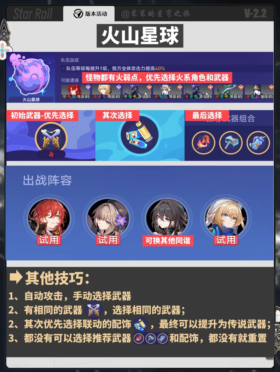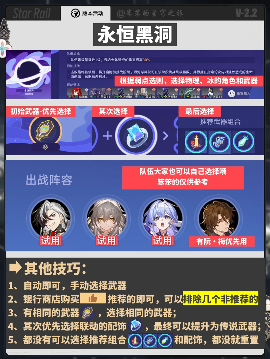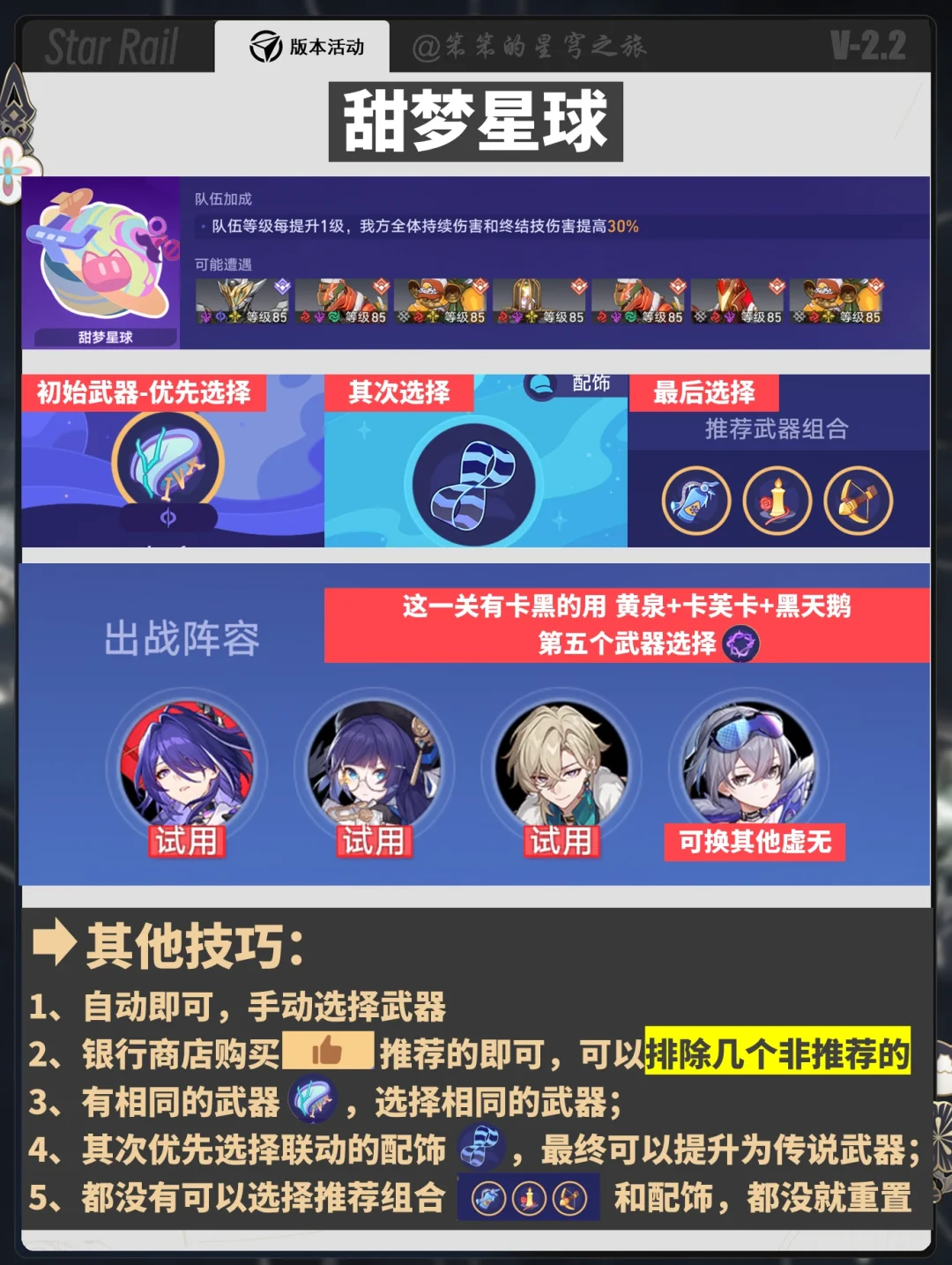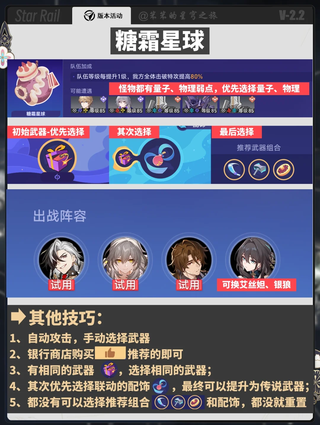 🐱大家好,我是笨笨的铲屎官 今天新上线的小活动「银河球棒侠」攻略来啦 活动还是很简单的,只要选对了武器即可 跟着笨笨的操作即可 以下几个通用技巧: 1、优先选择初始武器和配饰,尽快组合成传说武器; 2、没有初始武器,就选择推荐的组合; 3、传说武器越多、越快获取,通关越简单; 4、配队就三个试用角色+自己的一个即可 5、自己毕业的角色比试用角色练度会高 6、没满星可以多试几次,毕竟有运气成分 7、有扑满一定能让他逃了,手动操作