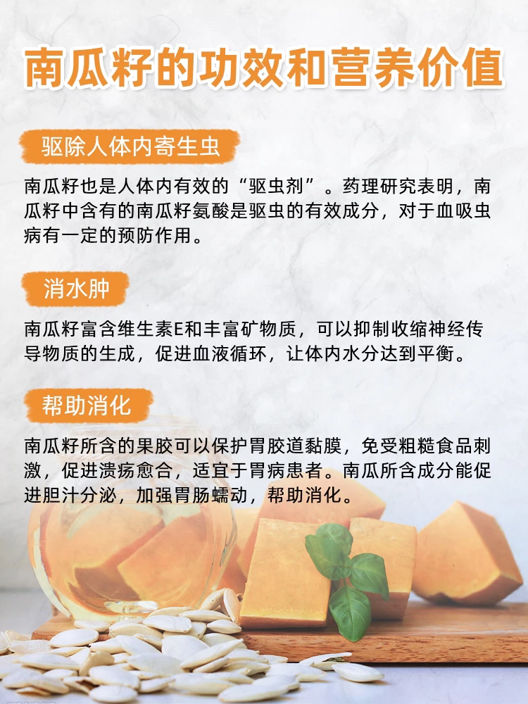 南瓜籽也是人体内有效的“驱虫剂”。药理研究表明,南瓜籽中含有的南瓜籽氨酸是驱虫的有效成分,对于血吸虫病有一定的预防作用。