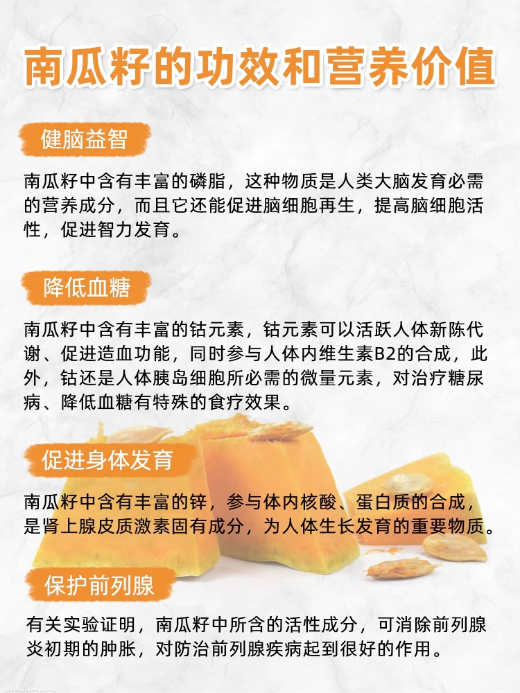 南瓜籽中含有丰富的锌,参与体内核酸、蛋白质的合成,是肾上腺皮质激素的固有成分,为人体生长发育的重要物质。