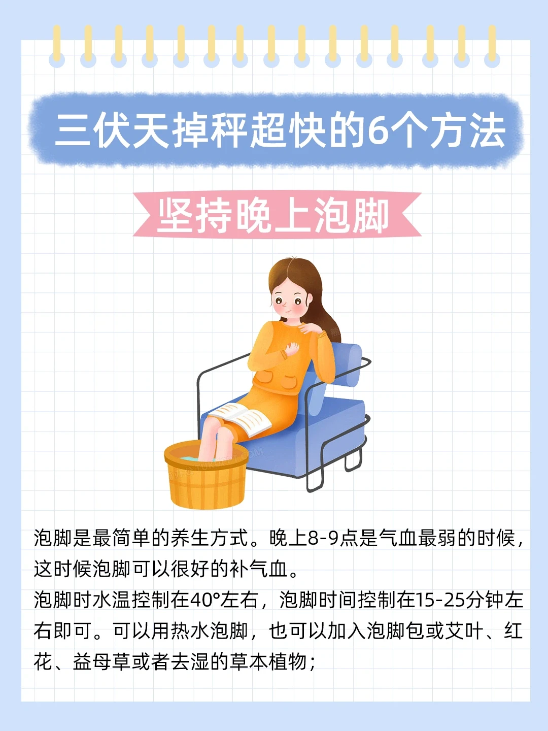 泡脚是最简单的养生方式。晚上8-9点是气血最弱的时候,这时候泡脚可以很好的补气血学,泡脚时水温控制在40°左右,泡脚时间控制在15-25分钟左右即可。可以用热水泡脚,也可以加入泡脚包或艾叶、红花、益母草或者去湿的草本植物;