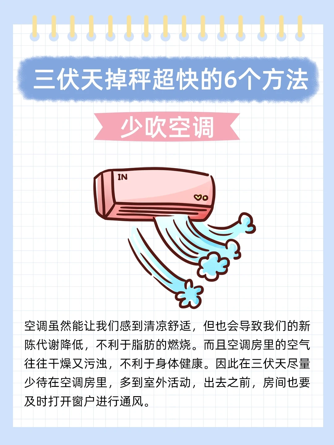 空调虽然能让我们感到清凉舒适,但也会导致我们的新陈代谢降低,不利于脂肪的燃烧。而且空调房里的空气往往干燥又污浊,不利于身体健康。因此在三伏天尽量少待在空调房里,多到室外活动,出去之前,房间也要及时打开窗户进行通风。