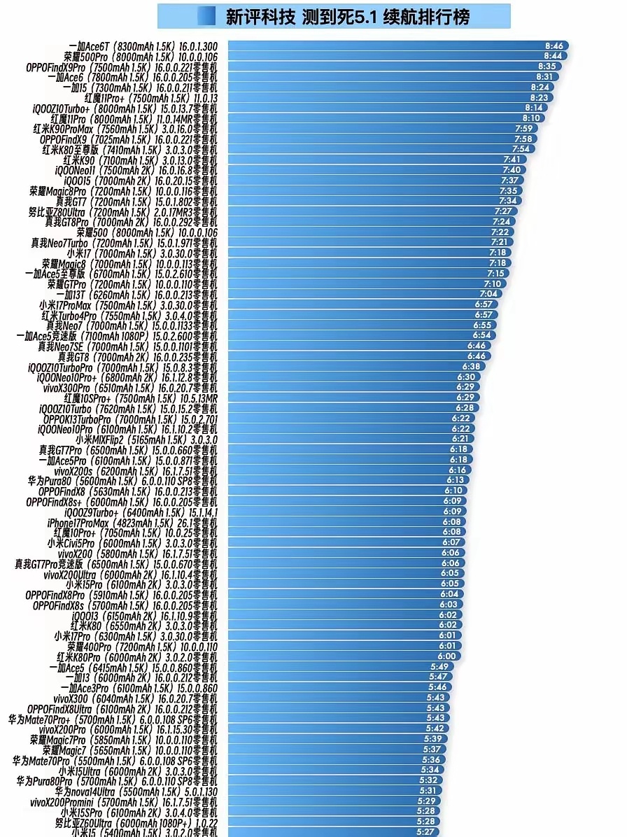 多大才算大?手机圈只要荣耀还在,就没有最大!以前续航测到死7小时已经很牛逼!现在被干到了快9小时了!电池容量马上被卷到10000mAh了!一加 Ace 6T这 续航杀疯了!8300mAh 电池狂用 8 小时 46 分!荣耀500Pro的8000mAh电池也不惯着,8 小时 44 分!多300mAh只多了2分钟续航实话实说意义不大!最惨的是红魔11Pro,当年8000mAh电池干到了8小时10觉得牛逼哄哄的,现在已经被甩出了前五的位置!真是不能在乎天长地久了,只争朝夕吧!