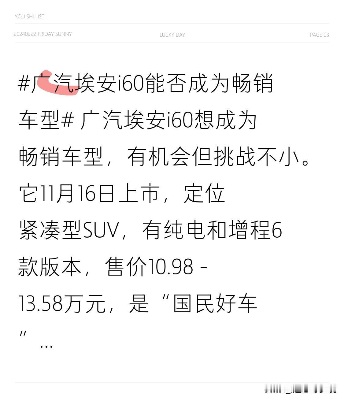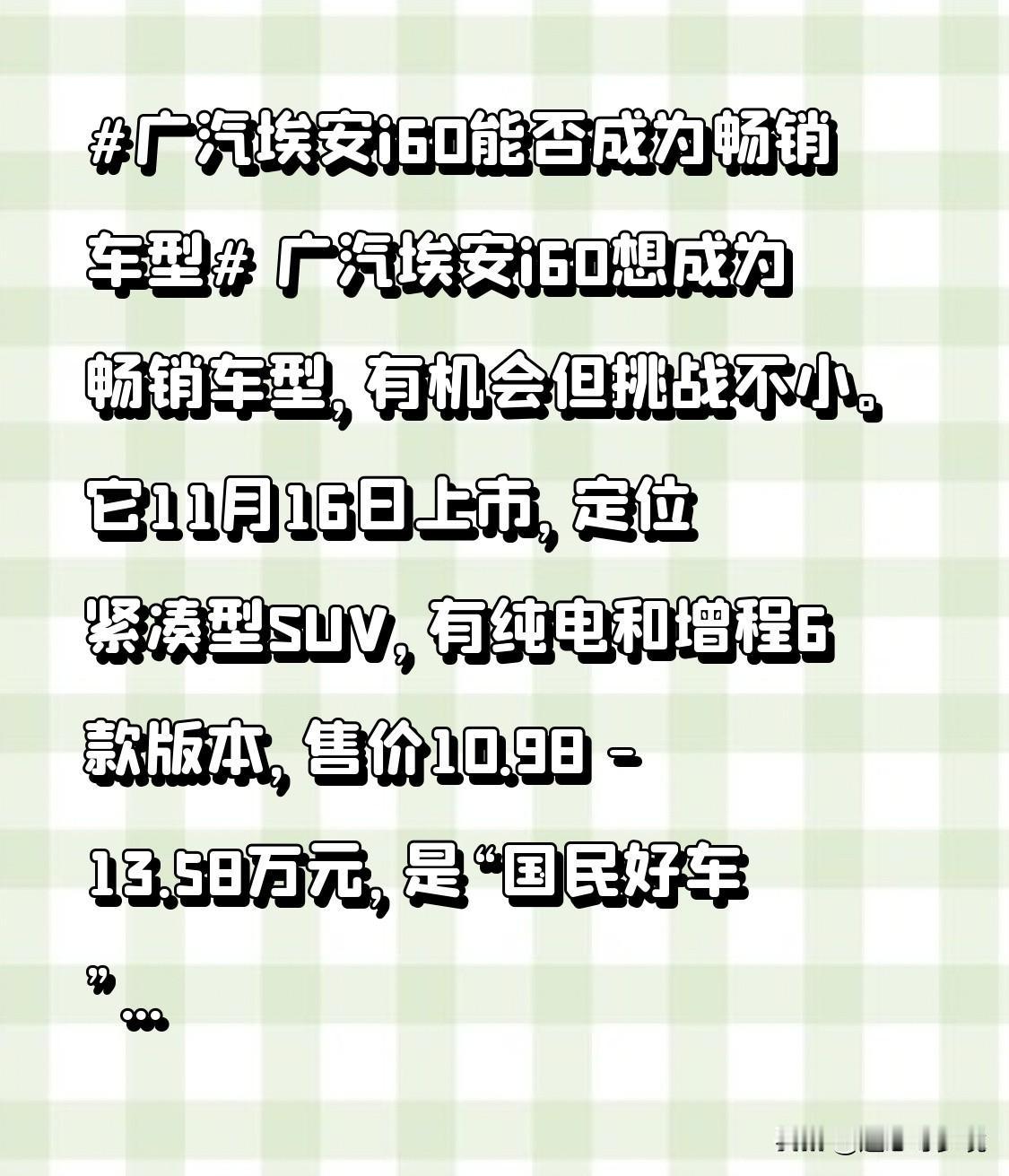 广汽埃安i60想成为畅销车型,有机会但挑战不小。它11月16日上市,定位紧凑型S