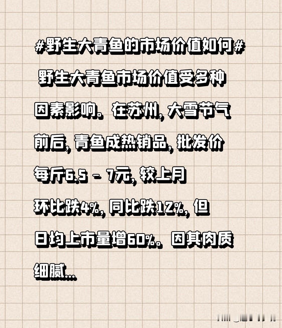 野生大青鱼市场价值受多种因素影响。在苏州,大雪节气前后,青鱼成热销品,批发价每斤