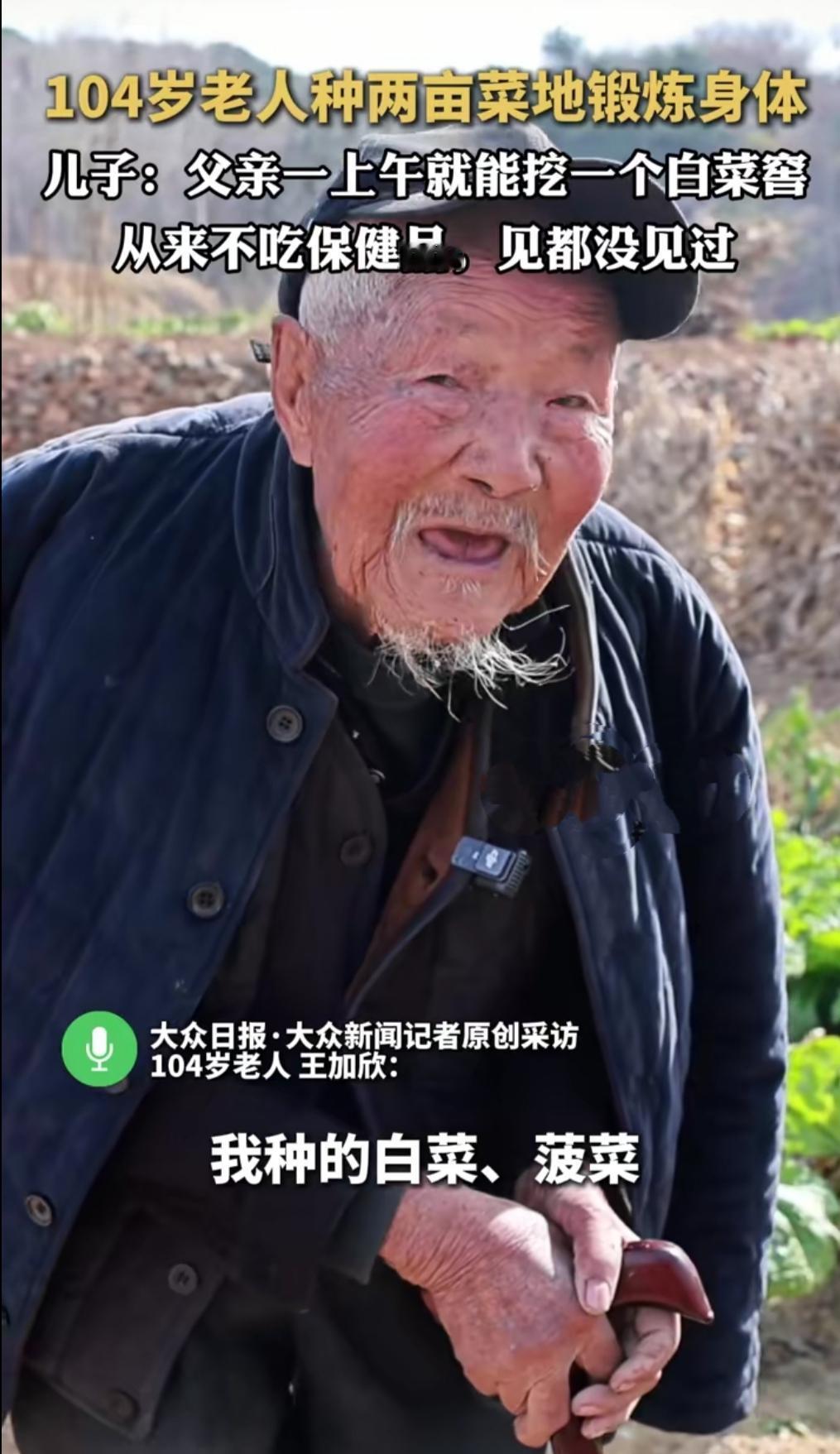 你敢信?104岁的老人居然不用人伺候,还能自己扛着锄头下地种菜!老人动作利索,精神头十足,网友看了都忍不住感叹:这身体比好多年轻人都硬朗! 老人的儿子说,没啥特殊秘诀,就两点:一辈子勤劳不闲着,三餐清淡不挑食,遇事不往心里搁。没有昂贵的保健品,也没有复杂的养生法,全是最朴实的生活习惯。 现在很多人总想着靠吃药、健身打卡养生,却忘了最好的养生,其实藏在日常里。勤劳是身体的“发动机”,豁达是心态的“调节阀”,简单的日子反而最养人。 这位百岁老人的生活,不仅是长寿的范本,更告诉我们:人生下半场,拼的不是财富,而是健康的身体和通透的心态。平凡日子里的坚守,就是最好的养生。