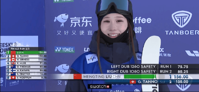 比赛中,刘梦婷第二跳完成三周转体动作完成1080,获得80.25分;第三跳高质量完成1260,抓板时间足够长,拿到85.00分,总分165.25分,获得季军。