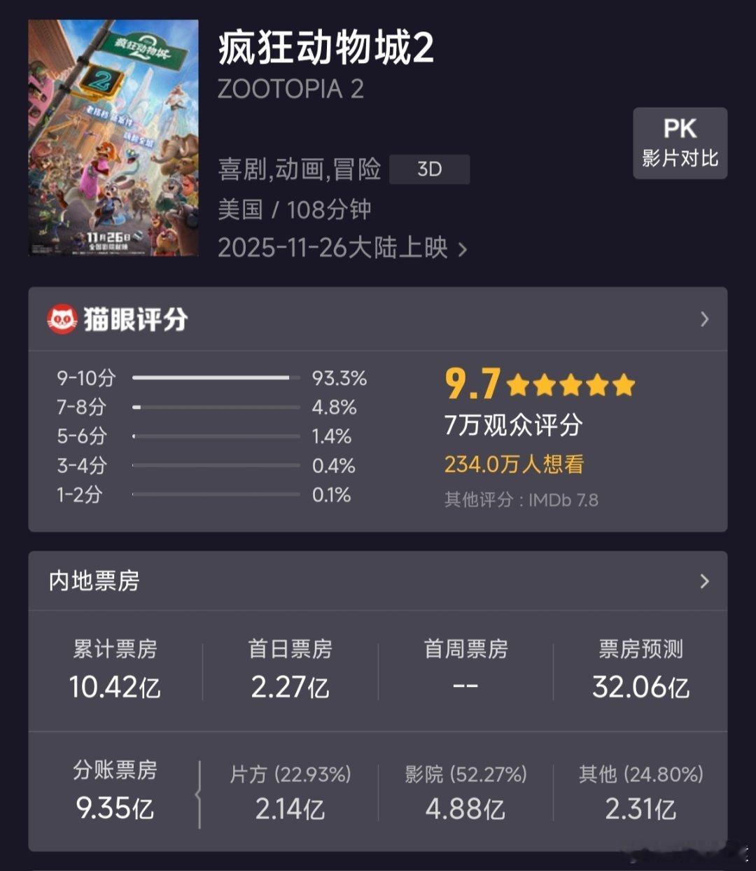 疯狂动物城2内地票房破10亿看了下大盘,基本是疯狂动物城2的个人秀了,今日票房估计会破5亿,猫眼预测总票房32.06亿元。
