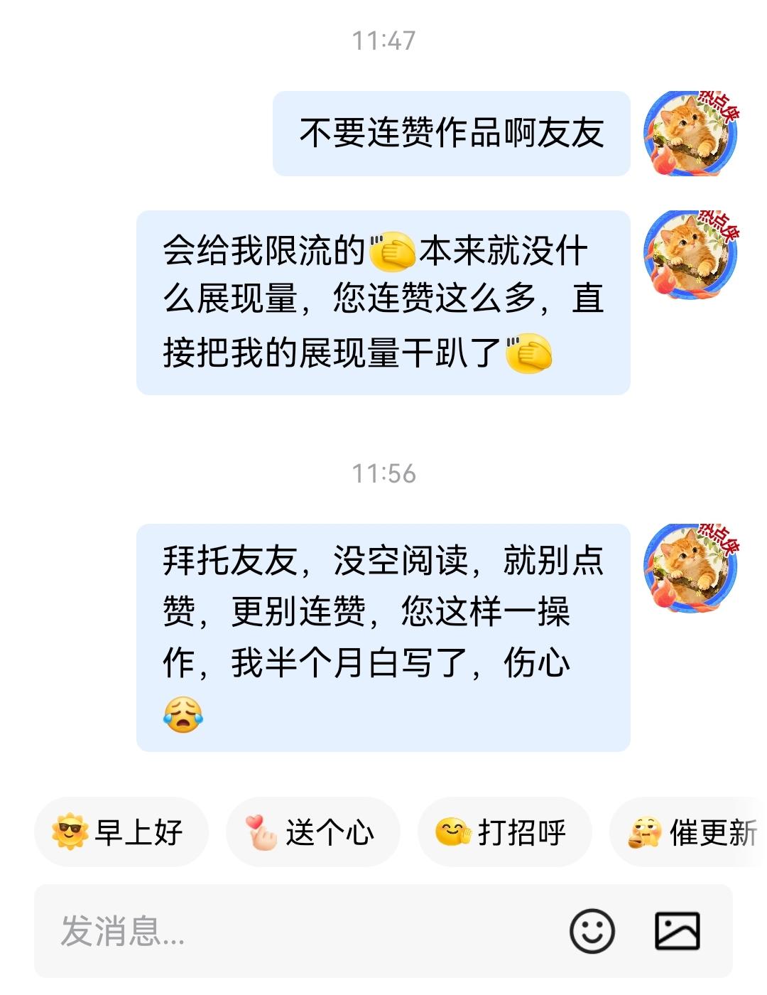 三天两头被人连赞, 我是哑巴吃黄连, 今天又被人连赞作品 实在忍不住要分享一下, 被条友连赞后的心情。 本来最近展现量就不好, 接二连三被人连赞作品, 展现量肉眼可见的 一天比一天少, 难道这些条友不知道, 连赞作品,作品会被限流? 特别是不阅读的情况下, 连赞作品十几篇, 会被平台误判作者刷赞。 我辛辛苦苦, 一个字一个字敲打出来的文章, 不阅读,直接连赞作品导致作品限流, 比黑粉追着骂我,还要伤心。 我还是借用老话: “勿以善小而不为,勿以恶小而为之!” 我以诚待人,回访条友, 阅读完了才点赞,偶尔评论, 遇到很喜欢的,最多连赞两篇作品, 生怕因我的缘故影响到条友的作品展现量,谨慎对待。 我只能做到约束自己的不恰当行为, 无力阻拦别人肆意妄为的行为, 事已至此, 我只能把人尽量往好处想, 他们可能不知道, 不阅读连赞作品,会导致作品限流。 上次有个写头条的作者, 不能称为条友,他不配, 他自己的账号名后面括号里写着(拒绝连赞) 不知道你们遇到这种人没有? 却把我的作品连赞20多篇! 这样的做法,很明显有意为之, 其心可诛,我直接将他拉黑!