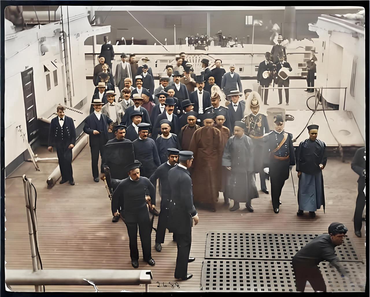 这张照片记录的是1896年8月李鸿章访美抵达纽约时,在邮轮甲板上的场景,这段行程是他环球访问(俄、德、法、英、美)的重要一站,也是清朝高官首次正式访问美国。 1895年李鸿章因签订《马关条约》背负骂名,被清廷暂时“闲置”;1896年他以“钦差头等出使大臣”身份开启环球访问,核心目的是借外交活动为清廷争取国际支持、缓解甲午战后的危机,美国是他访问的倒数第二站(后赴加拿大)。1896年8月28日,他乘坐“圣路易斯号”邮轮抵达纽约,这是美国首次接待清朝最高级别官员。 照片中邮轮甲板上的人群,包括美国官方接待人员、邮轮船员及李鸿章的随行幕僚(其中身着传统服饰的是他的清朝随员)。当时美国为他安排了总统级礼遇:纽约港鸣礼炮21响,数万民众沿岸围观,《纽约时报》等媒体全程跟踪报道——“李鸿章身高很高”(远超当时中国人平均身高,也比多数西方接待官员高大),美国媒体当时特别提到“这位中国高官身材魁梧,气宇轩昂,在人群中格外醒目”。 李鸿章在纽约停留约10天,期间参观了自由女神像、唐人街,还发表公开演讲:既呼吁美国放宽对华贸易限制,也委婉批评了美国刚刚实施的《排华法案》(认为其“伤害华人情感”);同时他向美国传递了清廷“欲效仿西方改革”的信号,但此时美国更关注在华经济利益,并未给予实质支持。