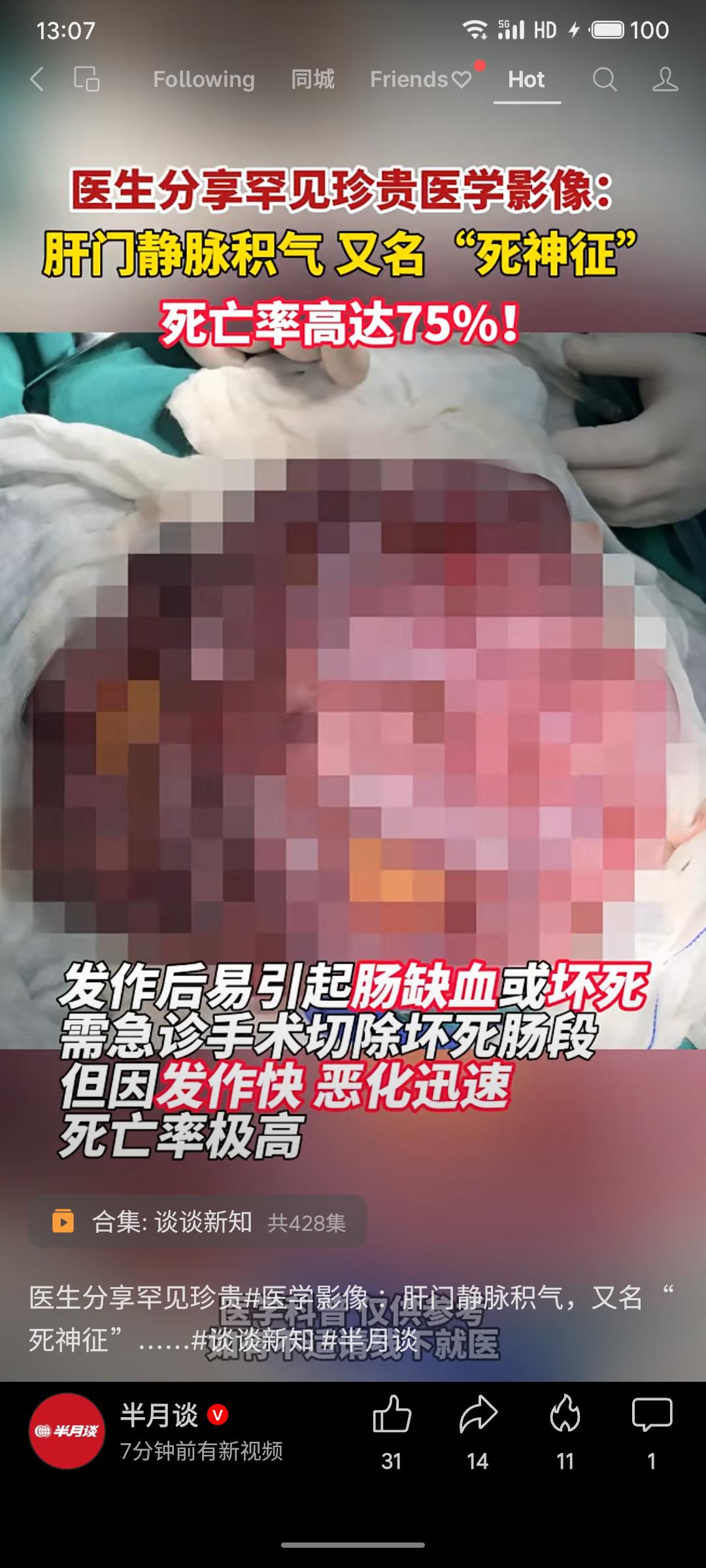 医生分享罕见医学影像“肝门静脉积气”,俗称“死神征”。该征象表现为门静脉系统内气体异常积聚,多提示肠道缺血坏死或严重感染,常伴腹痛、发热、休克,病情进展快,死亡率高达75%。