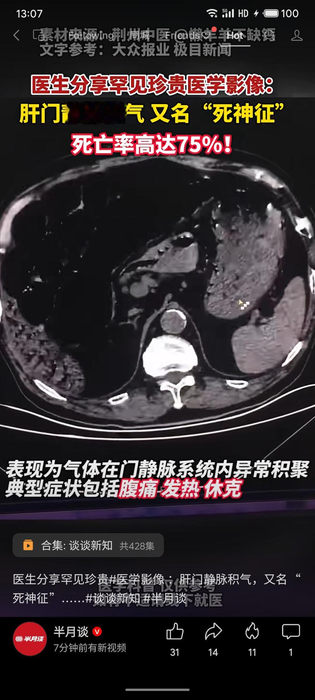 医生分享罕见医学影像“肝门静脉积气”,俗称“死神征”。该征象表现为门静脉系统内气