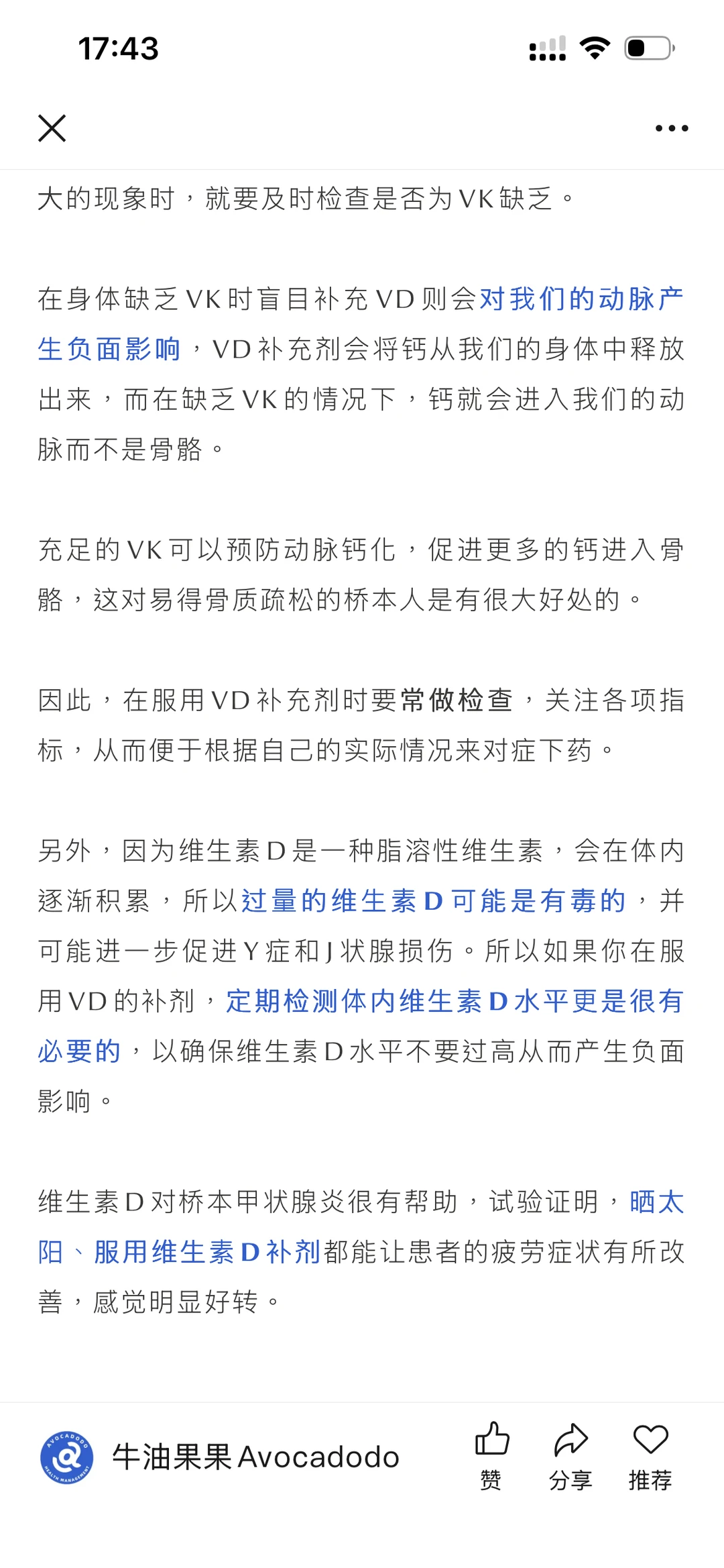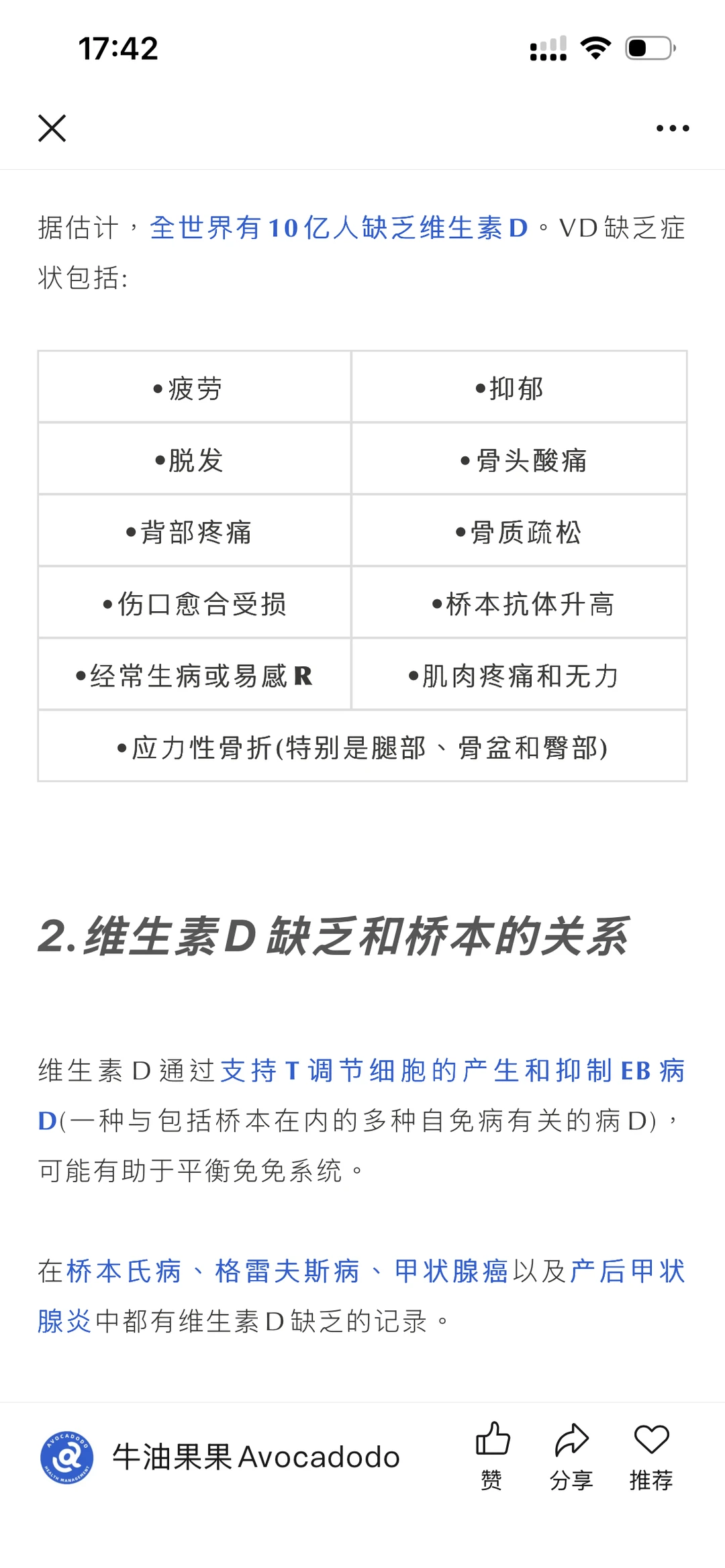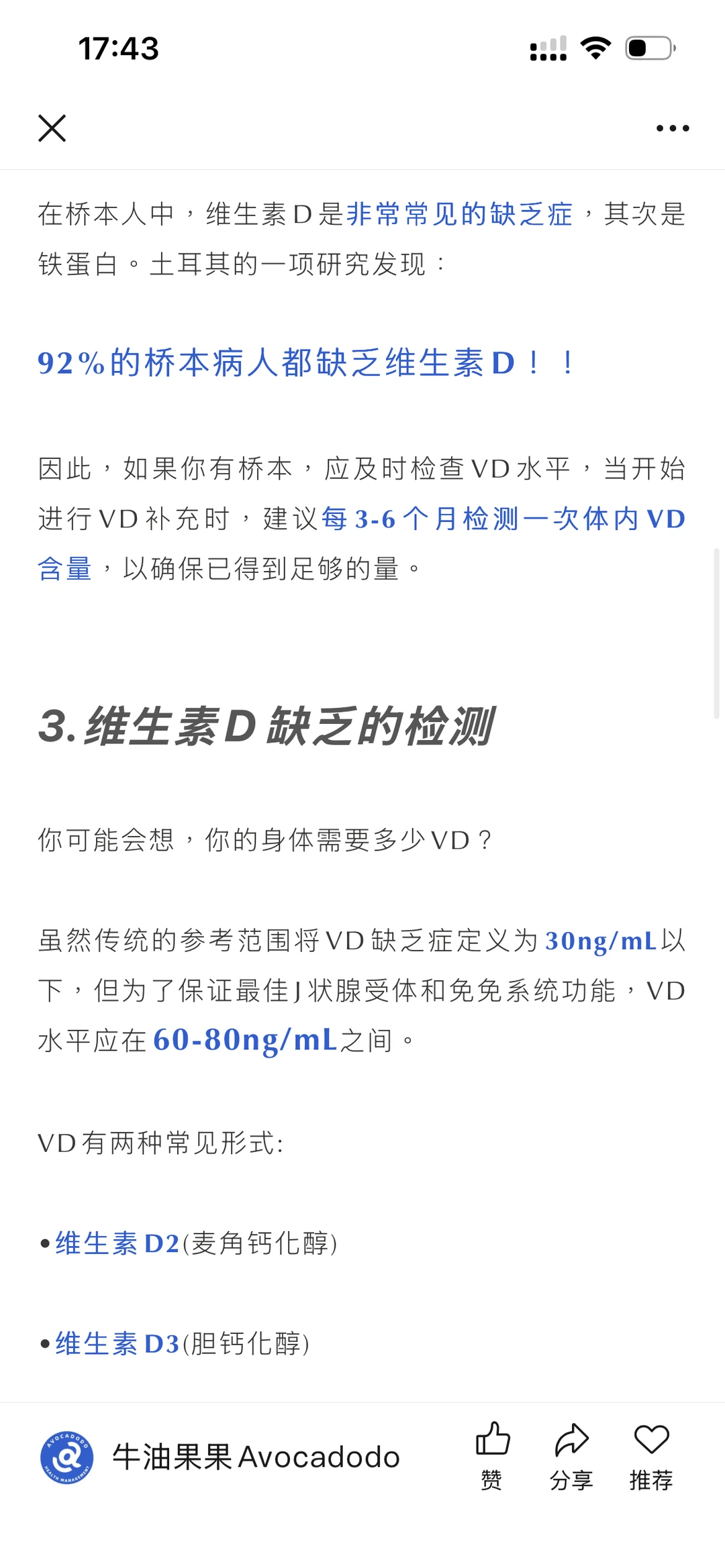 得了桥本后情绪不好、容易焦虑?或是经常很累,还容易生病?[失望R][失望R] 那你很可能是缺乏维生素D! . [种草R]维生素D在人体中大部分的生化反应中都发挥着重要的作用,不管是免免系统还是情绪调节,都需要它的帮助。 但是据调查,有92%的桥本人都缺乏VD!那么为啥VD这么容易缺乏?又该怎么补充呢? 今天翻译的这篇博士文章就能很好地解答你的问题。