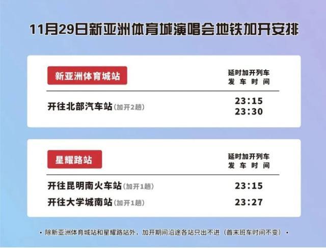 星耀路站开往大学城南站方向,延时加开列车发车时间为23:27(新亚洲体育城站开往大学城南站方向列车发车时间为23:30)。
