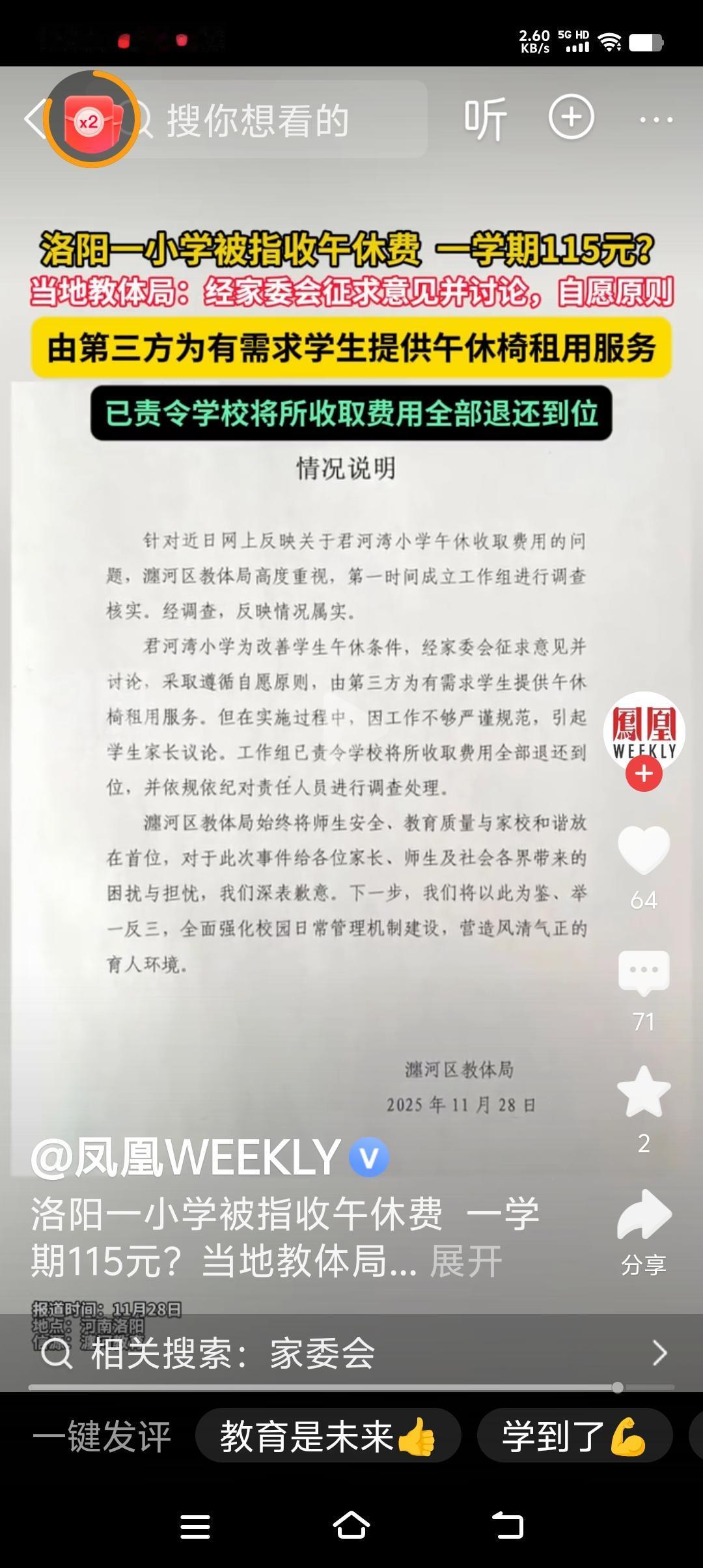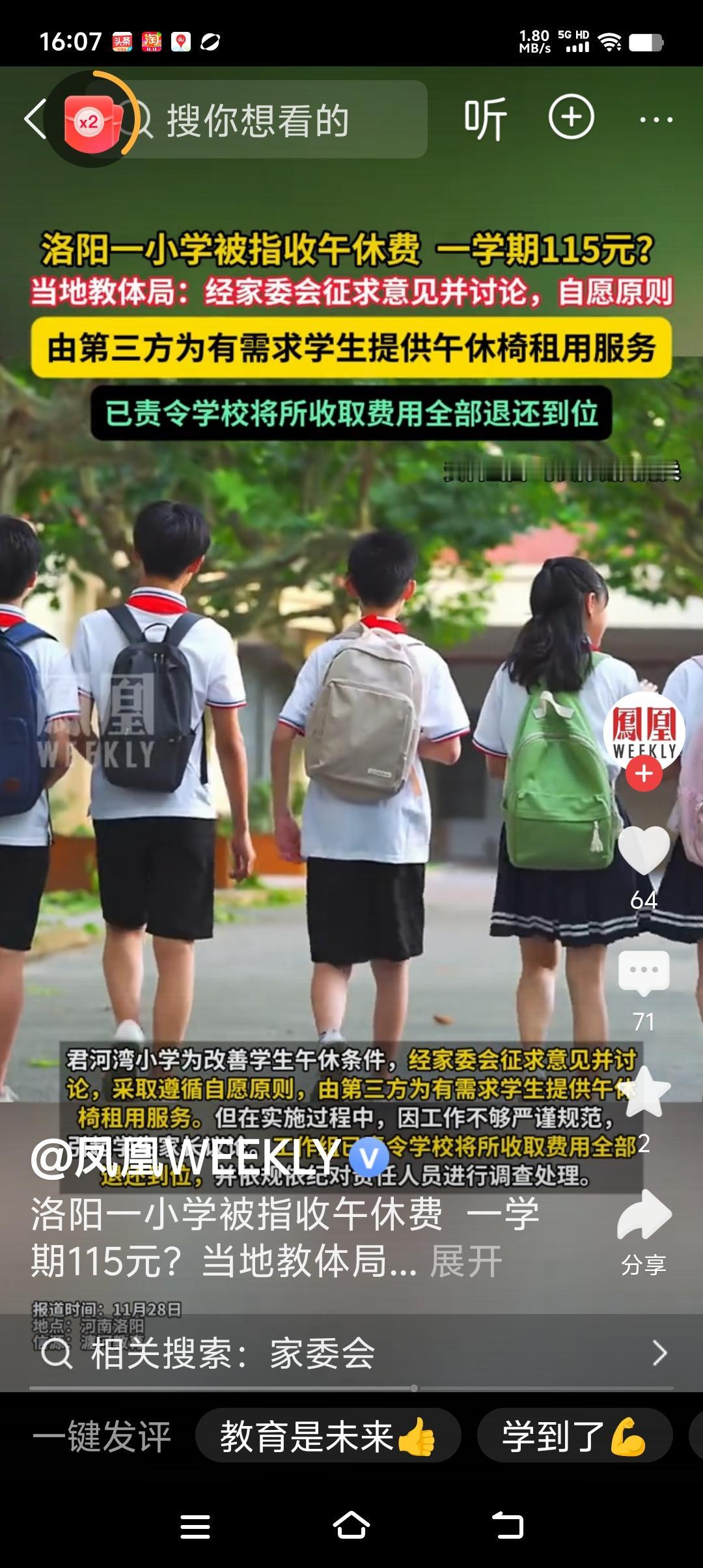 学生午休要收费115元? 河南洛阳一学校,本来学生是趴在桌子上睡觉的,学校意识到孩学生这样睡觉,对身体不太好,于是就想了一个办法,让第三方介入提供学生午休时的休息椅子, 如果用了这样的 休息椅子,就要收取学生115元的费用,分摊到每天的话是0.9元,用不用第三方提供的休息椅子是学生自愿的! 虽说是自愿,但是同样在一个班级里学生做做说同桌用了这种休息,咱自己家的孩子就趴在桌子上睡吗?所以这种所谓的自愿的,只不过是一种说辞而已! 学校承载收取费用的时候是家委会同意的! 但是不管怎么说?在学校里学生休息,还要花钱,这有点说不下去, 因为九年义务教育阶段,学生是免费享受学校资资源! 因此这件事遭到了家长举报学校,马上做出回应,把收取学生的费用全部退回! 学校强调说115元,平均分摊到每天只有0.9元,那么我想说,只有0.9元钱,那么学校就把这笔费用支出就完事了呗! 其实, 解决学生午休趴桌子睡觉,这个问题确实应该上级主管部门列入到日程, 为学生提供舒适的午睡环境,确实很有必要,希望主管部门能够把问题解决好,深得学生和家长的欢迎?