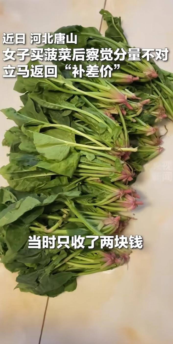 唐山街头2元菠菜暖全网!女子折返补钱调秤,央视都为她点赞 河北唐山玉田县金玉市场的早市上,人声鼎沸的烟火气里,一桩小事温暖了无数人的心,甚至火上了央视新闻。 11月下旬的清晨带着凉意,邵辰辰在市场角落撞见一位70多岁的老爷爷。老人穿着略显陈旧的棉袄,粗糙的双手布满老茧,指甲缝里还沾着泥土,面前的小摊上,刚从菜园摘下的菠菜带着晨露,绿油油透着新鲜 。“两块钱一斤,自家种的,没打药”,老人沙哑的声音里满是真诚。邵女士挑了一斤,付了钱,拎着沉甸甸的菜袋骑车回家。 刚进楼道,她就觉得不对劲——这袋菠菜比超市两元钱买的多了一倍,手感沉得实在反常。她赶紧拿出家里的秤一称,指针赫然指向两斤!“老爷子准是把公斤秤当成市斤用了”,邵女士心里一紧,想起老人佝偻的身影和冻得发红的手背,二话不说转身骑车往市场赶。 回到摊位前,老人正给顾客称菜。邵女士气喘吁吁说明来意:“大爷,您的秤调错了,我买一斤收了两斤的菜,得补您钱!”她掏出手机转了两元差价,又蹲下身耐心教老人区分公斤和市斤,一点点校准秤的刻度 。周围顾客见状,也纷纷检查自己的菜,主动补上差价,摊位前满是暖意。 后来邵女士再次探望老人,悄悄扫码付了50元才象征性拿了点菠菜。这桩“小事”被传到网上,收获130多万点赞,央视新闻也为她的善良点赞 。 邵女士,谢谢你!在快节奏的生活里,你没有忽视这份意外的“便宜”,反而为了两元钱奔波折返。你调准的不只是电子秤,更是人心的刻度;你传递的不只是两元差价,更是人与人之间最珍贵的共情与真诚。你的善举让我们相信,善良从不是小事,它能在寒冬里暖透一座城,也能让世间的烟火气更有温度。愿这样的善意永远传递,温暖更多平凡的日子!