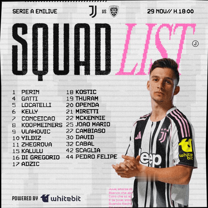 虎扑11月29日讯意甲第13轮,尤文图斯主场对阵卡利亚里。赛前,尤文官方公布本场比赛大名单。