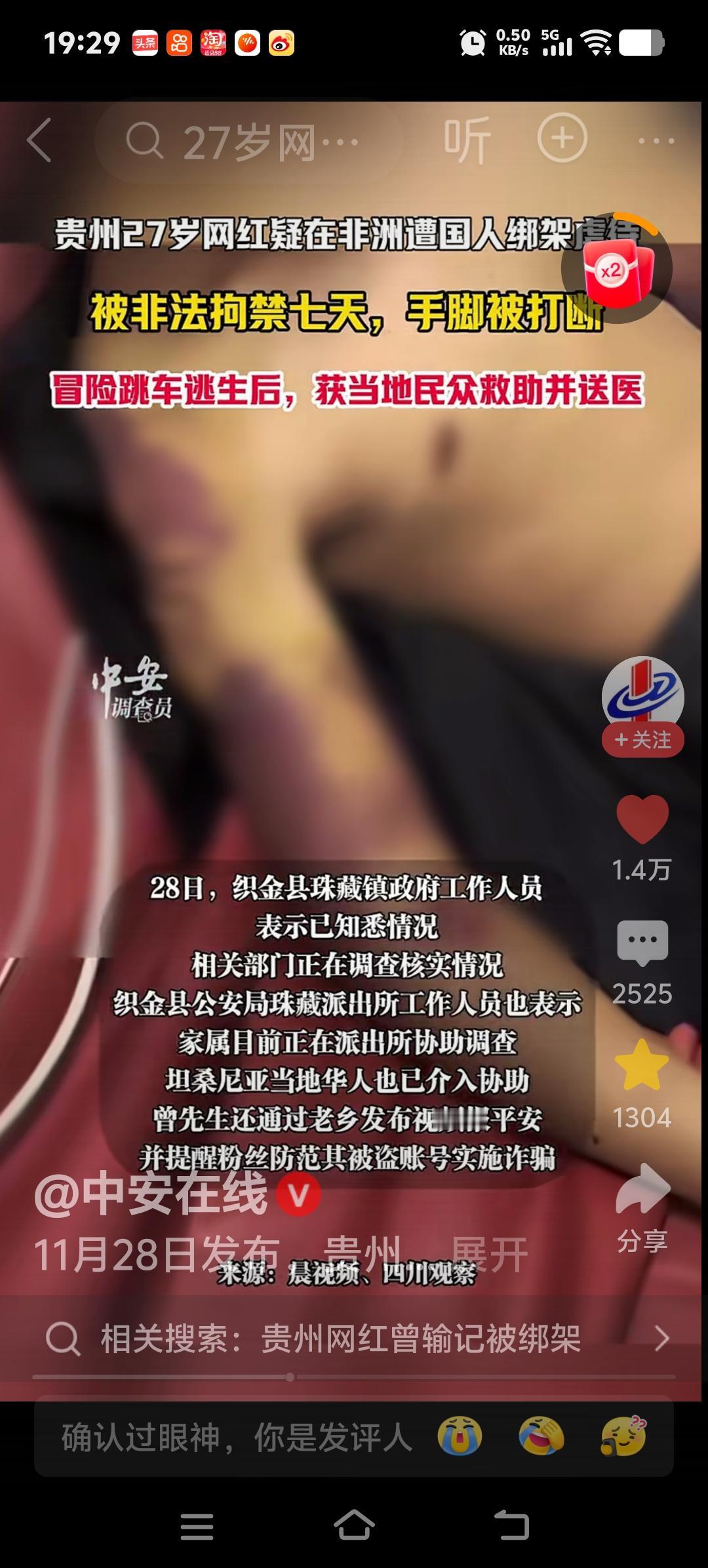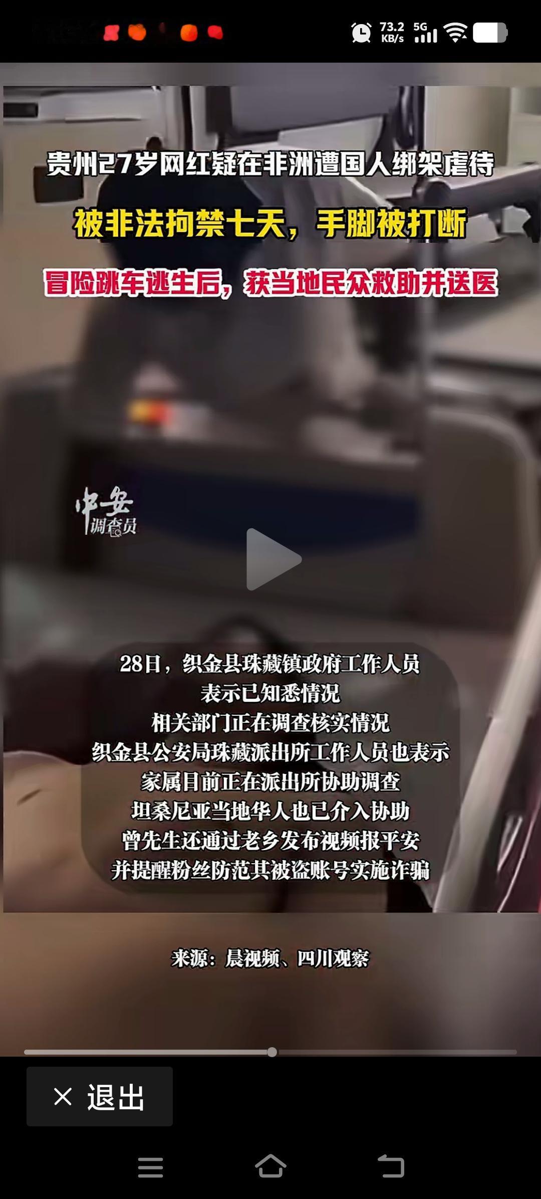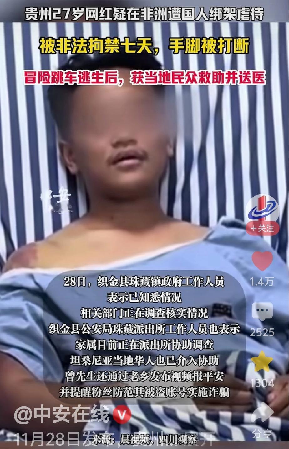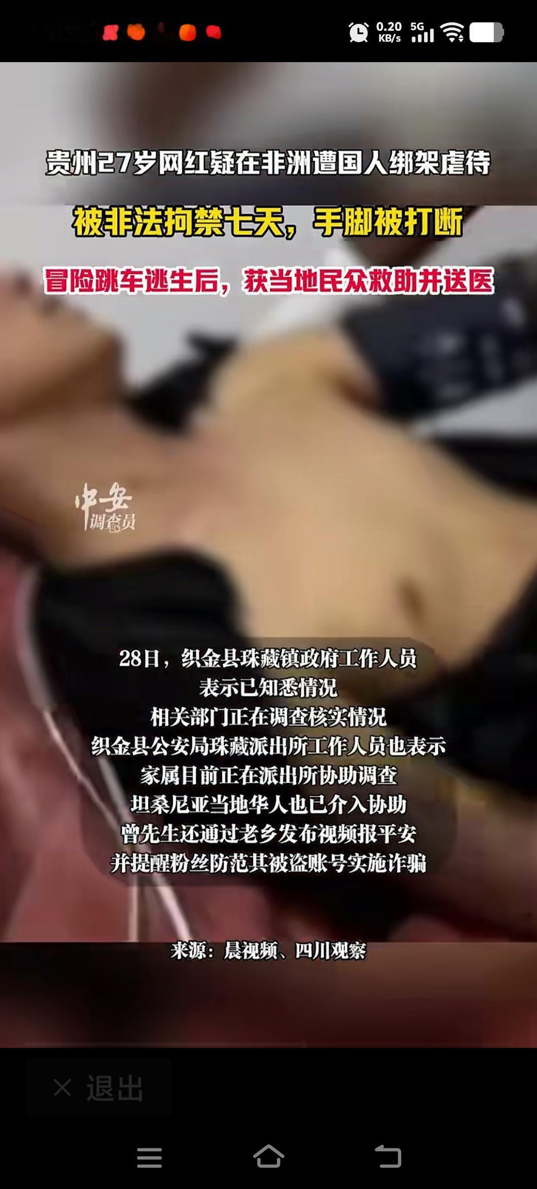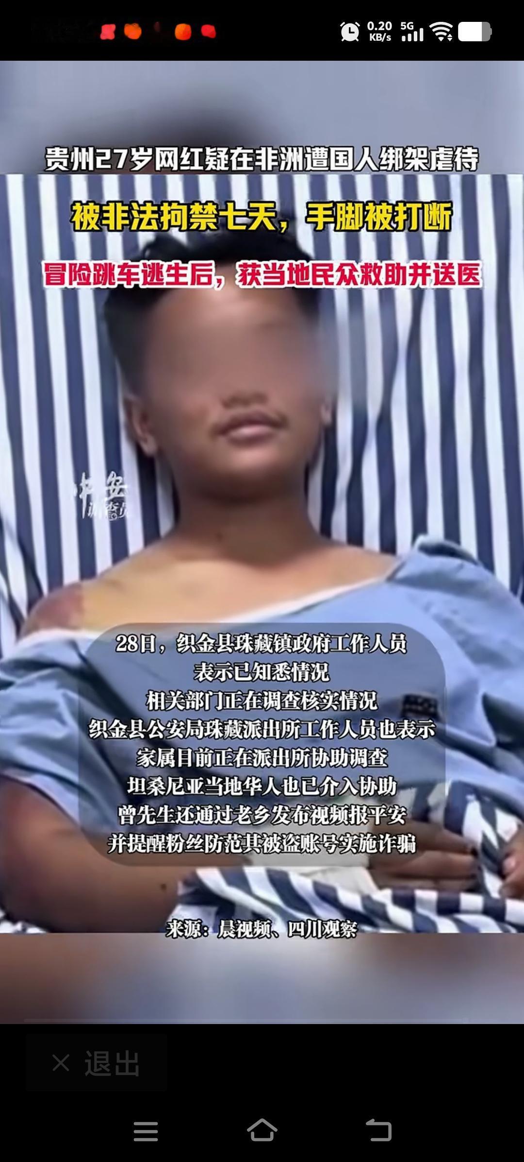 好残忍啊!就因为不愿意诈骗国内同胞,贵州自媒体网红曾某,被同是中国人的诈骗团伙绑架,并打断脚和手。 最近,27岁的曾某,在非洲遭到犯罪分子绑架7天,绑架他的是华人。 他们要求曾某从事诈骗活动,并且目标人群就是咱们国人。曾某不同意,他们就虐待他,打断了他的手脚。 当绑匪就要杀害他们时,曾某在路途中跳车逃生,最后得到了当地人的救助。 出门在外,作为同胞,难道不应该相互帮助吗?为什的要自己人迫害自己人。 评论区里有网友就留言说,出去国门,要提防自己国家的人,当地人还没什么,比较友好,能对中国人使坏的,往往是自己人,你说可怕不? 还有人说,出去国门,当地人见了会给你个笑脸,而遇到国人,往往会冷漠的不理你。这是什么原因造成的?难道,先润出去的人,根本就看不起我们普通人。 冷漠也就罢了,更令人痛恨的就是这种,不但不帮你还要害同胞的人。估计这些人,应该是在国内有前科的,本来就不是善茬。 如果,国家有能力,一定要把这样的坏人引度回来,该判刑判刑,该枪毙就枪毙,不能让他们老是在外边祸害同胞。 图片来自网络,侵删致歉。