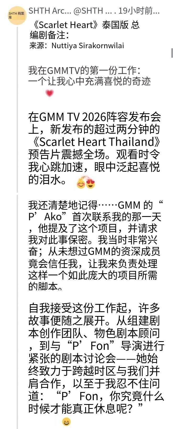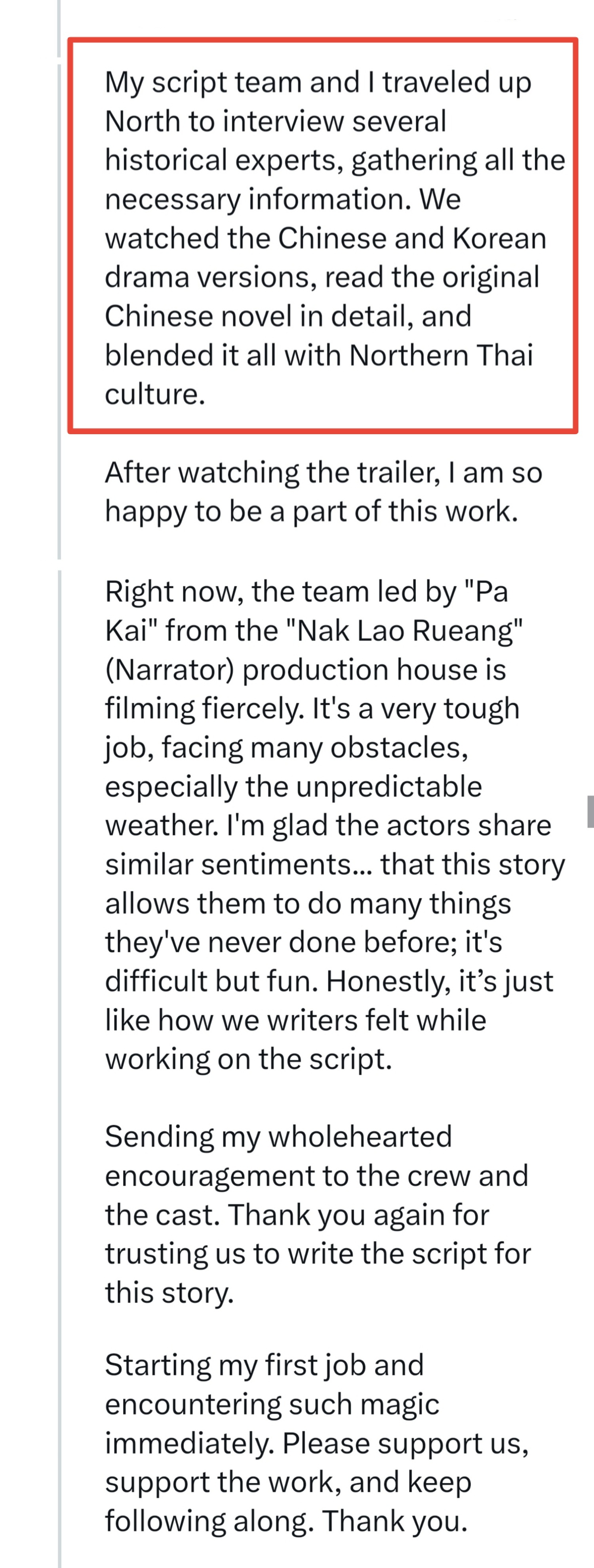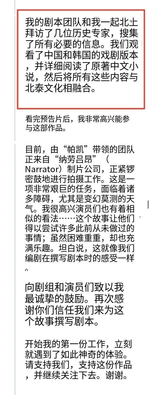 泰版步步惊心继主演说翻拍🇨🇳原版后,泰版步步惊心总编剧也提及到面对如此重大的项目,团队详细阅读了原著小说和观看中韩两版步步惊心电视剧,希望与北泰文化相结合。有些人别再帮着韩版窃取刘诗诗的剧实绩了,只有刘诗诗演的步步惊心才值得被外国翻拍,被“好莱坞编剧之父”阅读剧本,演员和剧相互反哺长达十几年,那么多清装剧只有步步惊心火爆亚洲大长尾被翻拍