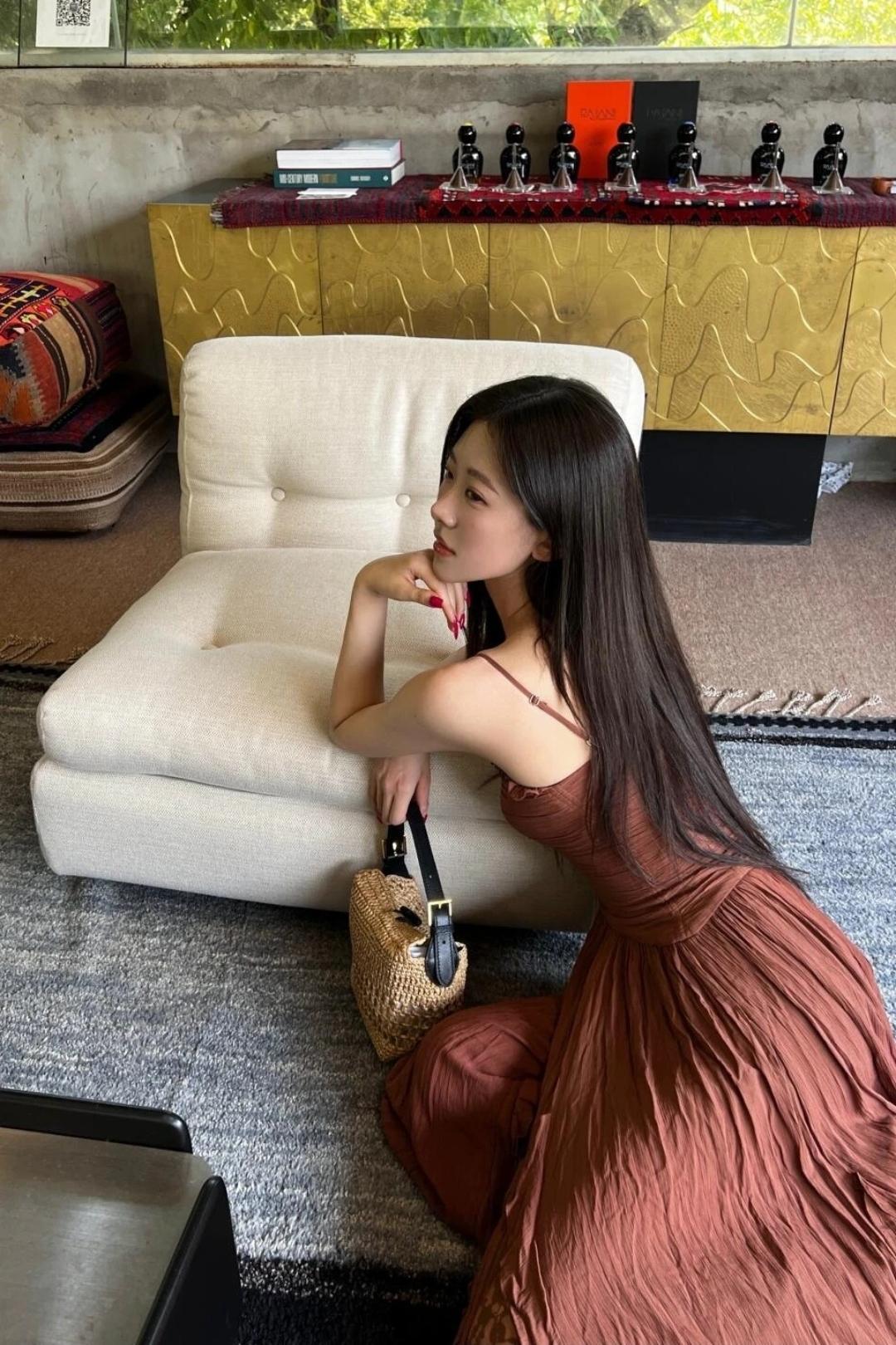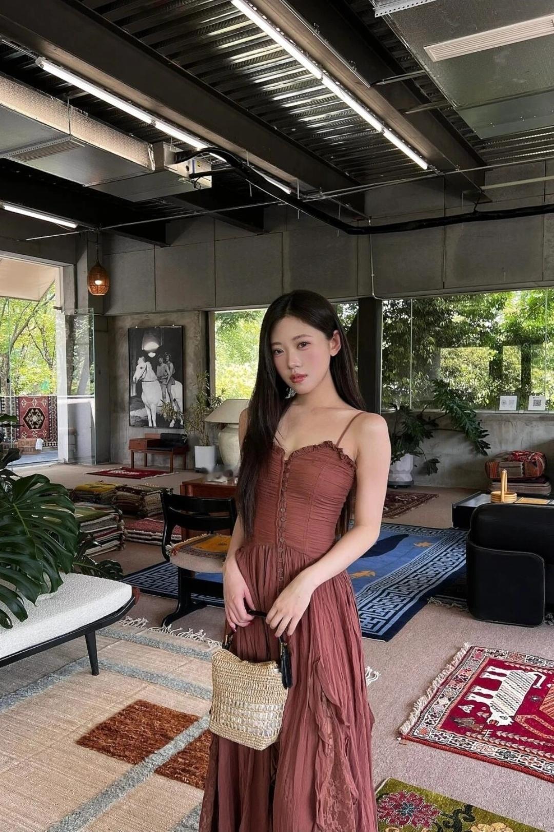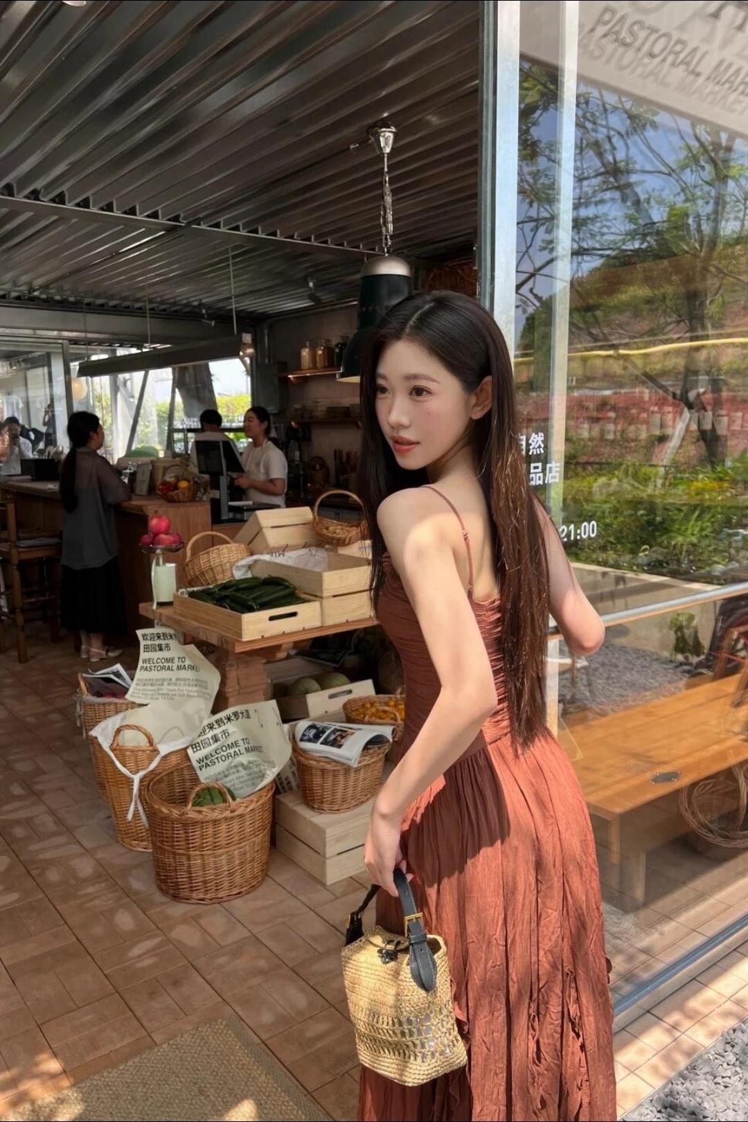 少女摄影|NO.0123期 清甜少女松弛氛围感随拍 焦糖吊带连衣长裙+藤编手提包