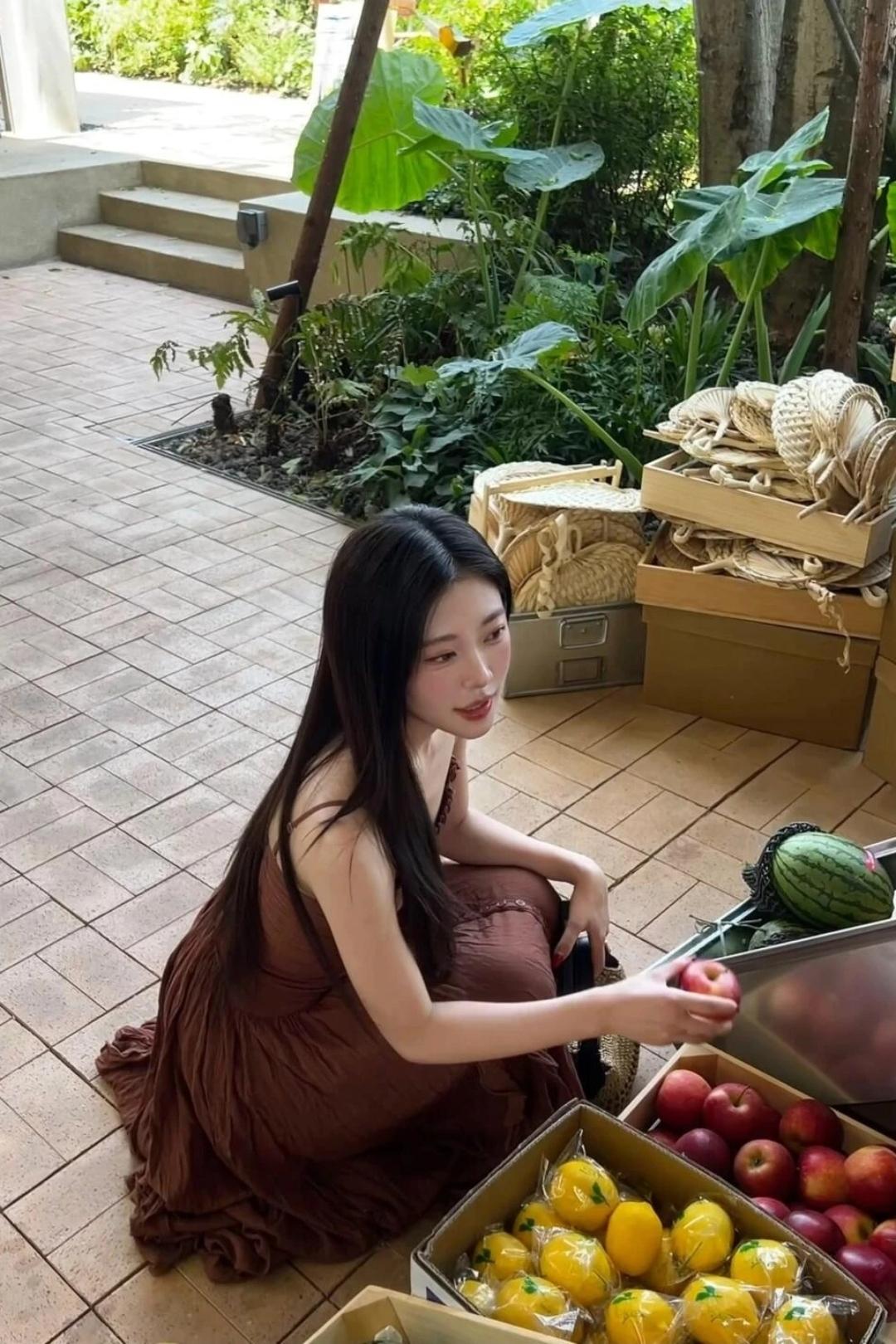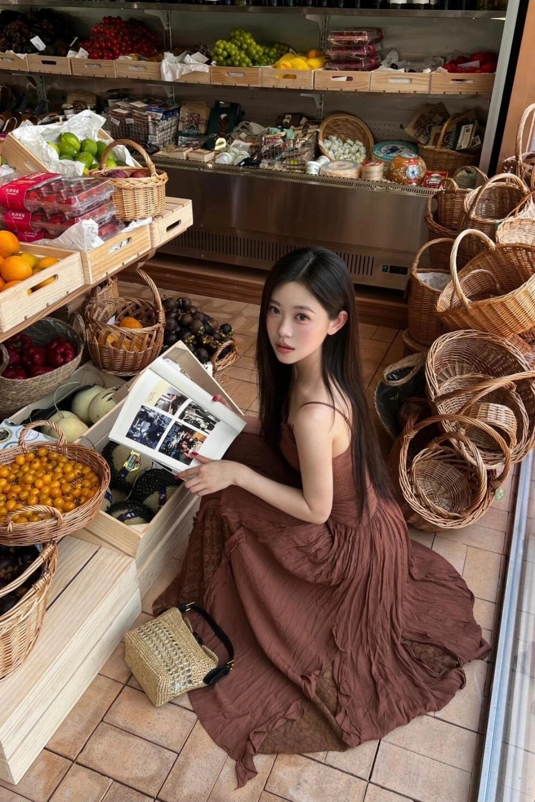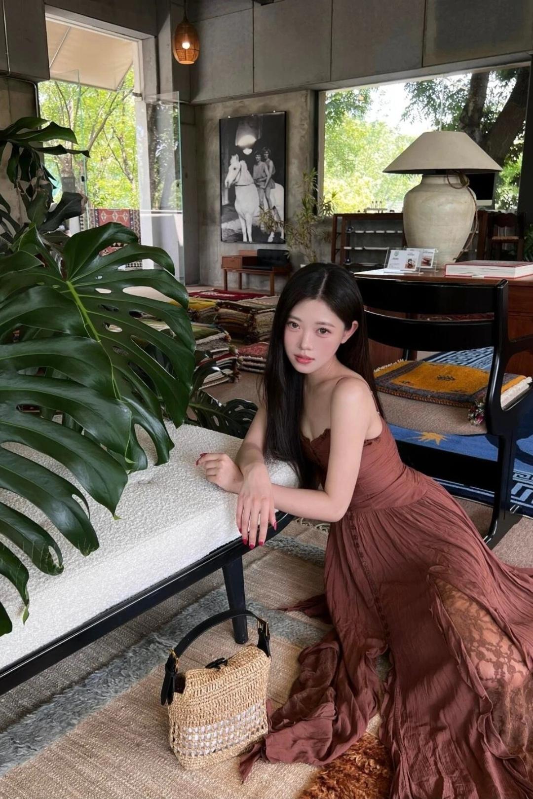 少女摄影|NO.0123期 清甜少女松弛氛围感随拍 焦糖吊带连衣长裙+藤编手提包