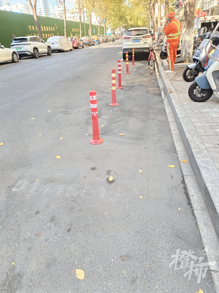 记者注意到该处设置塑料圆柱隔离柱的道路上,原来应该是收费划线泊车位,被擦除的车位编号仍然依稀可见,现场路面被钉着5个圆形塑料隔离警示柱,在隔离柱的南侧尾部,地面上还残留着一根钉隔离柱的黑钉。