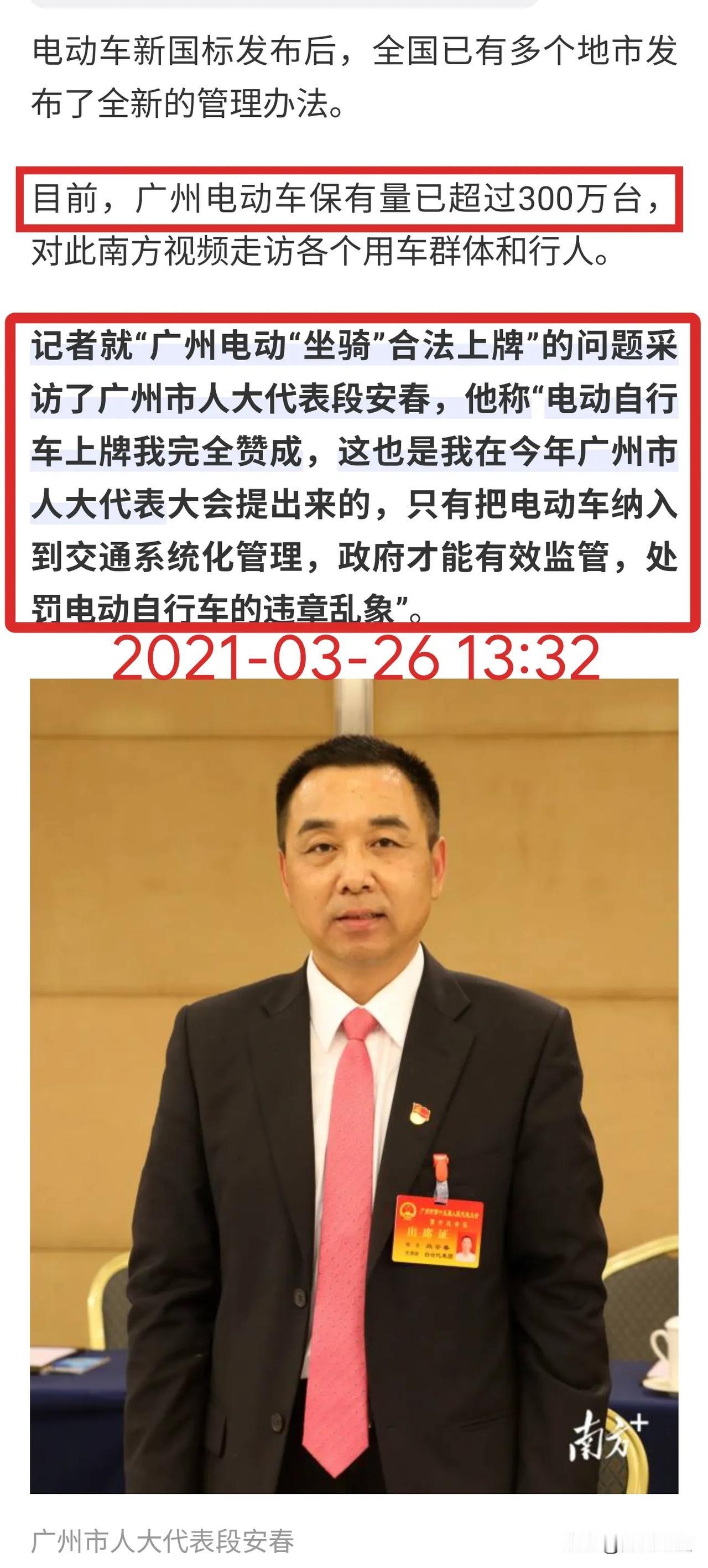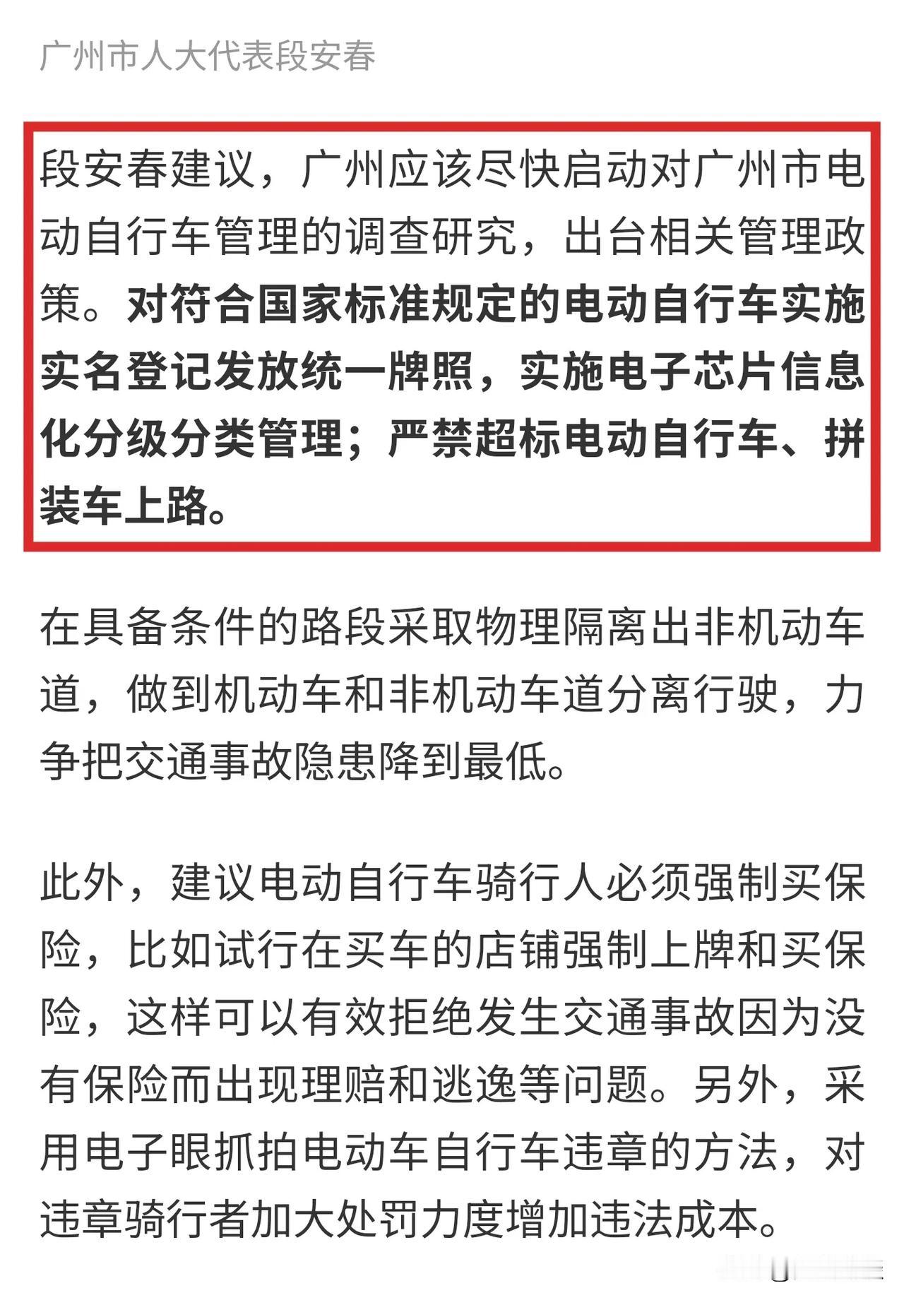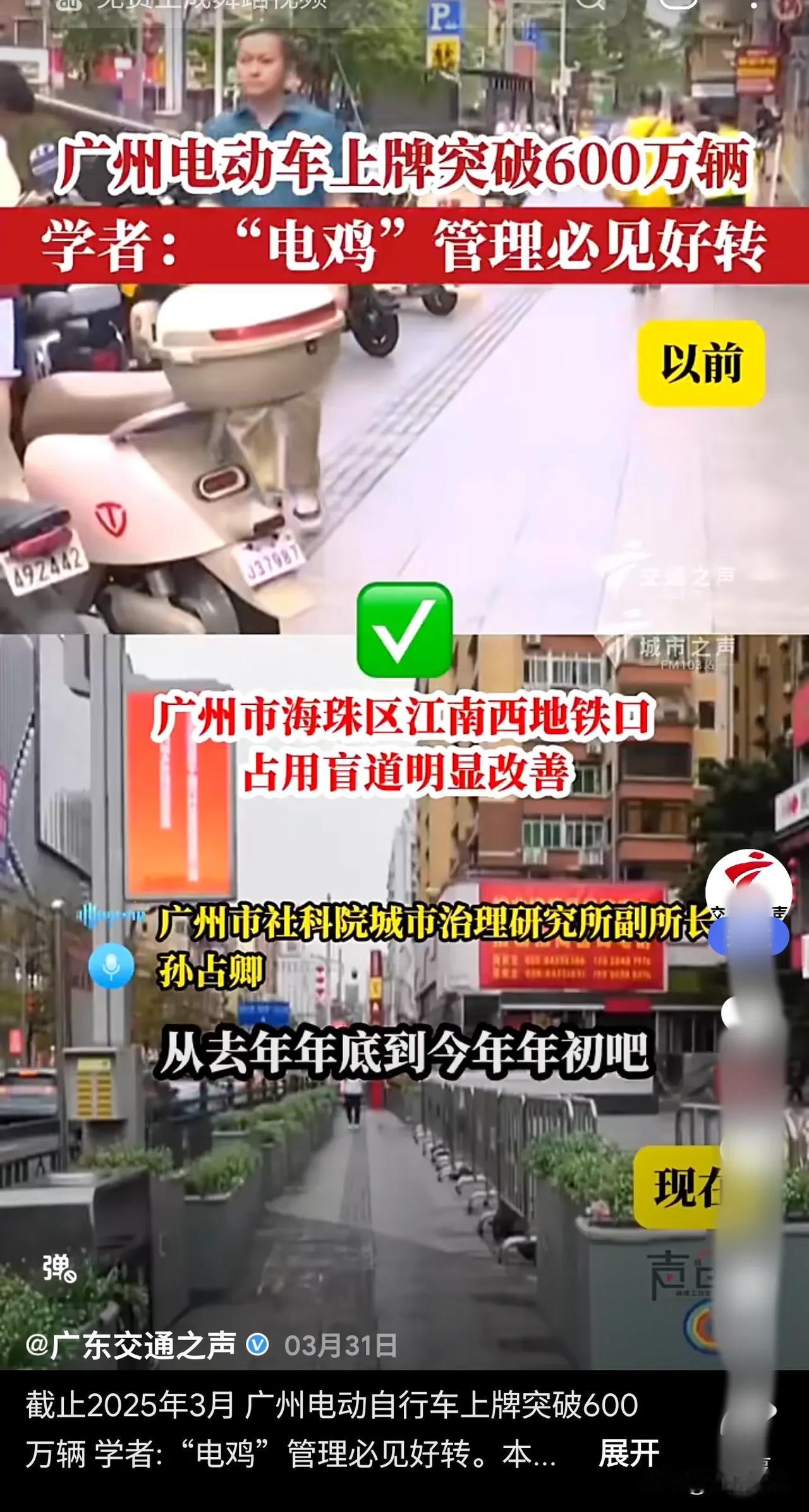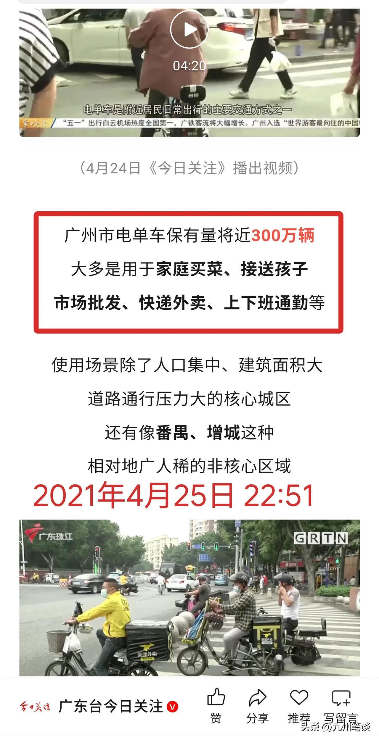【重磅】推动广州电动自行车上牌的竟然是——公交系统! 捋顺影响广州方方面面的“电鸡上路”之前世今生!回到四年前的2021年底,面对全市超300万辆电动自行车,是否开放电动自行车上牌,最终尘埃落定——允许! 提议上牌纳入管理的有来自公交系统、传媒行业、律师行业等!允许“电鸡”上路最终是集体智慧的结晶!给电鸡以身份! 自2006年起开始实施,并两次延长的,共计实行了15年的广州电动自行车禁止上路行驶的通告寿终正寝! 从此广州全市允许电动自行车上路行驶,并推出了广州电动自行车白色个人普通号牌和外卖快递蓝牌。 广州电动自行车迎来爆发式增长,每个月上牌数增加10万辆。 目前已经超过了600万辆!超过四分之三的家庭有电动自行车。担负起广州交通的三分之一,运输量仅次于地铁。 电动自行车等非机动车为广州中心城区绿色通行率领先全国超大城市,做出了巨大贡献! 电动自行车灵活小巧,电力驱动,又无声无息,走人行道,逆行,走机动车道的地铁很多,司空见惯。 管理起来很难,但不是无法管理。 通过合理分配道路资源,非机动车停车区与人行道分离等措施,还是可以管理好的。 道阻且艰,行则将至!