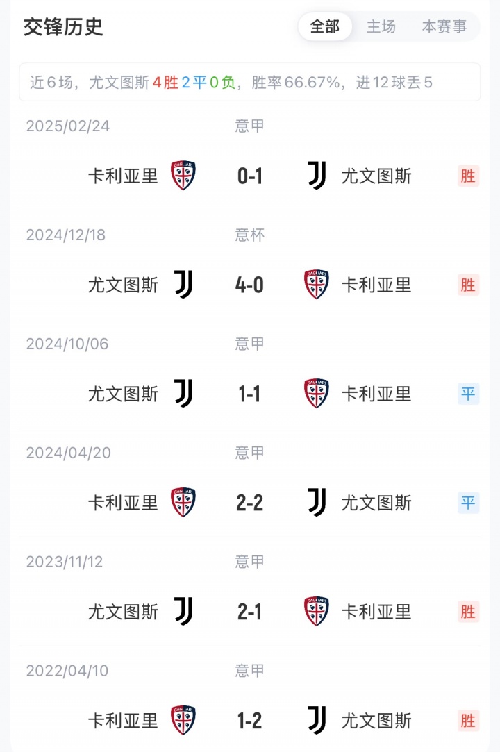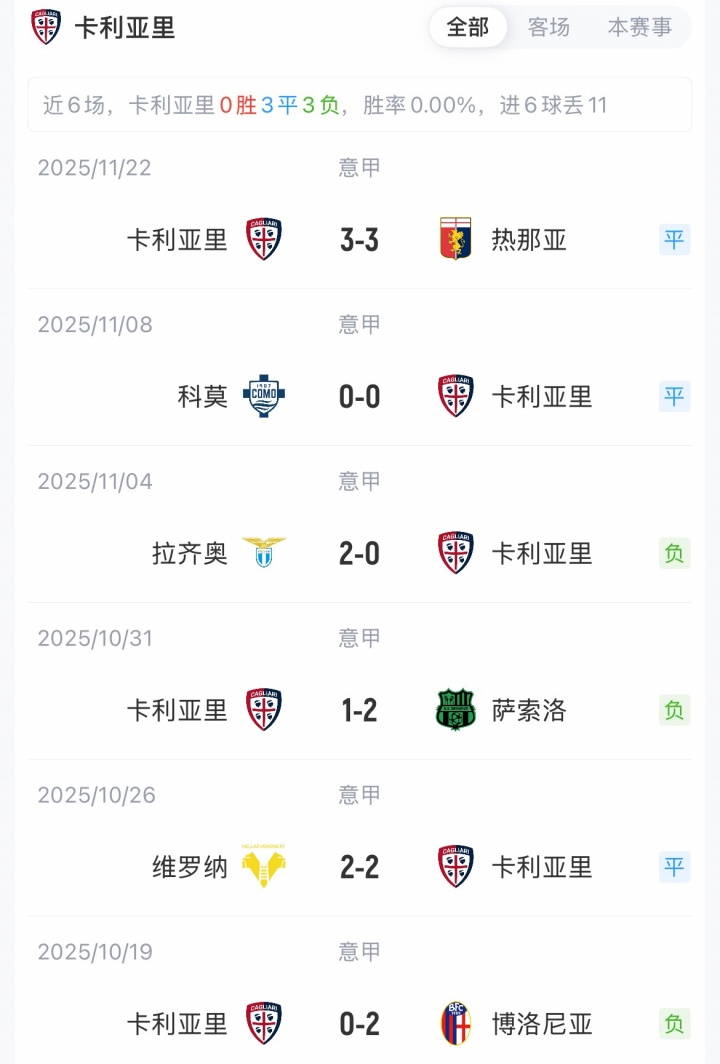 尤文联赛两连平,暂以20分排名第七。卡利亚里各赛事8场不败,暂以11分排名第十四。