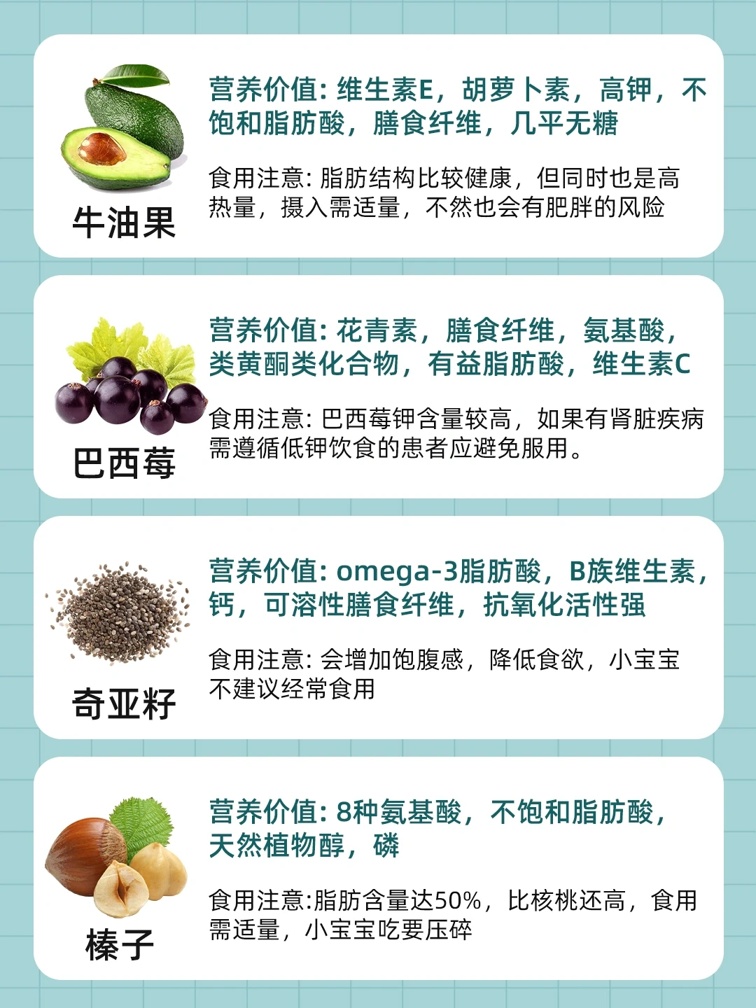 【牛油果、巴西莓、奇亚籽、榛子、蓝莓、羽衣甘蓝、蔓越莓、枸杞、巴西坚果、南瓜子、鹰嘴豆、开心果、西兰花、胡萝卜、甜菜根、燕麦】