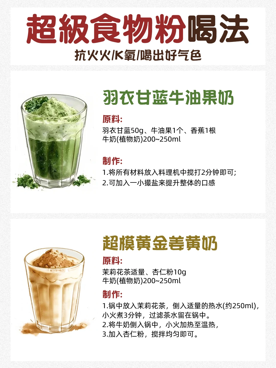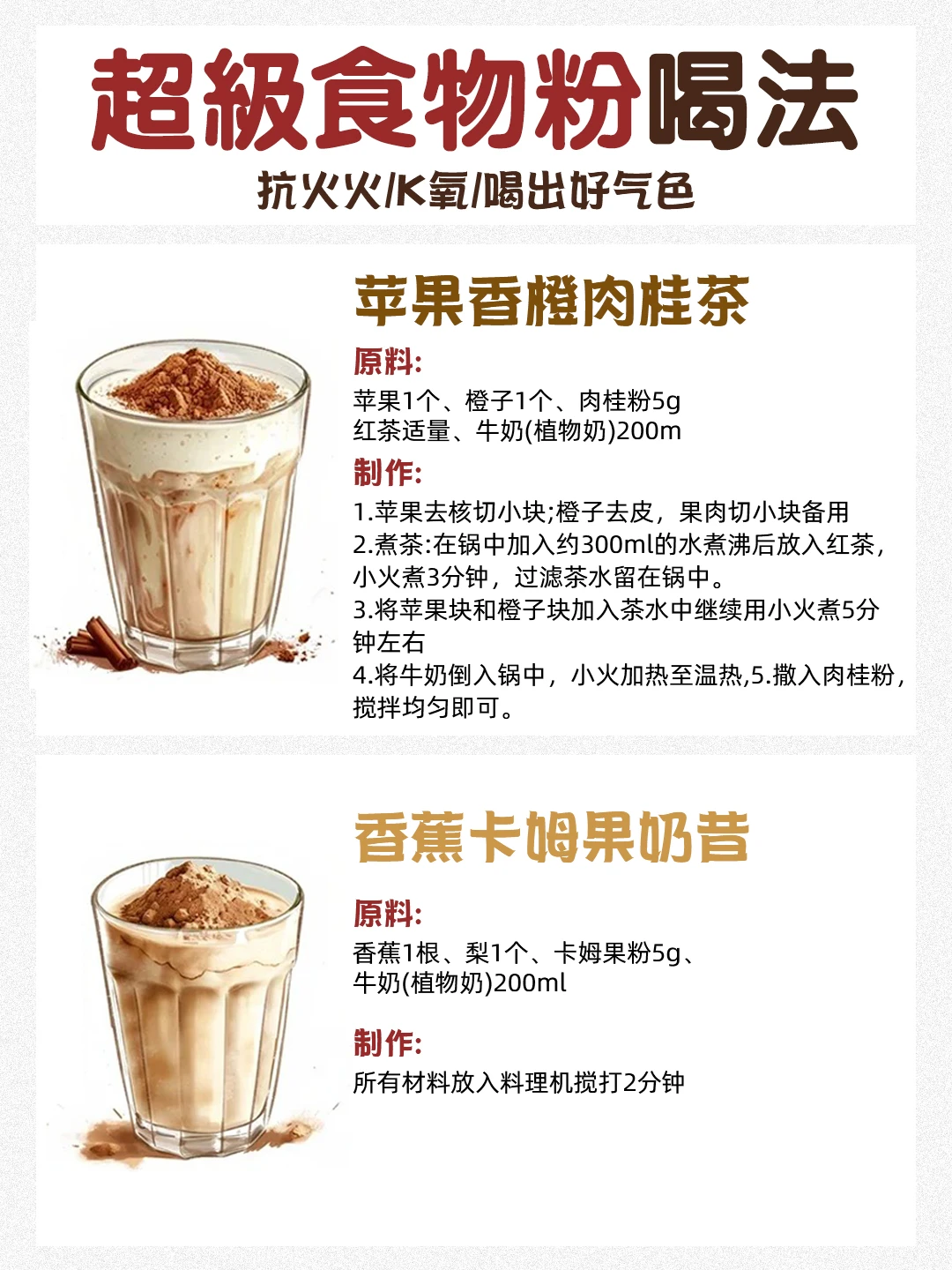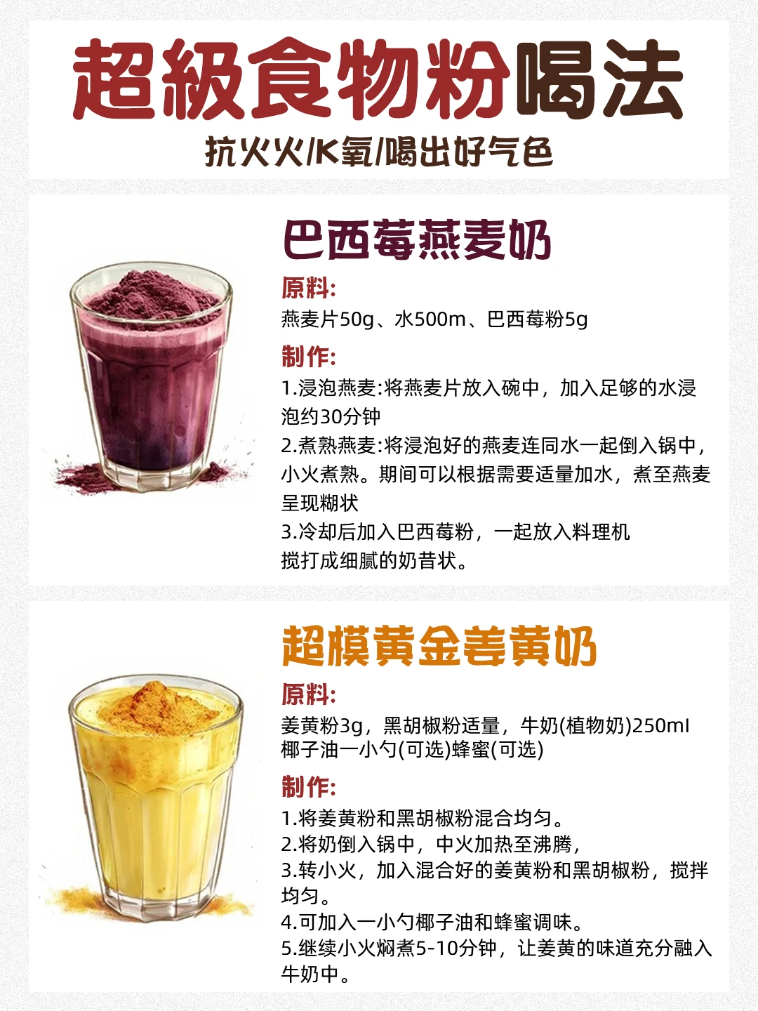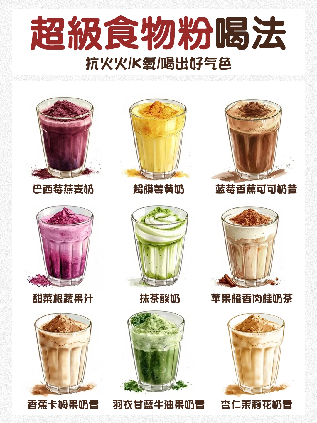 👸🏻喜欢喝奶茶的宝子们把奶茶换成超级粉粉饮品吧! 超简单方便,轻松搞定!健康又好喝!皮肤也越来越好 1️⃣巴西莓燕麦奶 2️⃣超模姜黄奶 3️⃣蓝莓香蕉可可奶昔 4️⃣甜菜根蔬果汁 5️⃣抹茶酸奶 6️⃣苹果橙香肉桂奶茶 7️⃣香蕉卡姆果奶昔 8️⃣羽衣甘蓝牛油果奶昔 9️⃣杏仁茉莉花奶昔