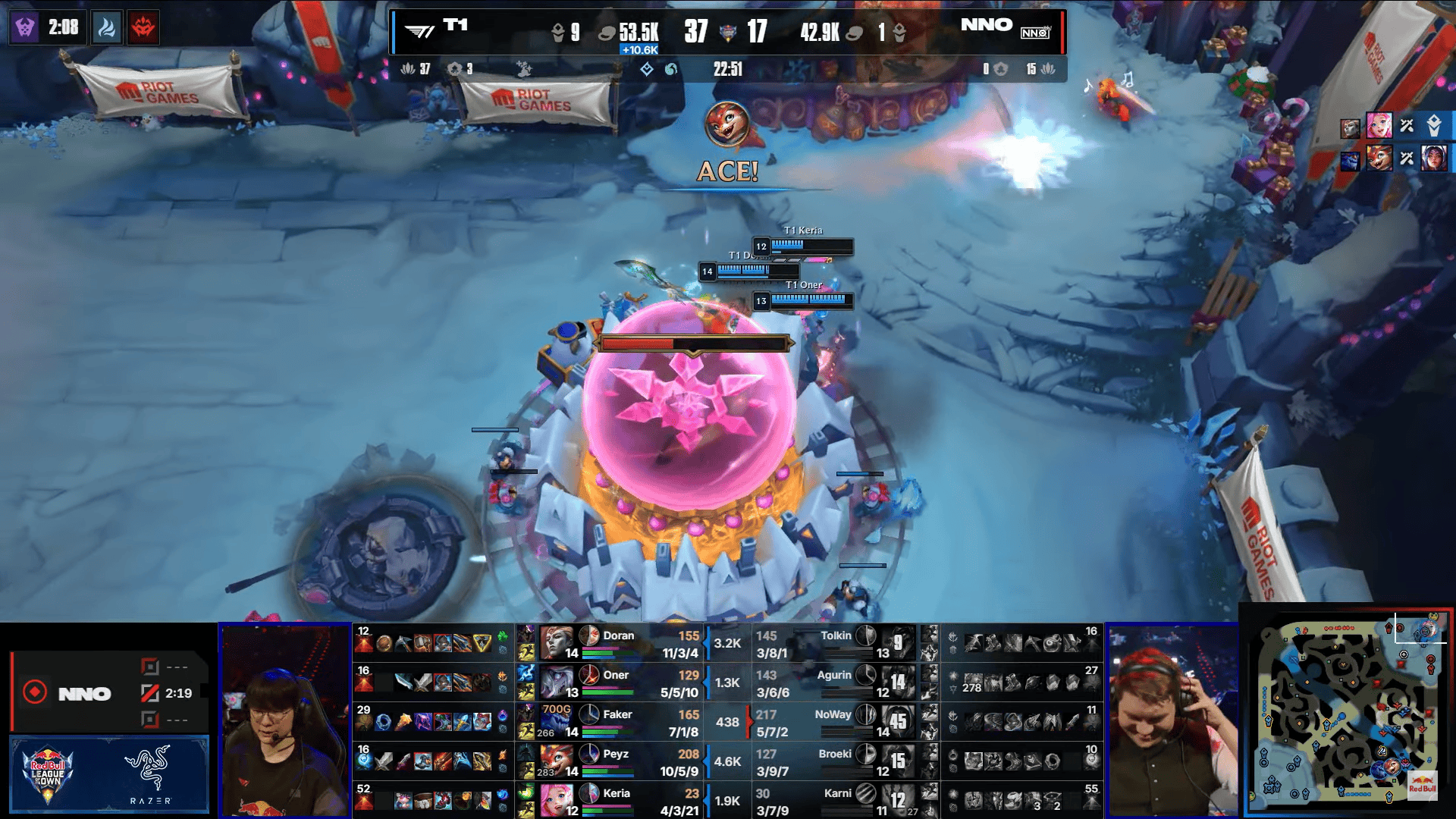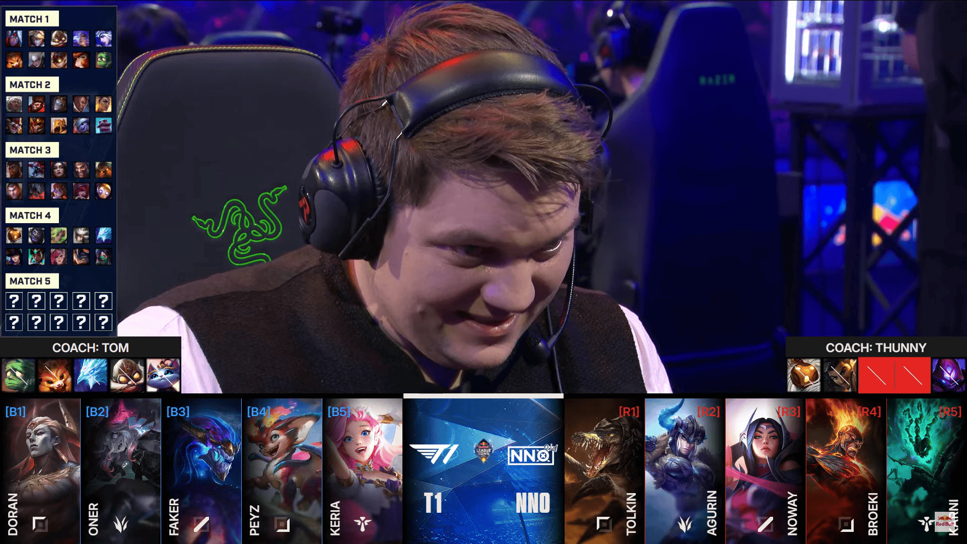 最终NNO教练组在空ban两人后帮T1选出上单亚恒、打野贝蕾亚、中单龙王、下路斯莫德、辅助萨勒芬妮的阵容。而T1最终轻松取胜。