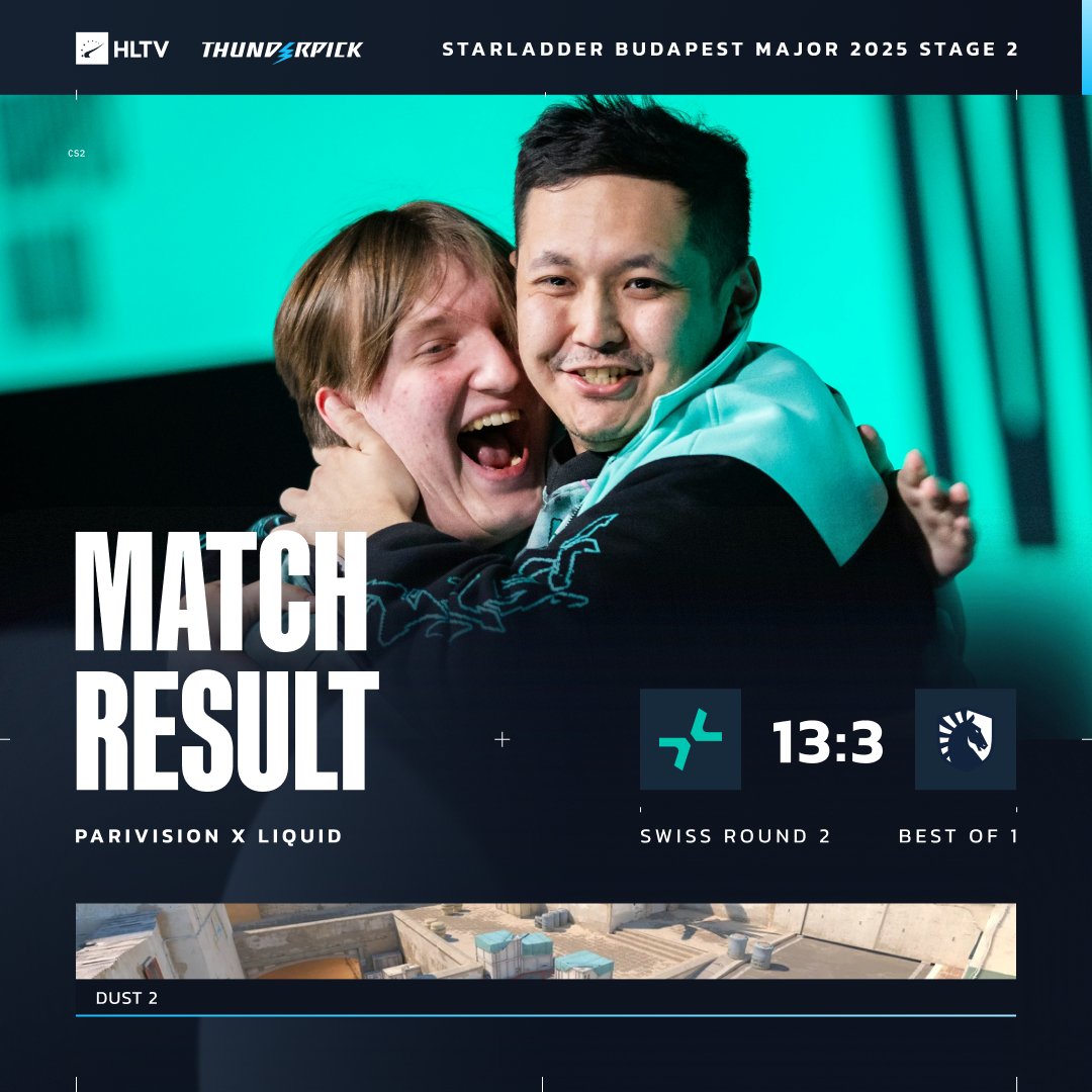虎扑11月30日讯StarLadder布达佩斯Major第二阶段瑞士轮小组赛次轮0-1组BO1:PARIVISION对阵Liquid