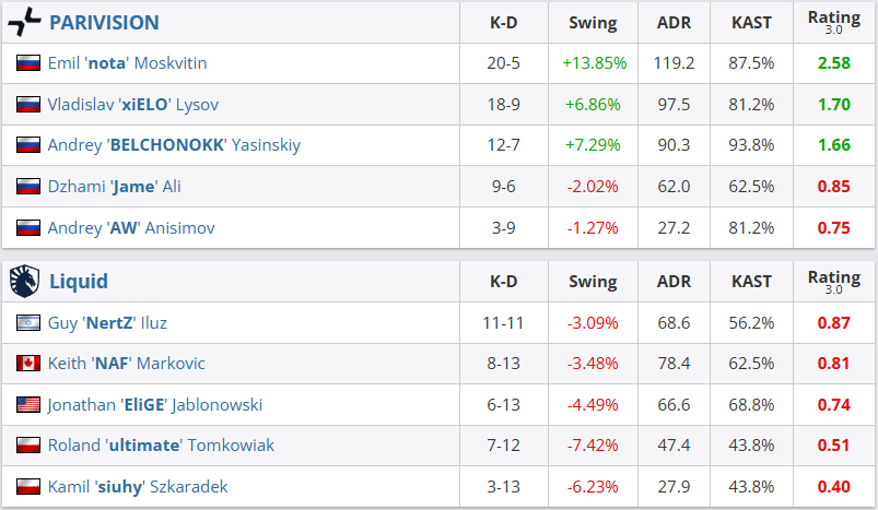 本场比赛地图来到Dust2,PV先做进攻方,凭借nota的超神突破发挥,上半场便攻下10分,随后下半场轻松带走,以13-3碾压Liquid,将对手打入0-2组,自己则晋级1-1组。