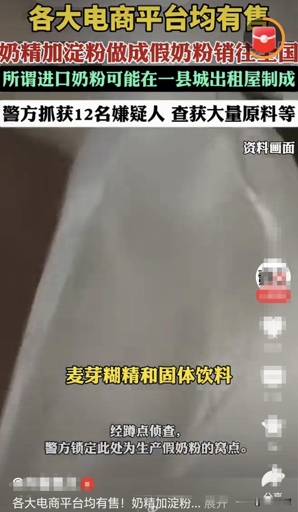 奶精加淀粉竟变“奶粉”!销往全国,良心何在? 偏僻仓库里飘出的浓郁奶香,背后竟是一条触目惊心的假奶粉产业链。近日,河南中牟县警方在城郊一处偏僻仓库内查获一个生产假奶粉的窝点,现场抓获12名嫌疑人。这些所谓的“奶粉”竟然是用奶精加淀粉混合而成,通过各大电商平台销往全国各地。这已不是首次发现制假奶粉行为。不法分子用动物毛皮经盐酸水解的动物蛋白掺入淀粉冒充奶粉;用猪油代替亚油酸,掺入牛油增加奶粉味觉。他们还将同一配方生产的普通奶粉,经过包装冒充婴幼儿配方奶粉销售。 01 假冒伪劣,屡禁不止 在黑心商家眼中,孩子的健康远不及利益重要。这些制假者利用家长对奶粉质量的重视,专门仿冒知名品牌。有人设立“黑作坊”,生产伪劣产品冒充“俄罗斯老式奶粉”等进口奶粉,通过网络销售。还有不法分子在含乳饮料标识上玩起花样,故意放大“乳”、“奶”等字体,同时极力缩小“饮料”二字,明目张胆地欺骗消费者。更令人愤慨的是,一些被查处取缔的企业,改头换面重新注册新公司,由原制假者幕后操纵继续造假。 02 监管出击,严惩不贷 面对奶粉制假行为,监管部门已经出手。 食品药品监管总局明确表示,冒牌婴幼儿乳粉一经发现,不论质量是否合格,必须立即扣缴、一律销毁。各地法院也对危害食品安全犯罪从重惩处。原阳县法院审理的一起生产、销售伪劣“进口奶粉”案中,主犯张某彦被判处有期徒刑八年六个月。 安徽铜陵市一名制假售假假冒俄罗斯进口奶粉的被告人也被判处有期徒刑,并被迫支付三倍公益损害赔偿金。 03 消费提醒,防范有招 为避免购买到假奶粉,消费者需通过正规渠道、正规店铺购买,并认真查看产品标签,不贪图便宜。发现婴幼儿配方奶粉产品质量问题后,应及时向各地12365热线投诉。“奶粉”二字背后,是孩子的健康与未来,任何对其动手的黑心商贩,都不该被原谅。监管部门持续打击的同时,我们作为消费者也要擦亮眼睛,共同筑牢食品安全防线,让假冒伪劣食品无处藏身。 假奶粉制造者将淀粉和奶精混合灌装,在黑作坊里炮制出“名牌奶粉”,通过电商平台堂而皇之地流入无数家庭。 这些缺乏婴幼儿发育必需营养素的假货,直接威胁婴儿的健康与生命。 面对如此丧尽天良的行为,唯有严惩不贷,才能守护好孩子们的健康成长。