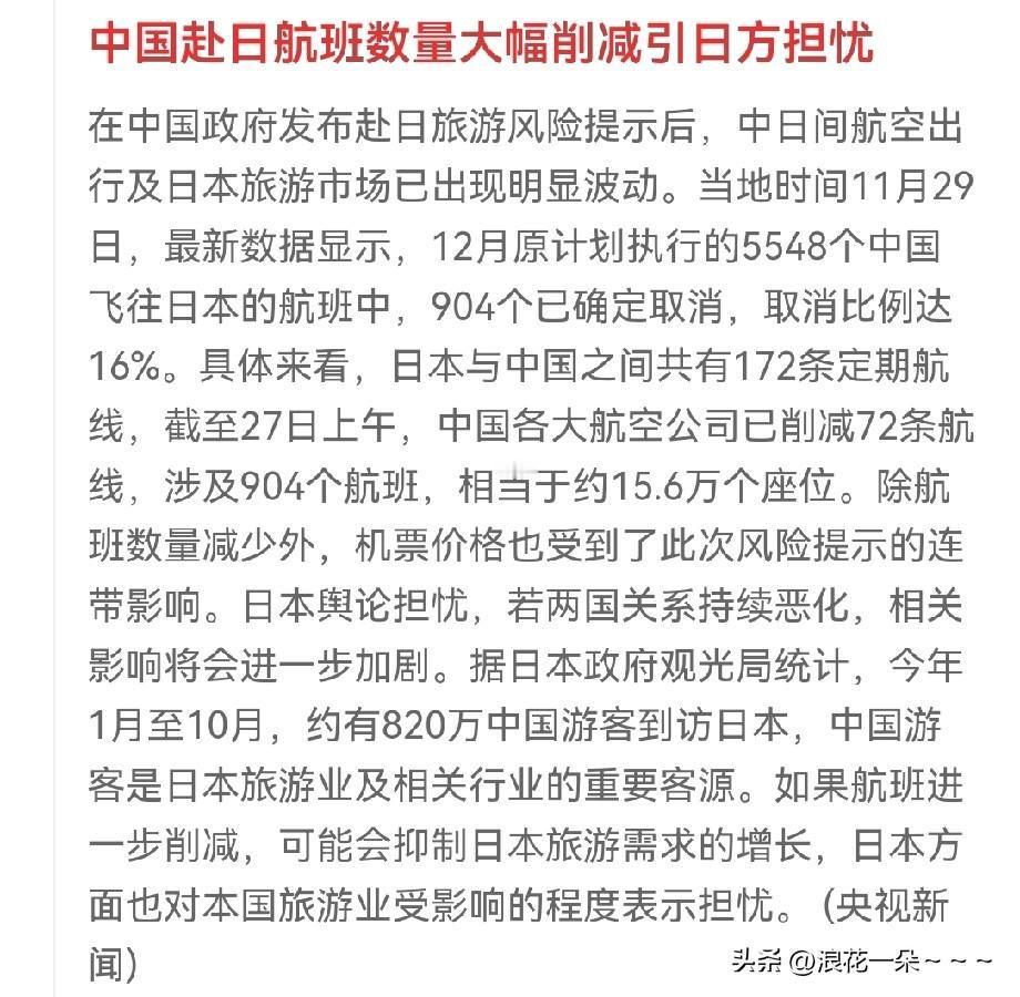 刚刚看了央视新闻,我看对“小本子”的反制措施还多着呢,看看这12月份的航班数量,目前904个已经取消,但是,按照12月份这个飞行计划一共有5548个航班! 这也就才确定取消了1/5左右,我看日本各大旅行社,各大酒店,各大奢侈品消费市场已经哭天喊地的受不了了。 当然,从目前各大媒体报道的信息来看,我觉得日本政客特别是高市早苗本人悔改错误的态度并不怎么样! 甚至我看到,有媒体说,大阪府议会于11月28日一致通过了一个决议,再次要求薛剑道歉。 所以说,就日本这种态度,接下来估计在航班飞行数量少可能还会减少,这就好比温水煮青蛙,不急不缓的给他们上眼药啊[捂脸]