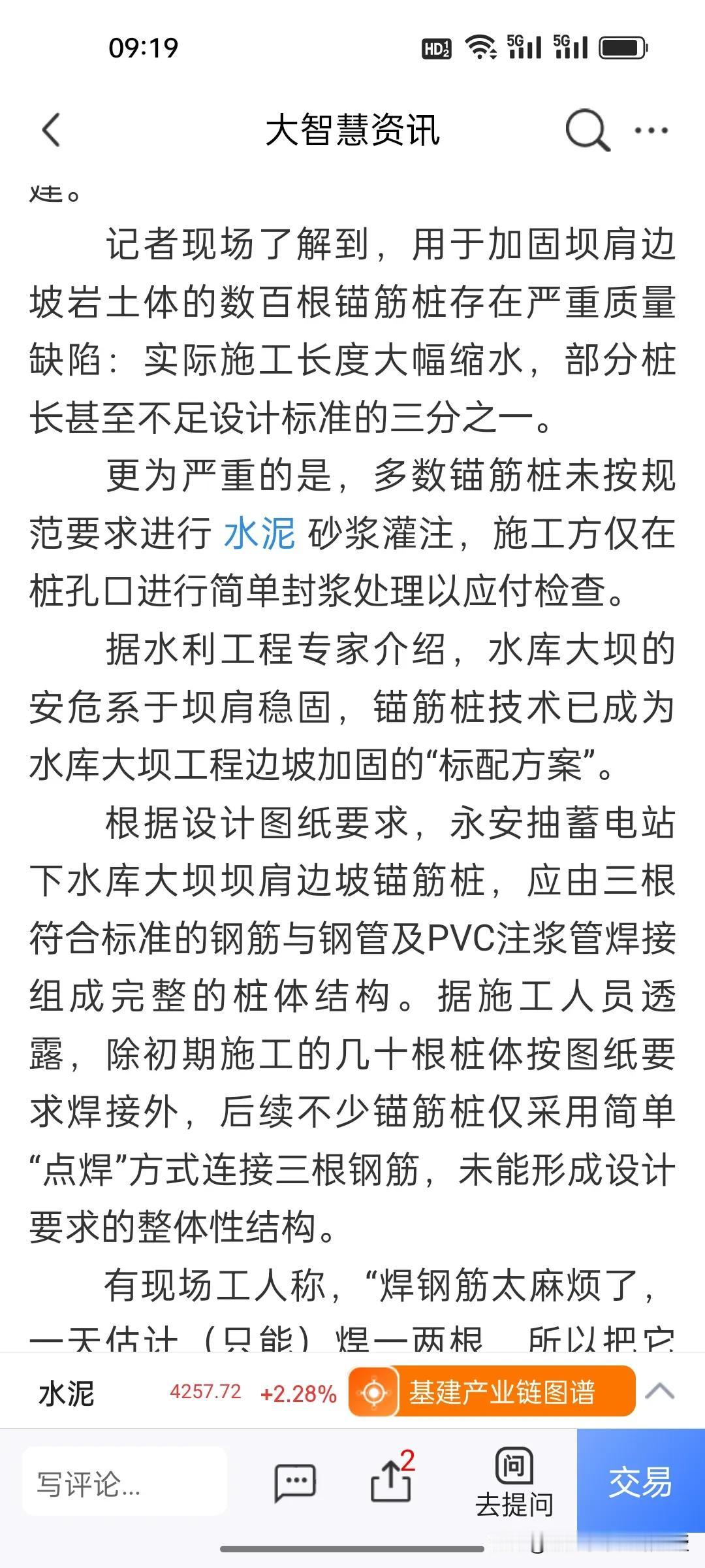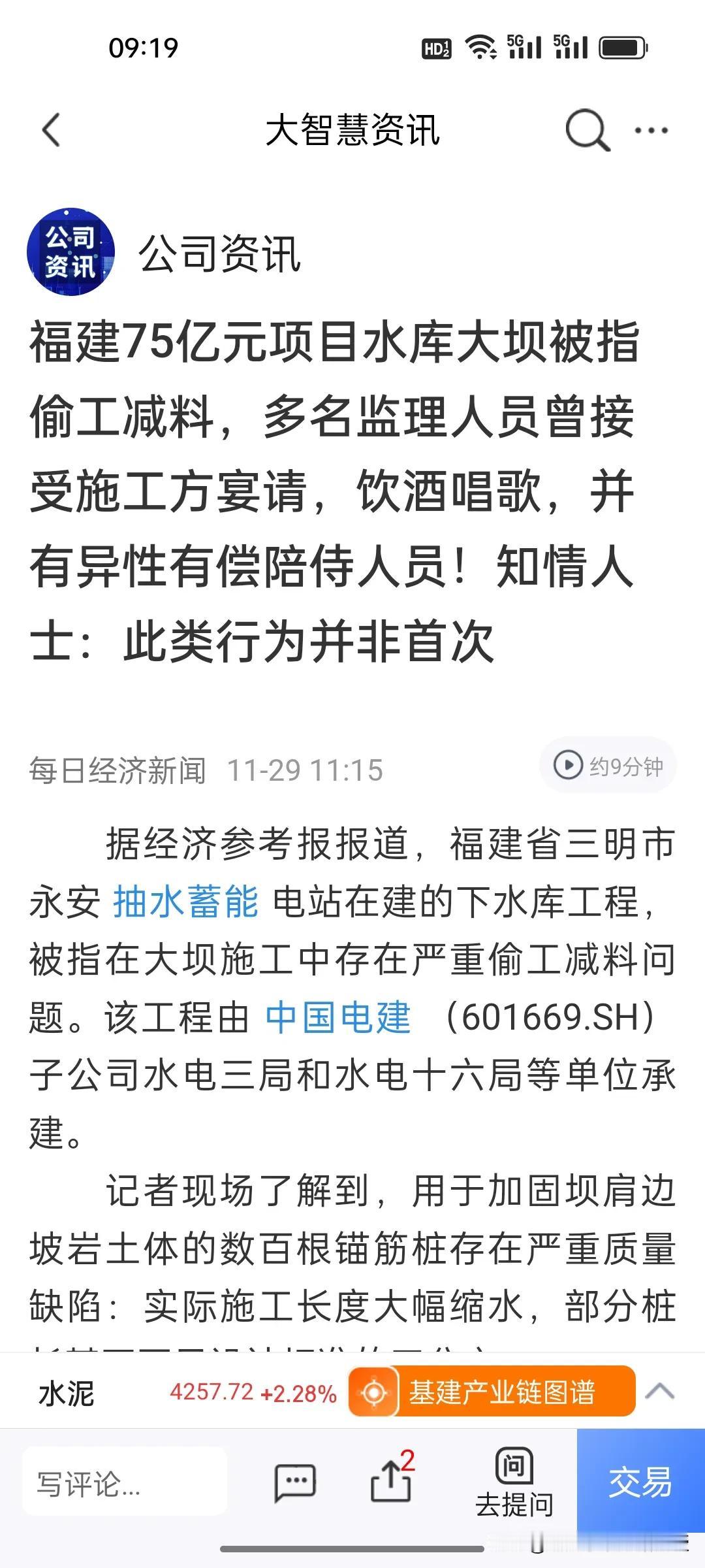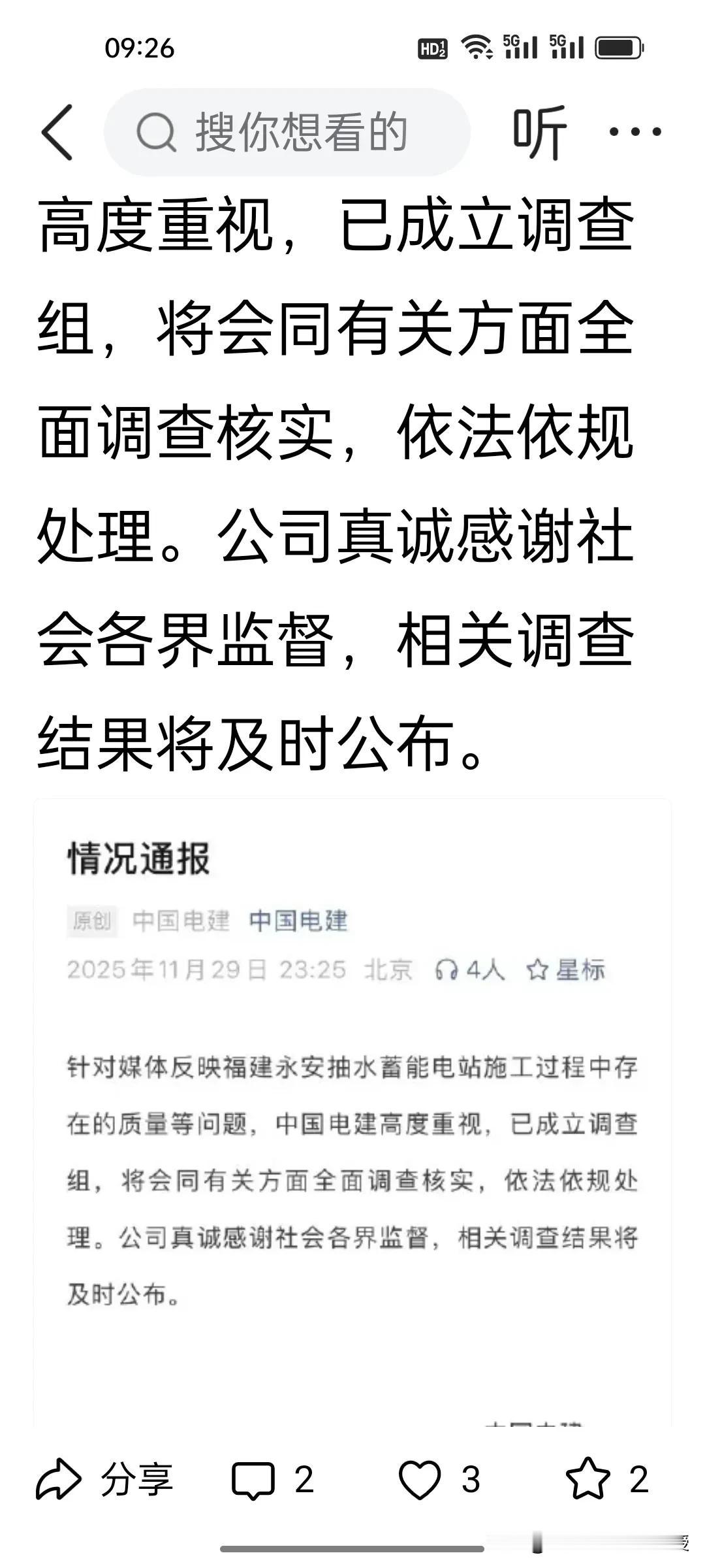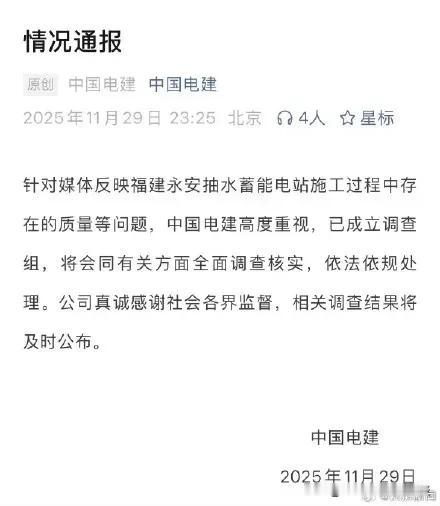 中国电建还是听劝的!昨天下午我发文建议中国电建要成立调查组,昨晚11点半中国电建就发了成立调查组的通知,还感谢社会各界监督,调查结果将及时公布。这就是中字头企业应有的坦诚态度。 此次被《经济参考报》记者发现75亿福建水电站偷工减料的是水电三局和水电十六局承建的,近期中国电建在海外也签了七个项目,建议中国电建要成立专项工作组,对国内外在建项目都要核查是否涉嫌贪腐以及偷工减料,毕竟这些都是民生大工程,不能总让媒体记者当“吹哨人”,要是国外项目也有这样的情况,那么对中国的国际信誉、“一带一路”合作口碑与央企责任形象都将造成难以挽回的损害。