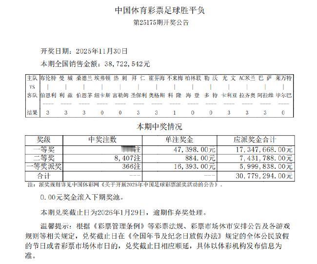 柏林联合爆5倍冷负 足彩派奖头奖366注63791元   北京时间11月30日,足彩第25175期开奖结果揭晓。足彩派奖头奖开出366注,单注奖金47398元,本期600万派奖奖金全部派完,每注多得16393元,单注共计63791元。二等奖开出8407注884元。任九开出44474注374元,因派奖每注可多得134元,单注共计508元。本期14场销量为38,722,542元,任九投注总额为26,030,618元。