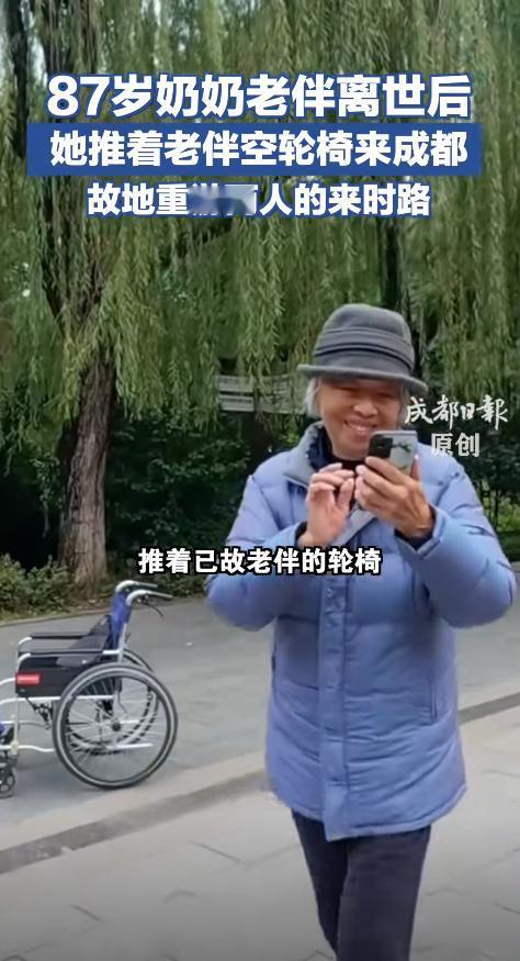 泪目!四川成都,87岁郑奶奶推着已故老伴儿的轮椅,从北京独自来到成都,只为重走和