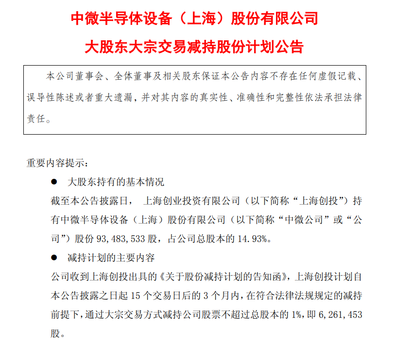 11月30日,中微公司(688012.SH)发布公告,公司收到上海创投出具的《关于股份减持计划的告知函》,上海创投计划自公告披露之日起15个交易日后的3个月内,在符合法律法规规定的减持前提下,通过大宗交易方式减持公司股票不超过总股本的1%,即626.15万股。