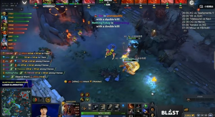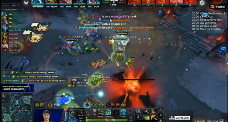 [38分钟]上路野区Tearlaments直接开团,Srf马尔斯BKB切入但是队友跟进不了啊!NTS沙王一个跳大切死后排,XG各个击破,打出0换3之后拆完三路准备一波!Tearlaments想打最后一波但是正面没人扛得住水人输出啊,YSR-04E剧毒倒下之后XG终于过了第一关,将进入play-in对阵Yandex!