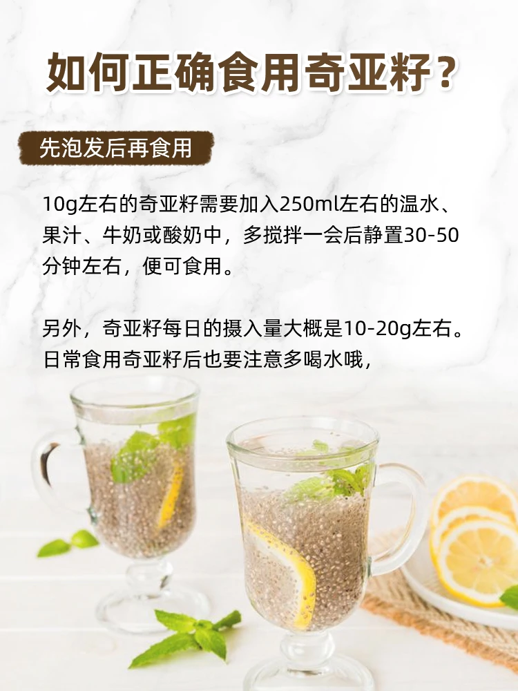 1️⃣0️⃣g左右的奇亚籽需要加入250ml左右的温水、果汁、牛奶或酸奶中,多搅拌一会后静置30-50分钟后,便可食用。食用奇亚籽后也要注意多喝水哦,奇亚籽每日的摄入量大概是1️⃣0️⃣-2️⃣0️⃣g左右。