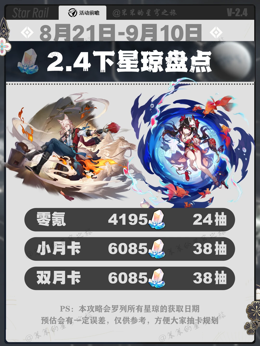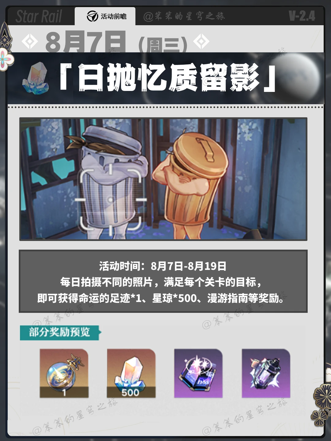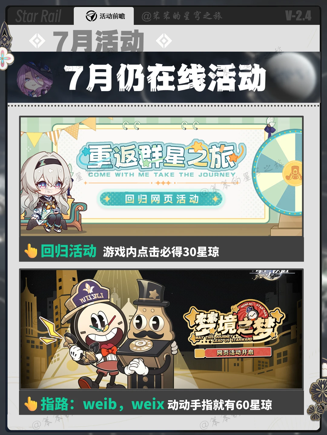 🐱大家好,我是笨笨的铲屎官 今天给大家带来的是8月的崩铁活动汇总 8月份是2.4版本的卡池 最大的活动就是2.4更新 期待再次来到仙舟 给我们带来新的角色和场景 ------------------------------ 👉8月份你最期待什么