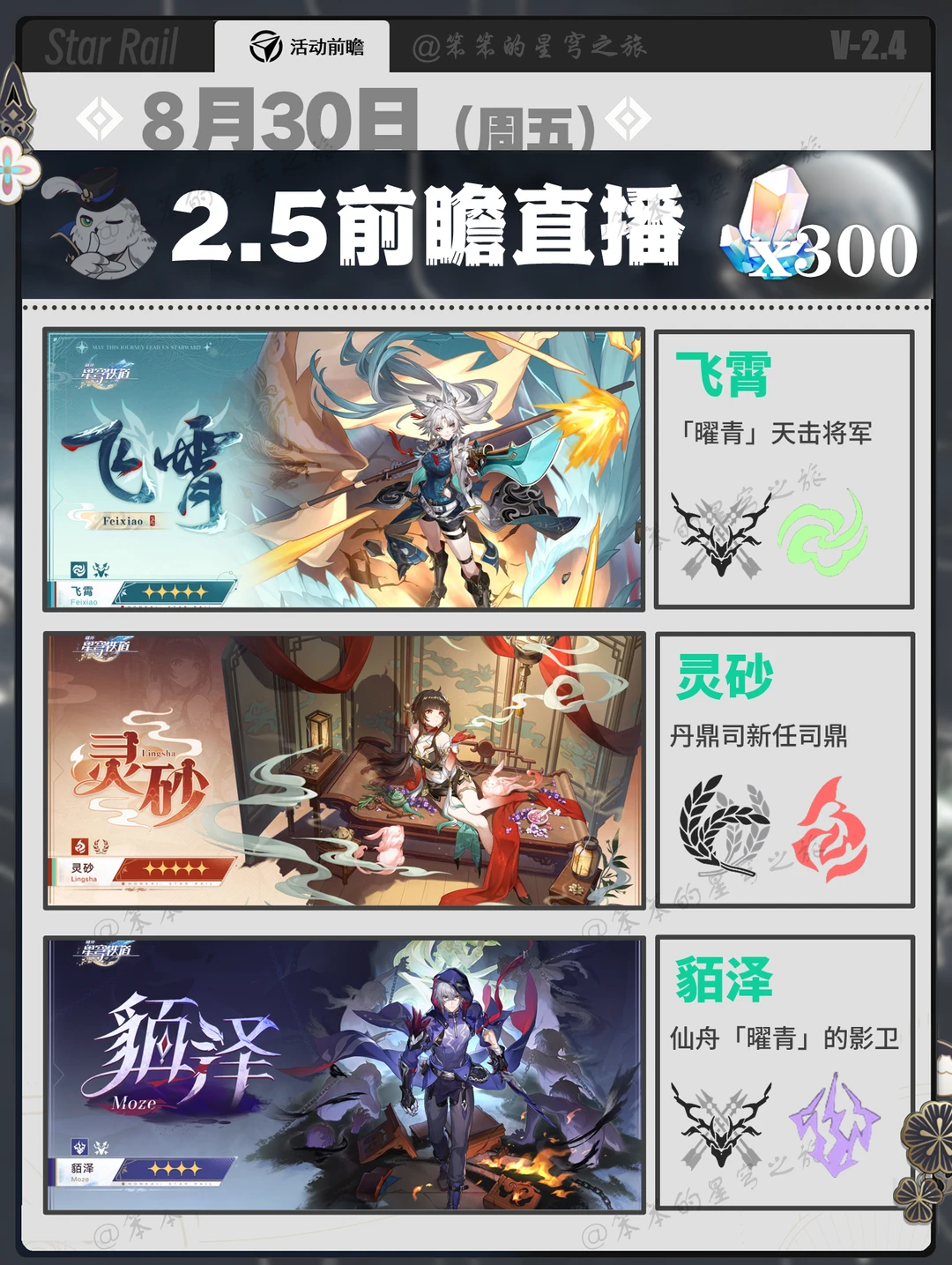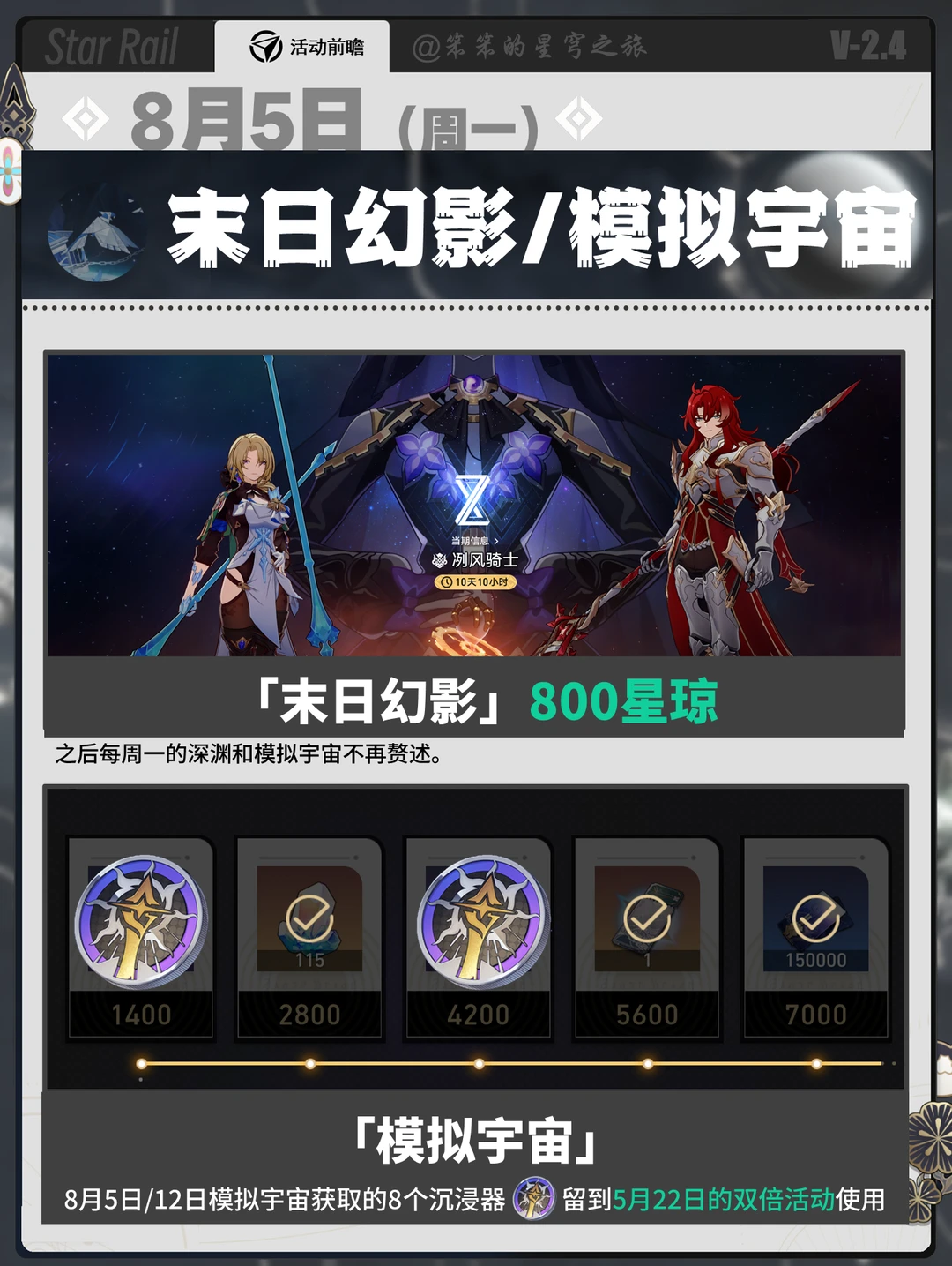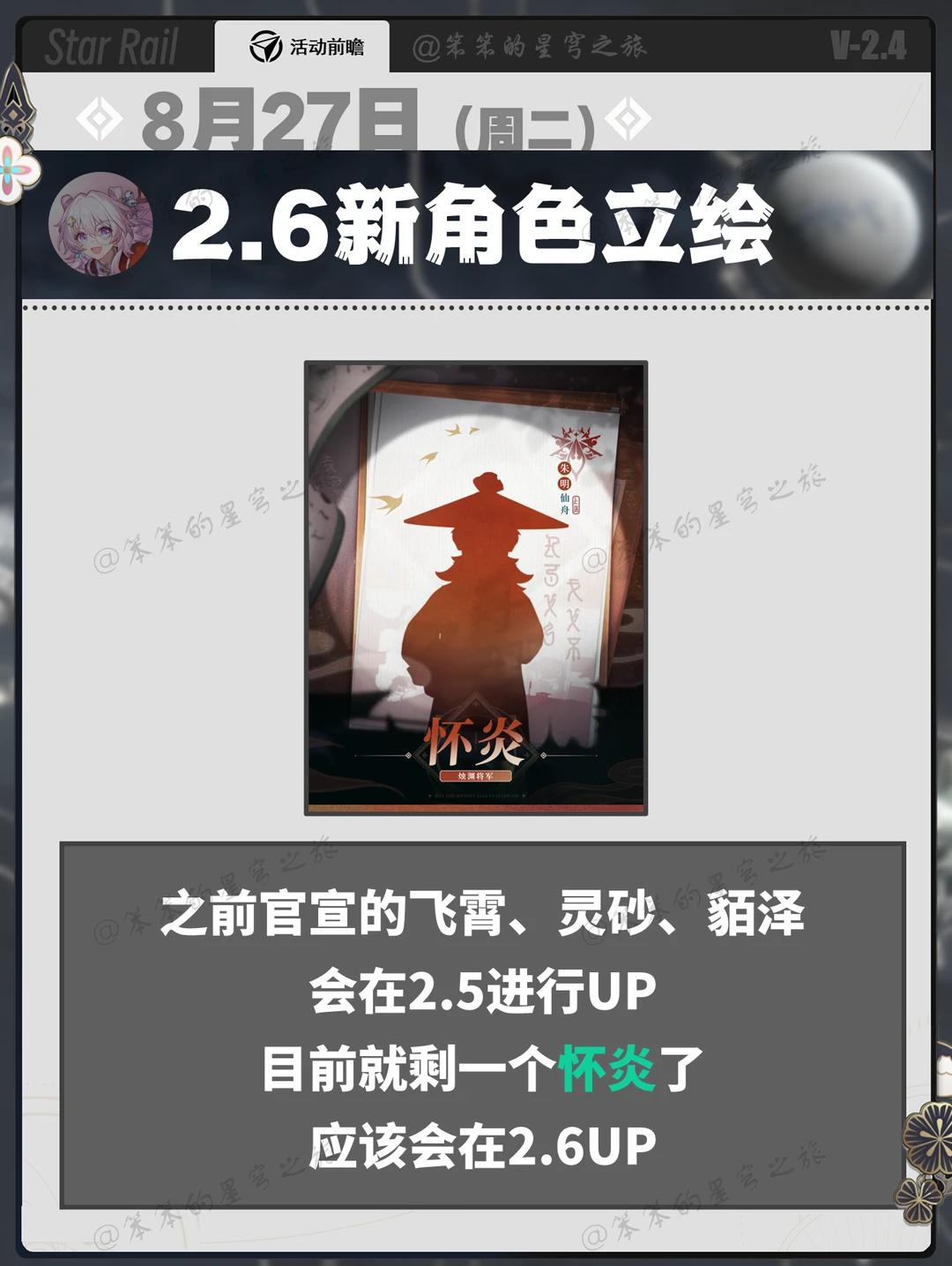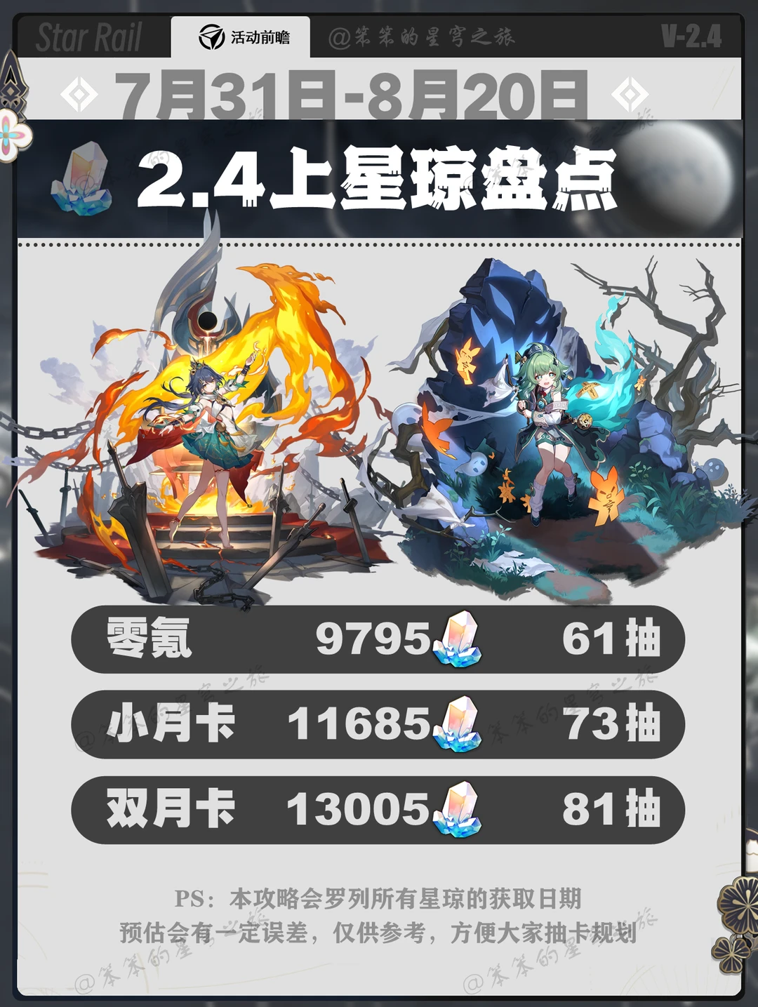 🐱大家好,我是笨笨的铲屎官 今天给大家带来的是8月的崩铁活动汇总 8月份是2.4版本的卡池 最大的活动就是2.4更新 期待再次来到仙舟 给我们带来新的角色和场景 ------------------------------ 👉8月份你最期待什么