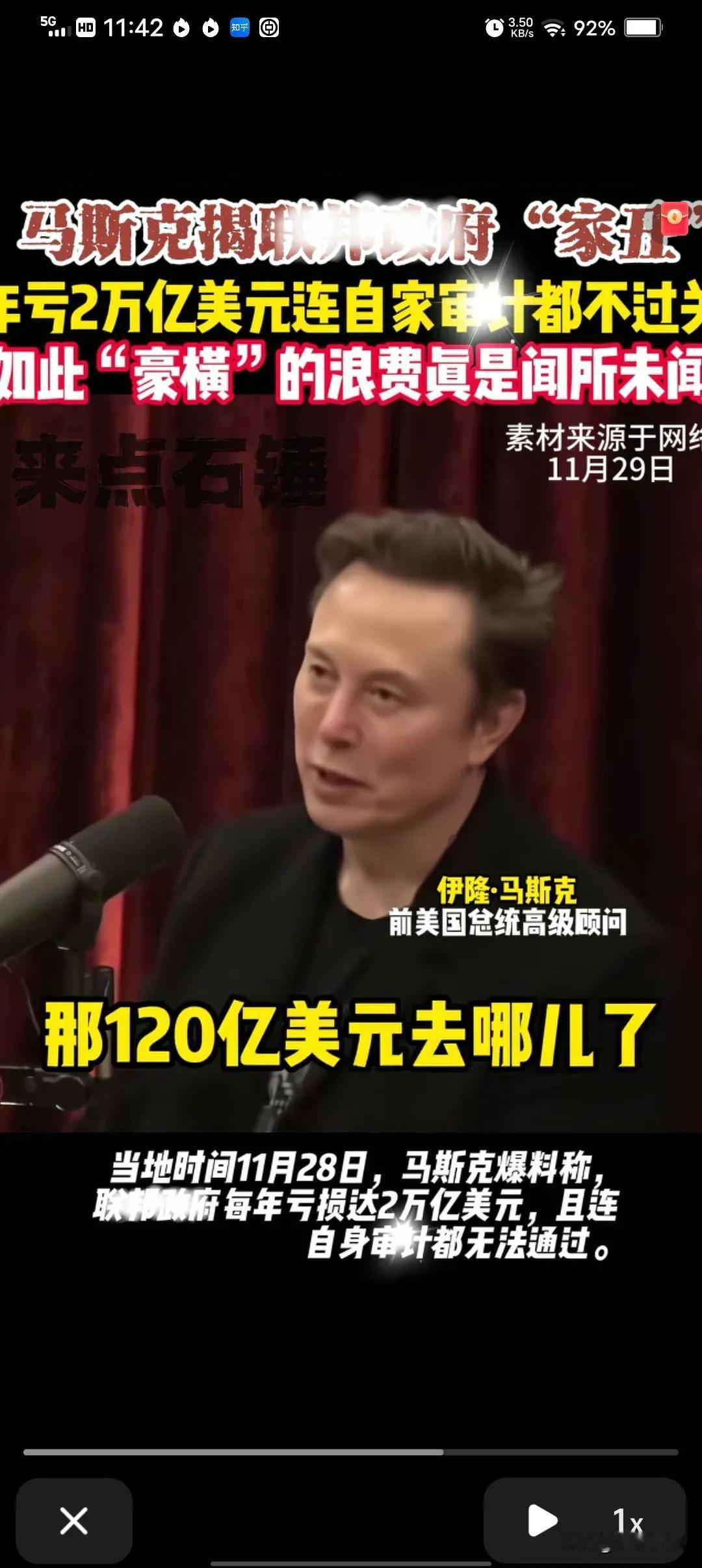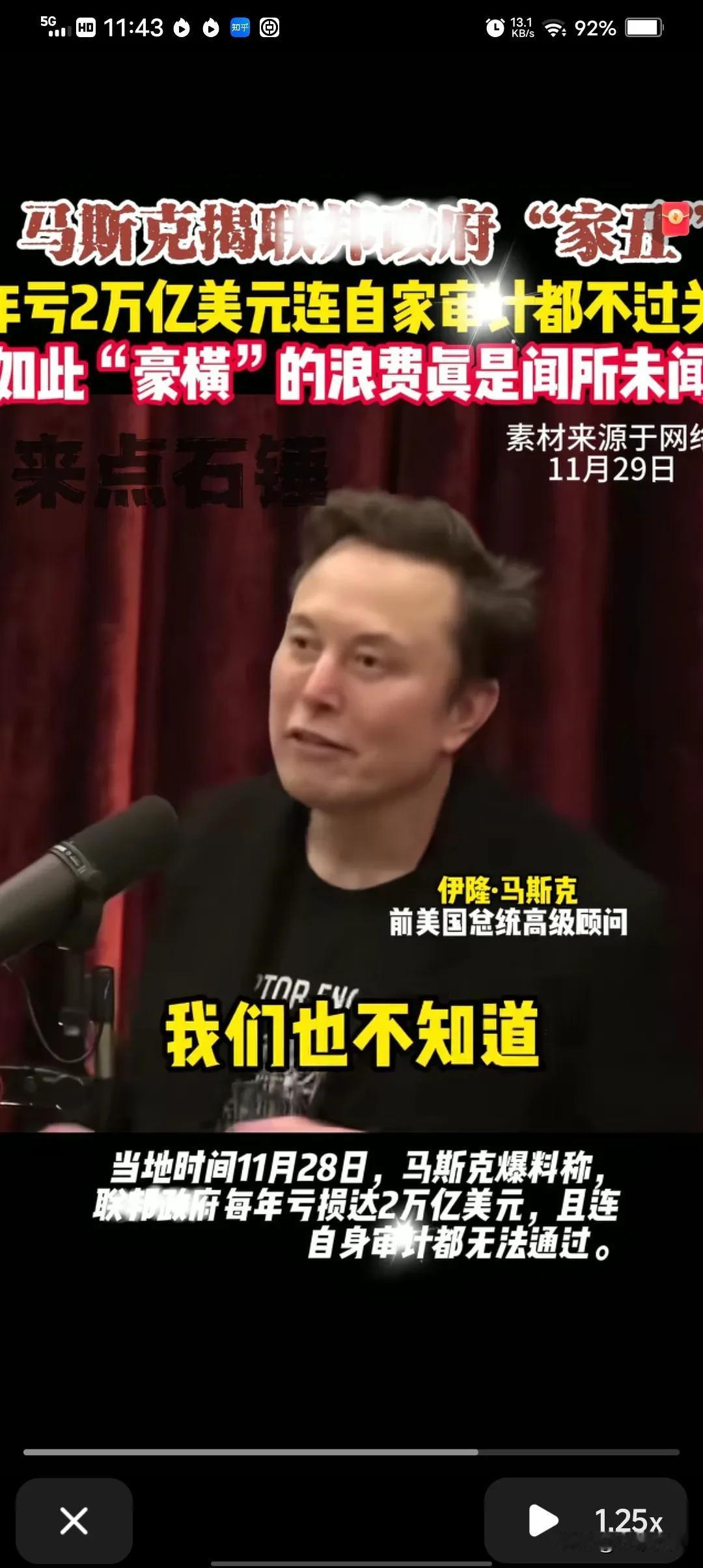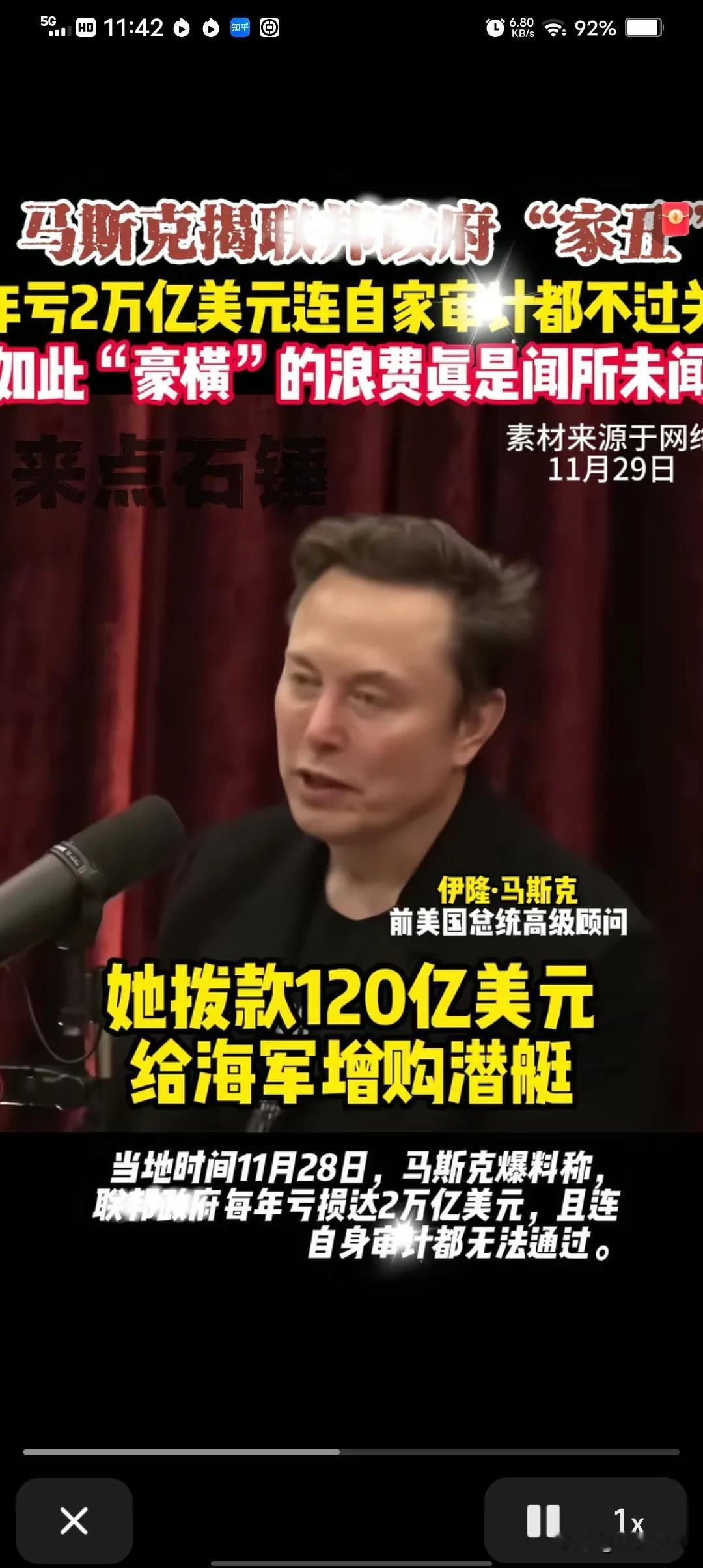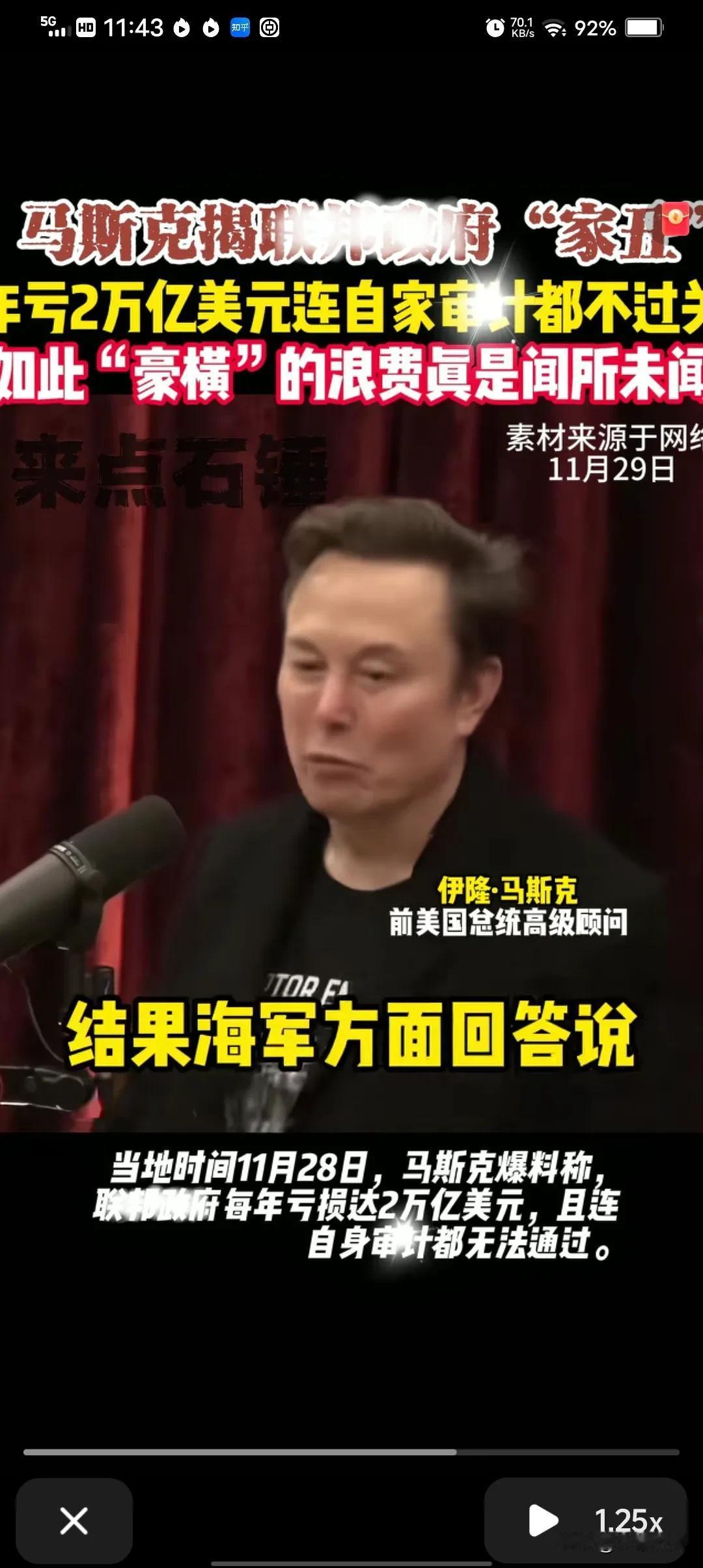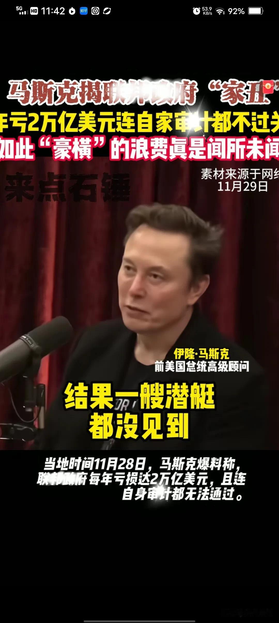 马斯克又揭美国联邦政府的看底,马斯克称美国联邦一年亏空高达2万亿美元,连自家的审计都通过不了,非常离谱,而且联邦政府非常肆无忌惮! 马斯克举了一个例子,就是有个议员组织拨款120亿美元给美军买潜艇,结果120亿美元拨过去了,潜艇一艘都没有看到,议员就组织听证会,问美国海军负责人,潜艇去哪了,美国海军负责人直接回答自己也不知道去哪了! 其实马斯克为什么帮川普查贪,最后查不下去了,其实就是查到五角大楼头上了,这里面的关系连川普都不敢得罪,马斯克根本就没有那个能力查得动,一年近万亿美元的军费,结果一年下水才几艘军舰,估计史密斯专员都不知道钱被谁拿走了!